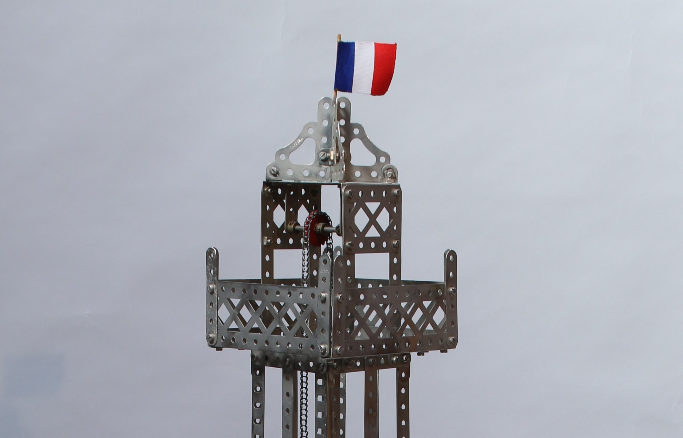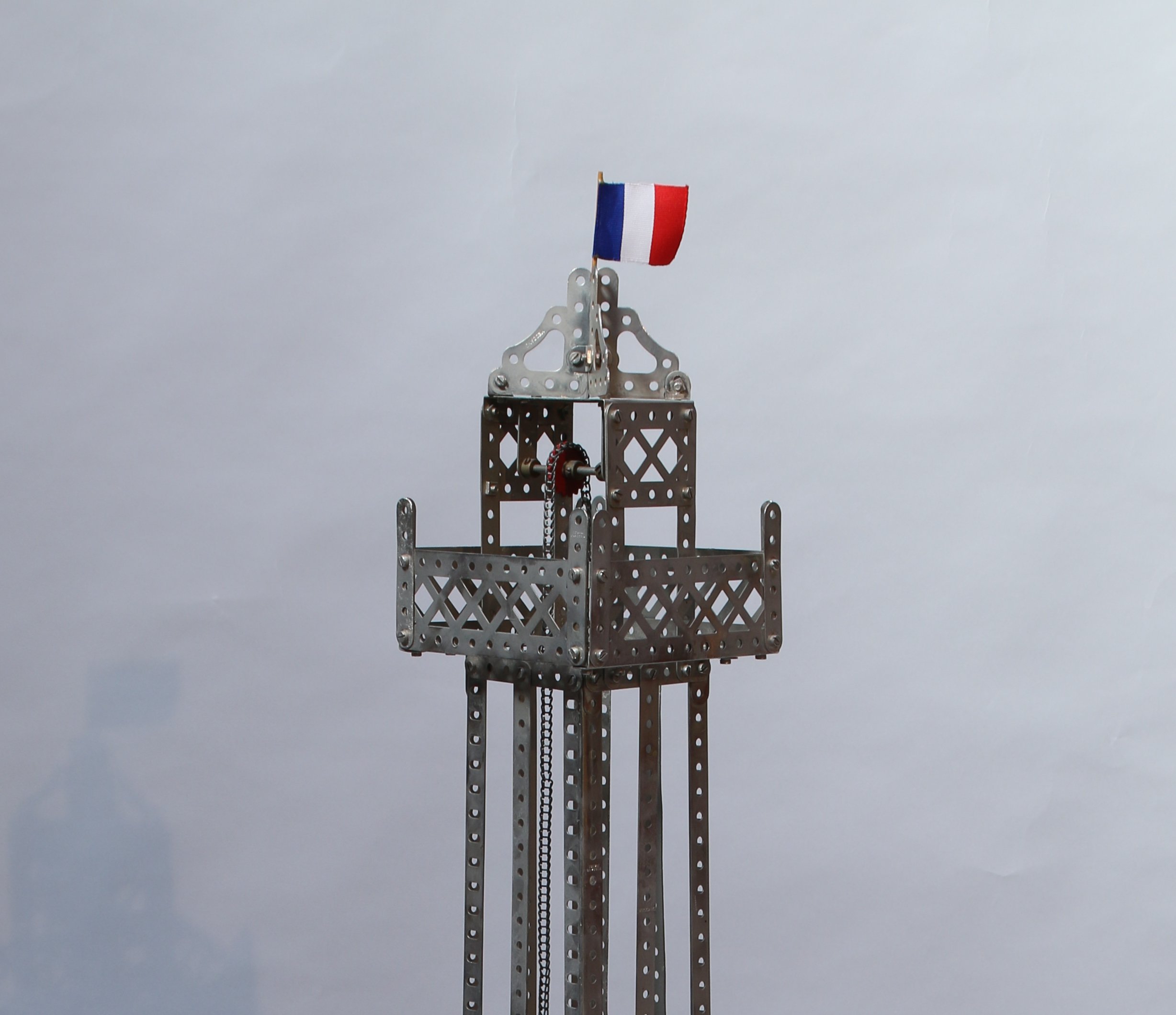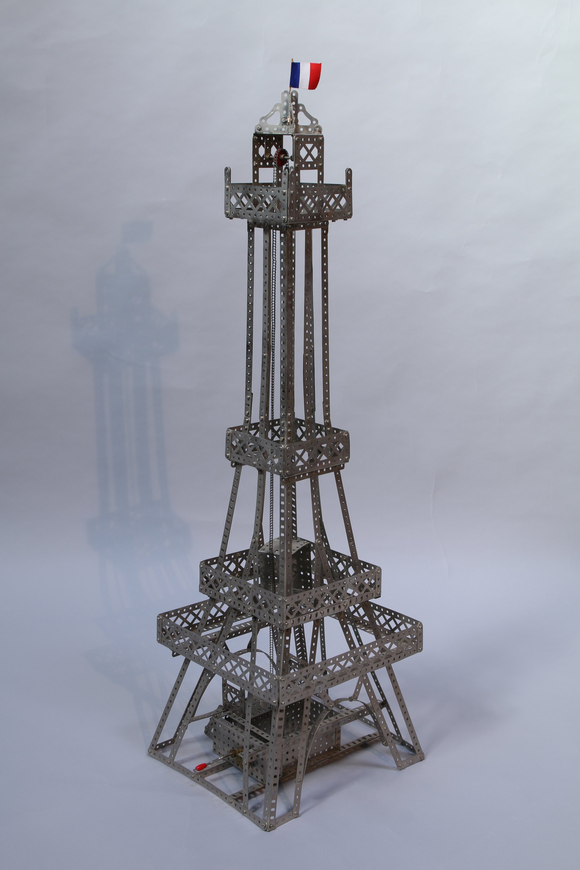 MECCANO. TOUR EIFFEL en nickel dotée d'un ascenseur à chaîne actionné par un mécanisme à manivelle (grippé).