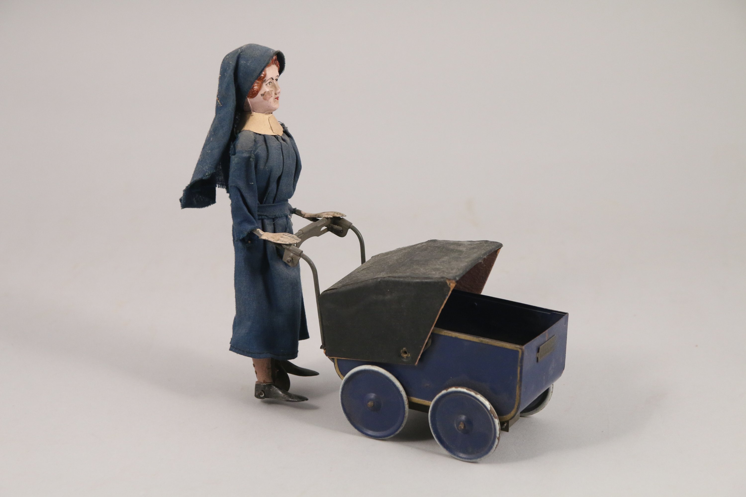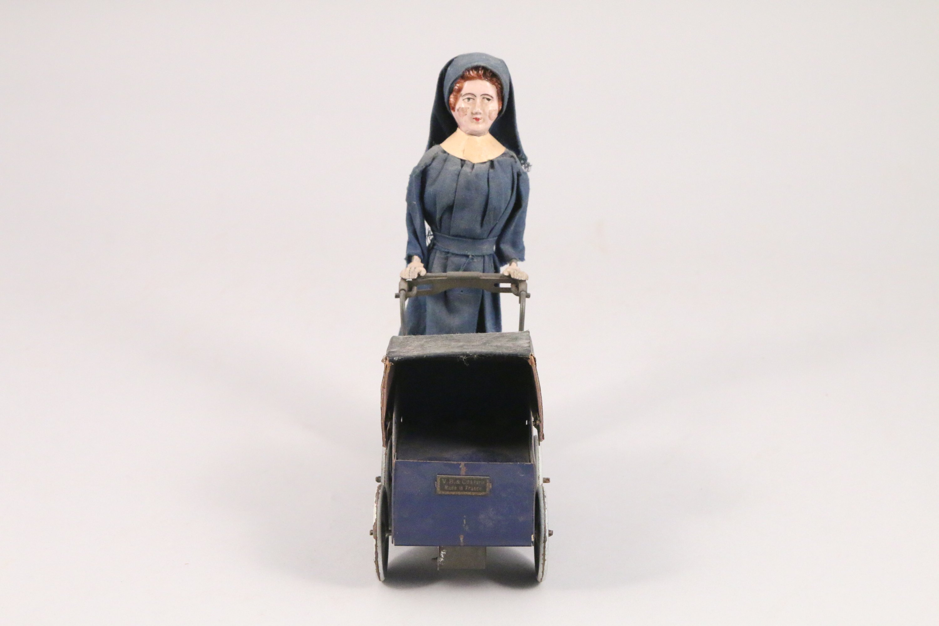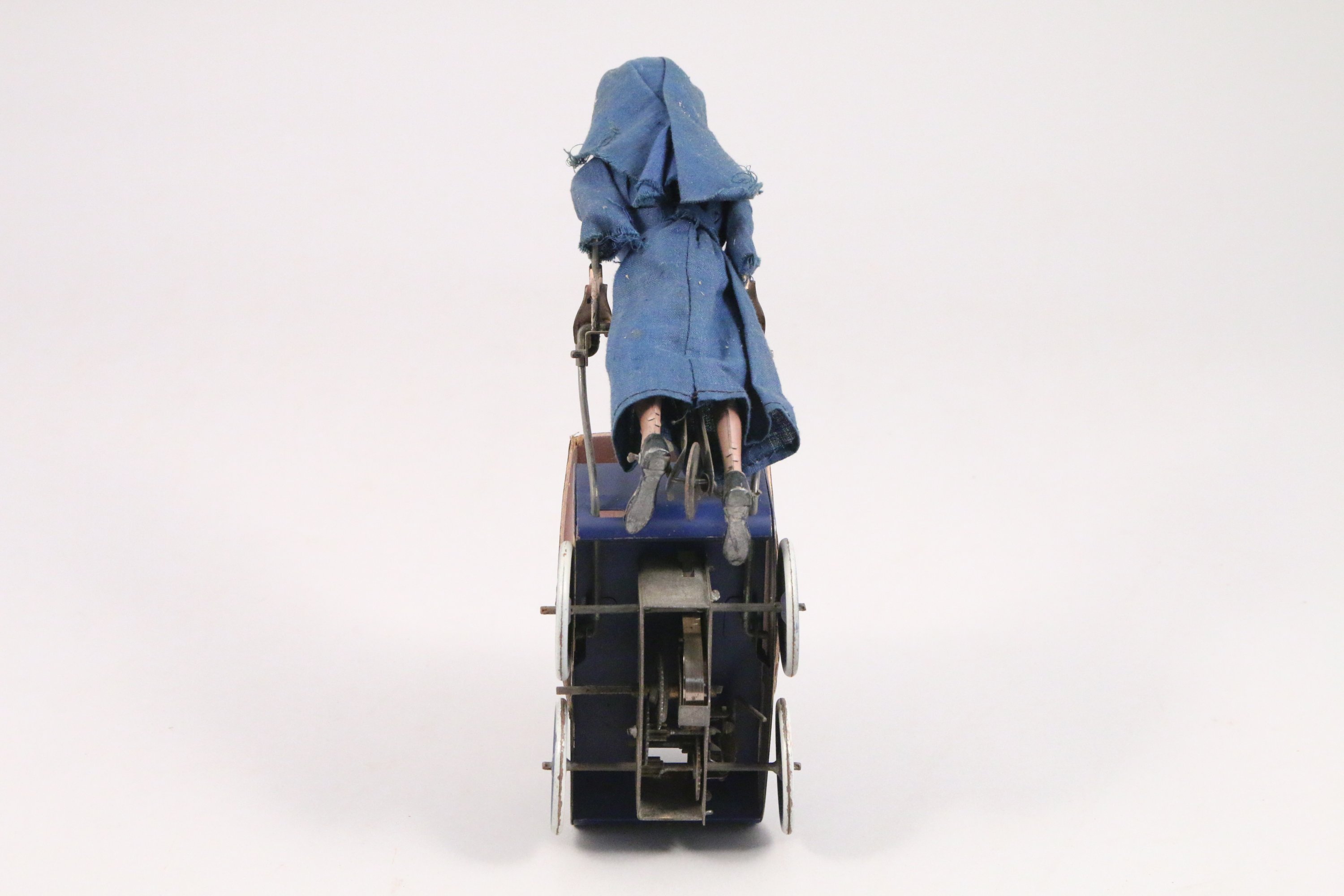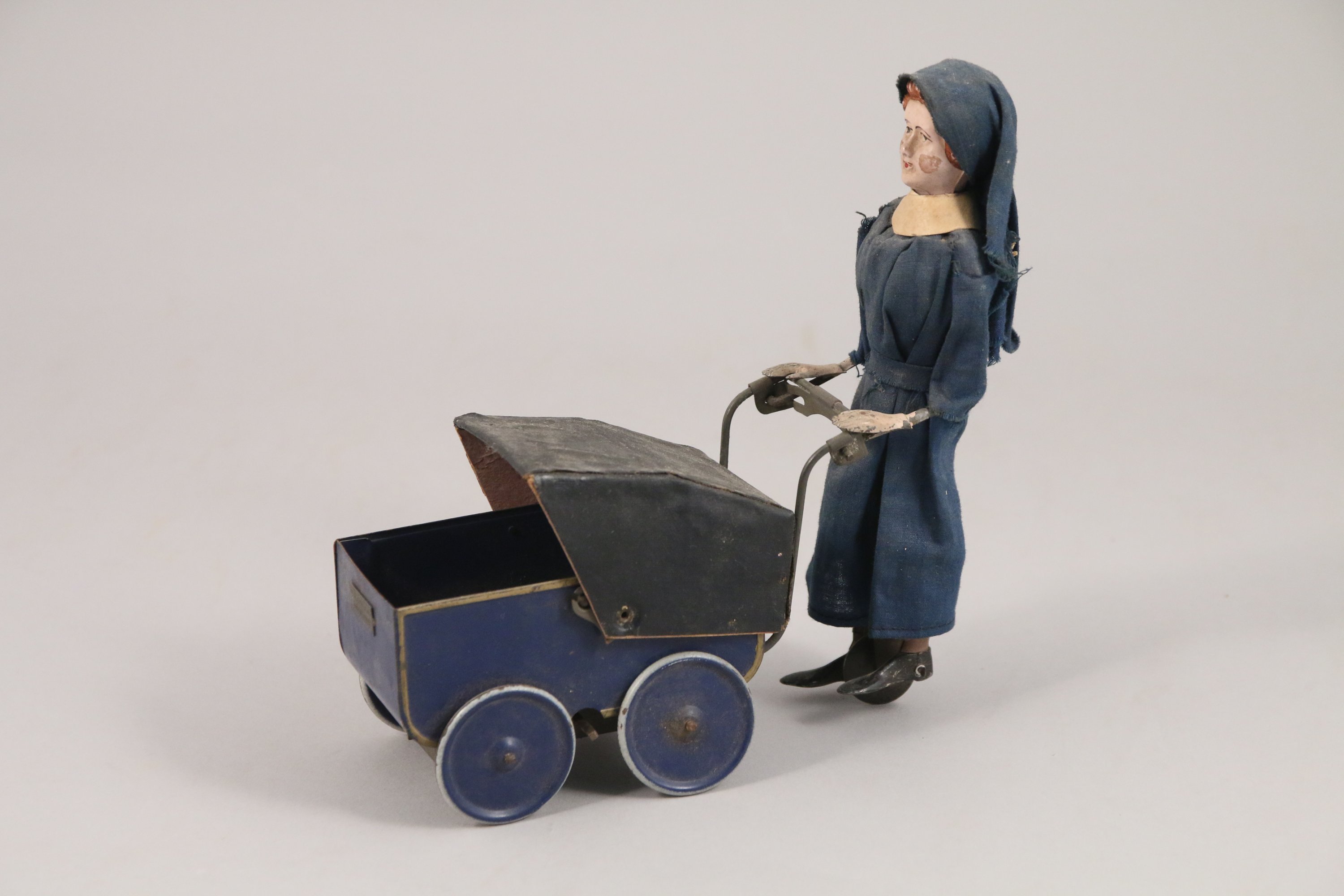 Landau en tôle peinte en bleu, capote en carton, personnage articulé en tôle peinte.