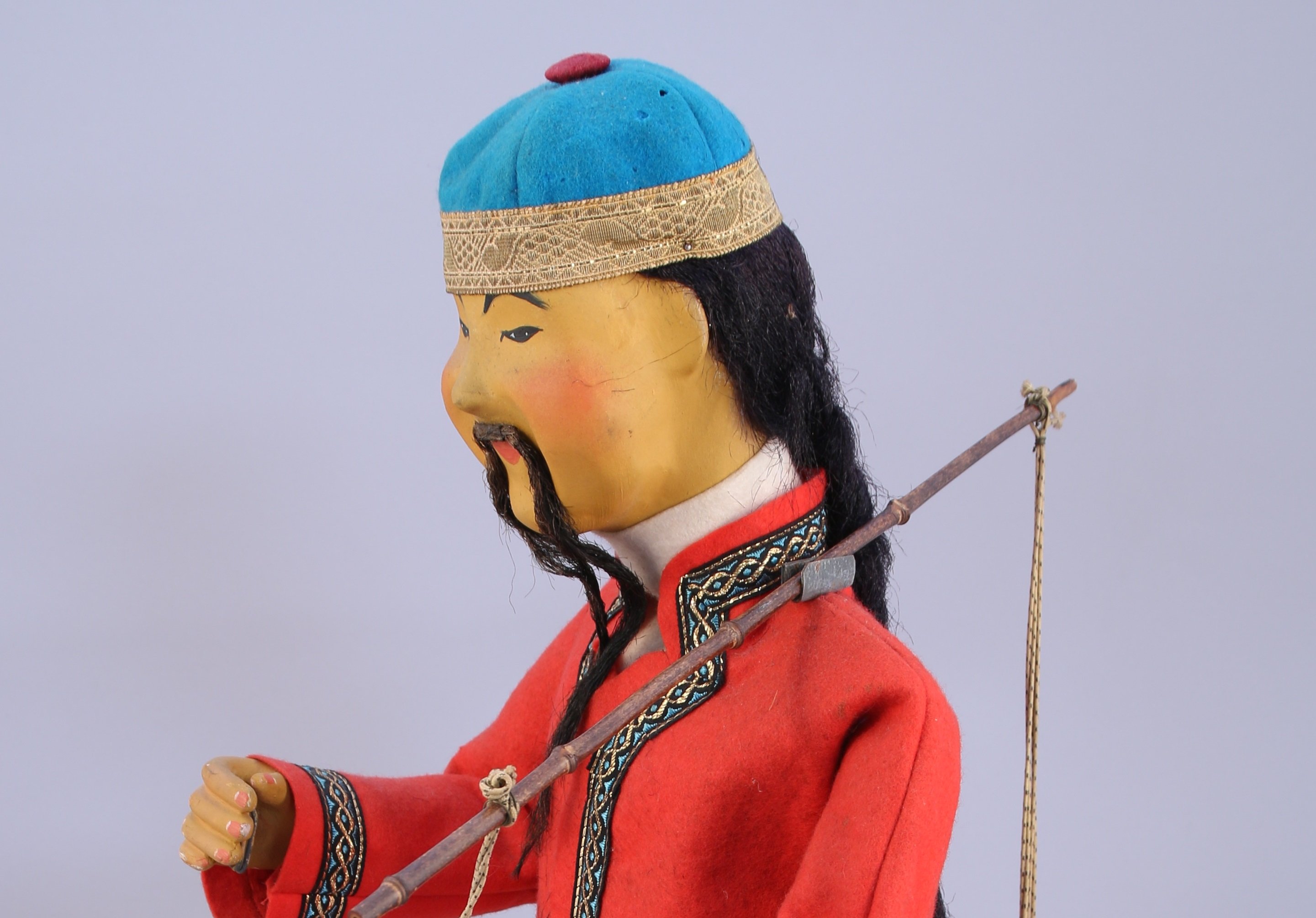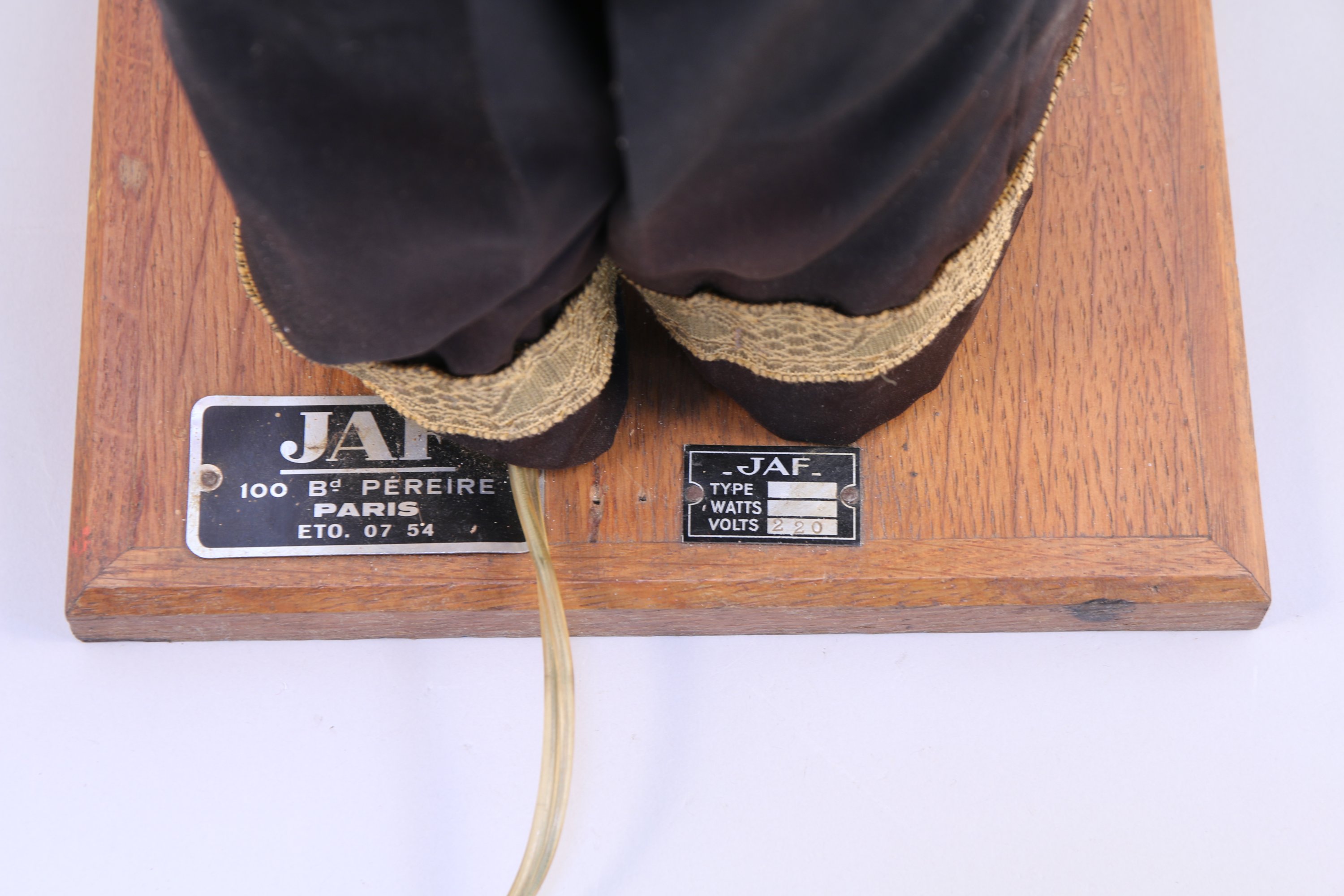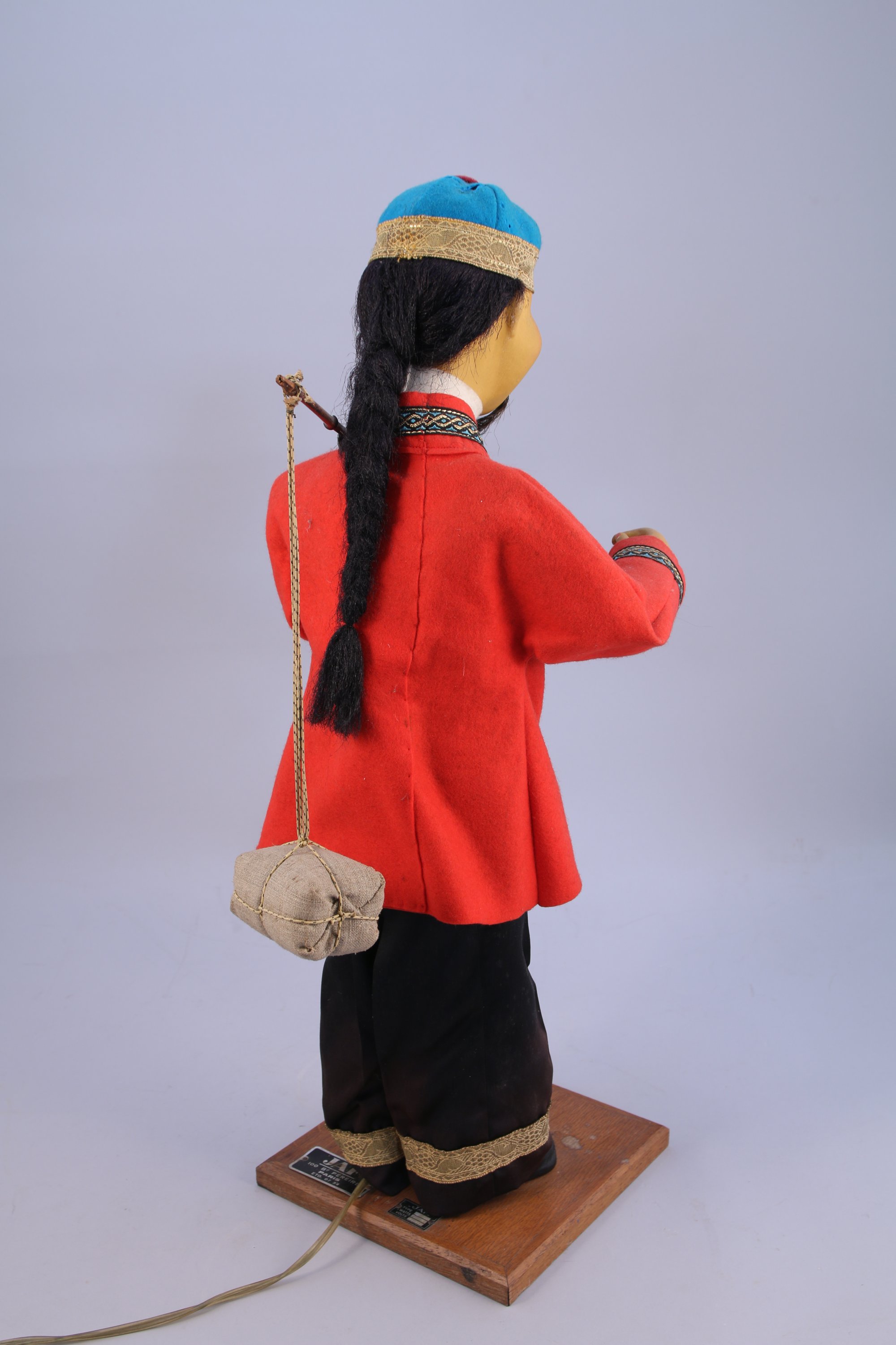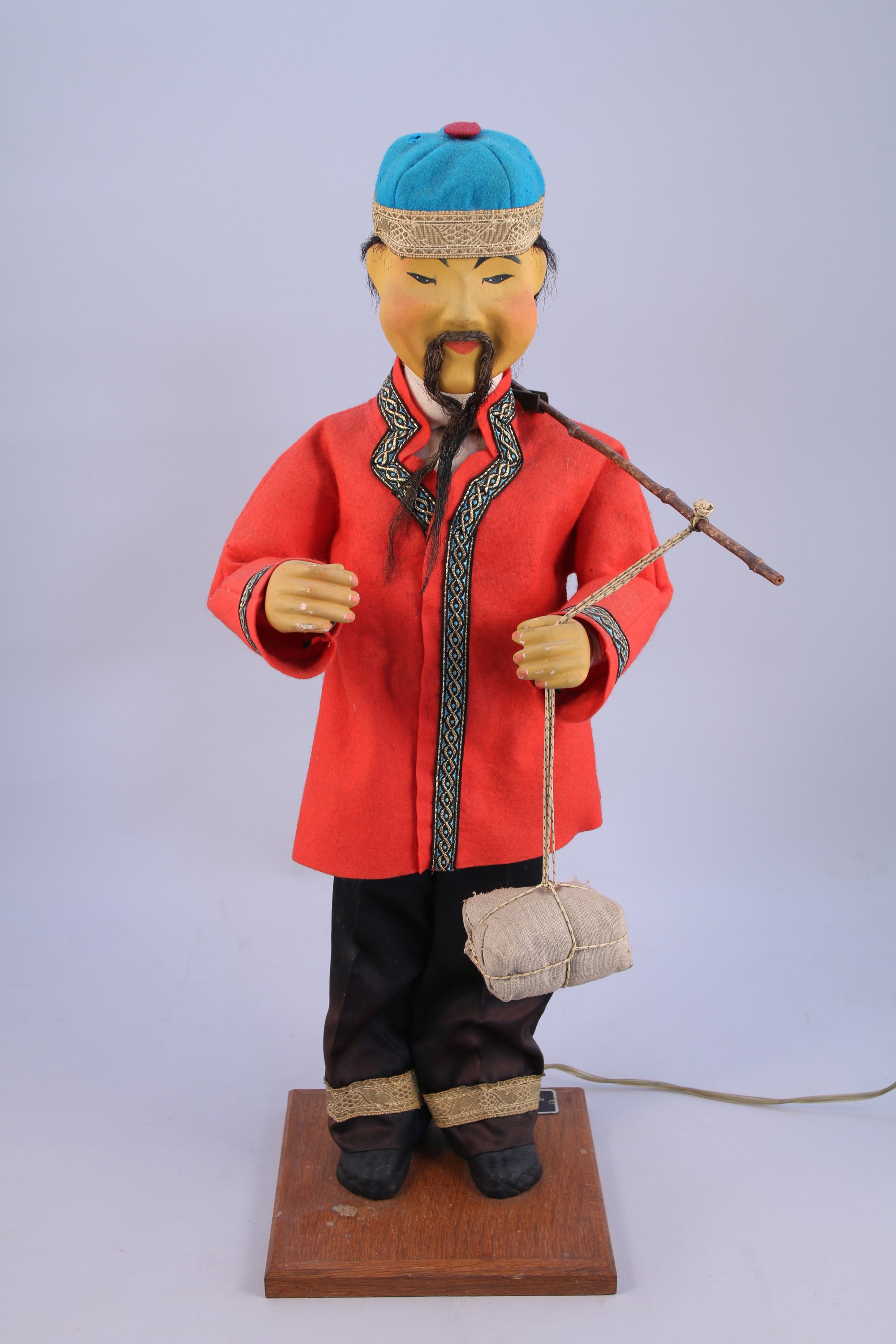JAF. AUTOMATE électrique au CHINOIS à la palanche. Mouvements des bras et de la tête. Vêtu d'habits traditionnels en feutre (quelques accidents). Repose sur une base de forme carrée en chêne présentant les plaques JAF. Fonctionne, 220V.
