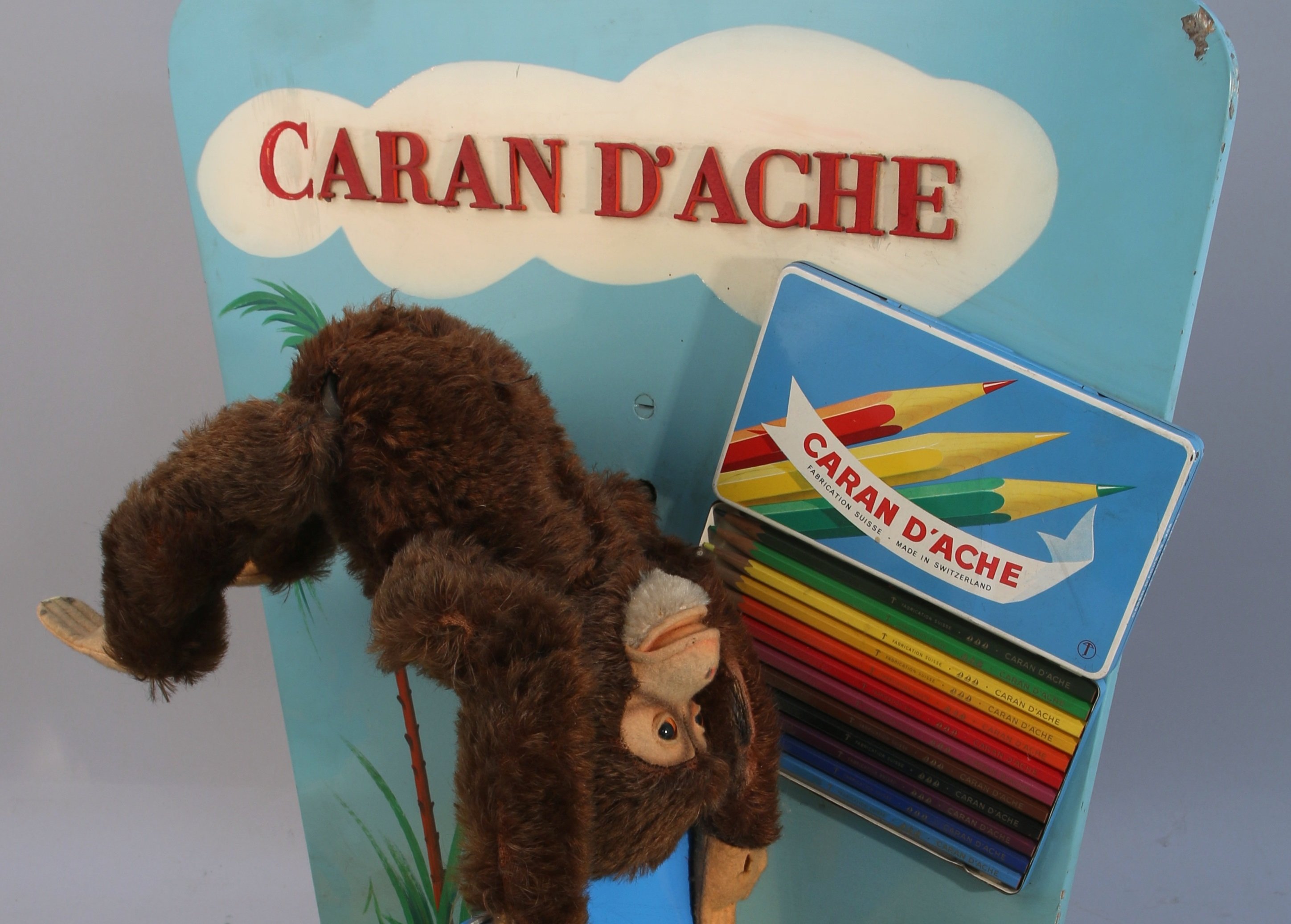 CARAN D'ACHE. SINGE ACROBATE PUBLICITAIRE. Un peluche articulée tenant une boite de 12 crayons de couleurs effectuant des cabrioles à la renverse sur un fond bleu azur décoré d'un palmier et d'une autre boite de ces crayons d'excellence. Un moteur élecrique en état de fonctionnement, 110/220 volts, par Bugnon à Genève est dissimiulé à l'arrière.