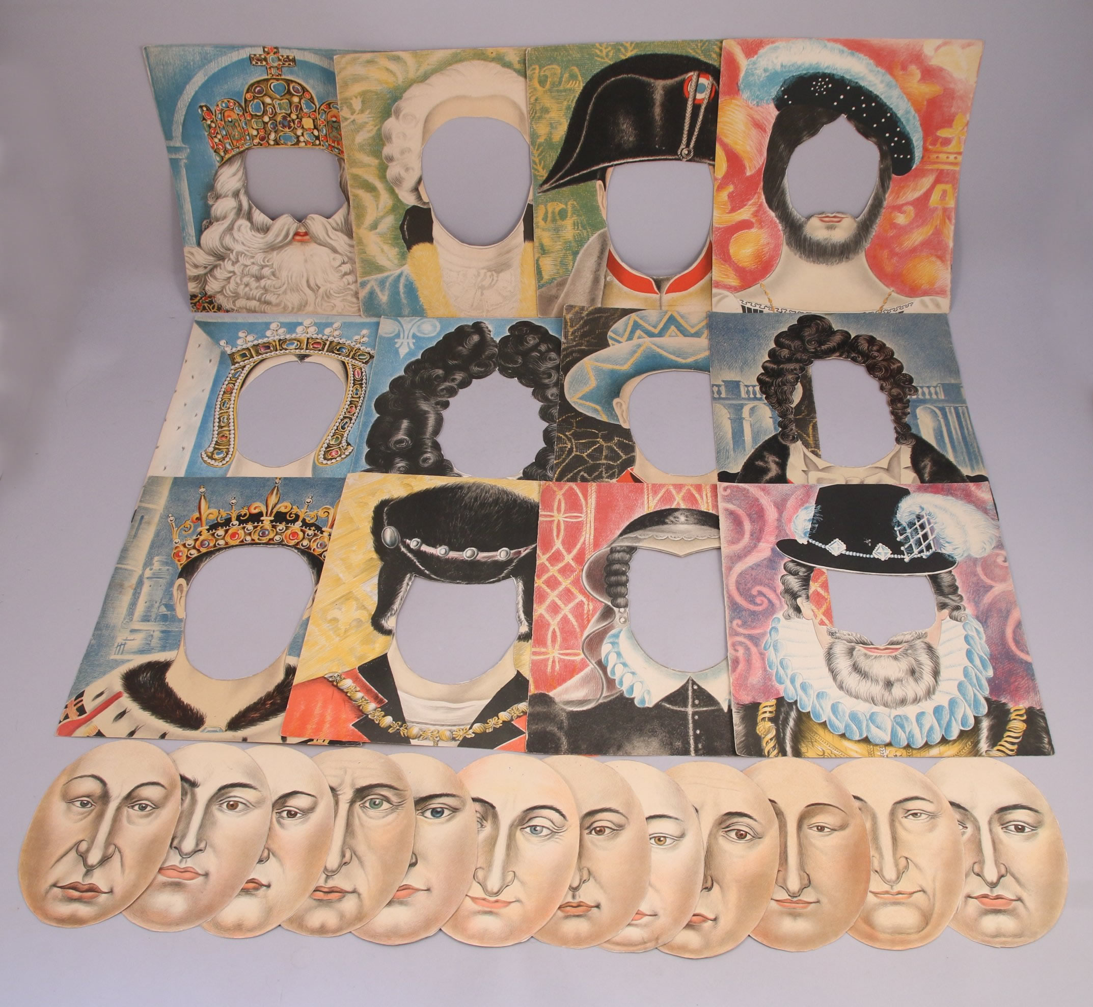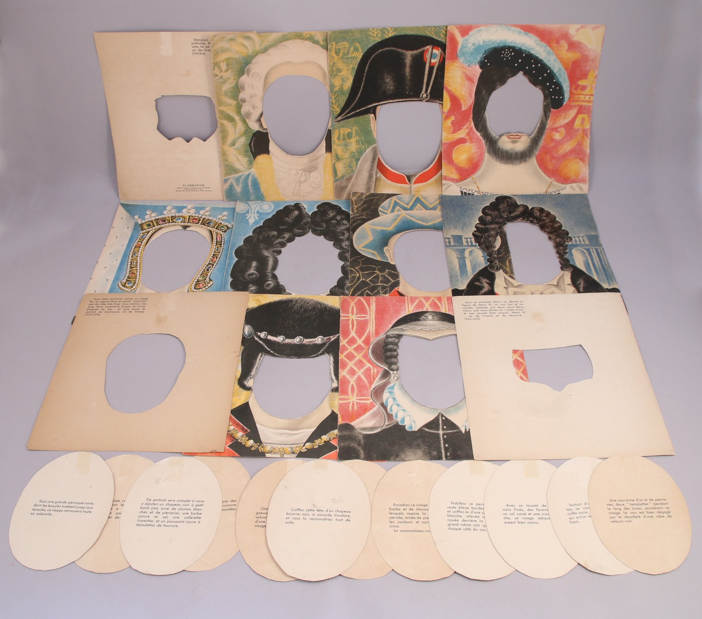 FLAMMARION. JEU des 12 TÊTES imprimées sur papier aux visages de personnages historiques dont Charlemagne, Louis XV, Napoléon Ier, Anne de Beaujean, Louis XIV, Louis-Philippe, Saint-Louis, Catherine de Médicis, François Ier, Henri IV, Louis XI et Charles VII.