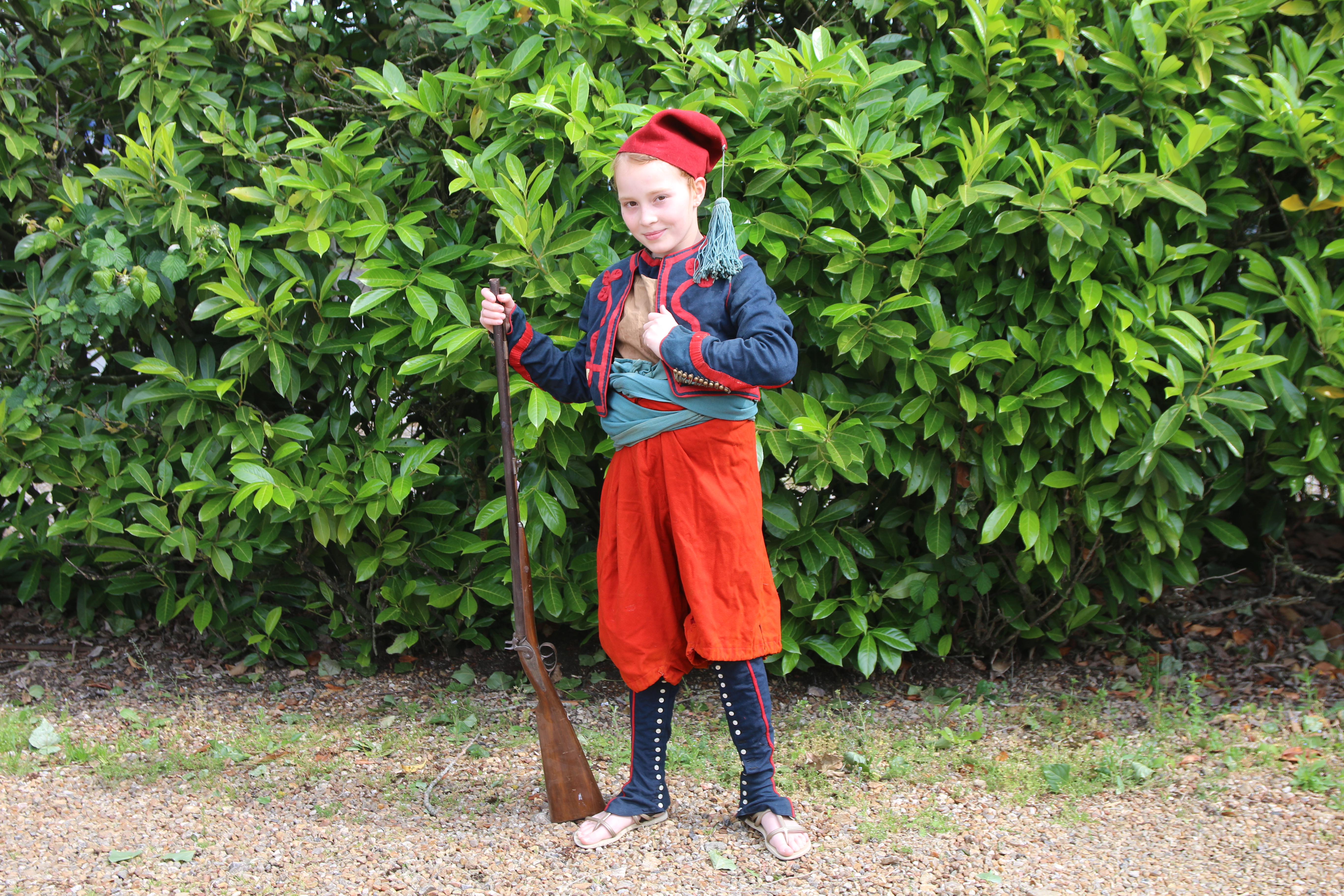 UNIFORME de ZOUAVE vraissemblablement pour enfant de troupe composé de neuf pièces dont une veste-boléro dite " bédaïa " bleue et rouge, un gilet algérien au col bleu et rouge, un pantalon sarouel en drap écarlate, une paire de guêtres bleues à liserés rouges et boutons nacrés, une paire de gants bruns, une chéchia en feutre rouge et son gland et une ceinture de laine.