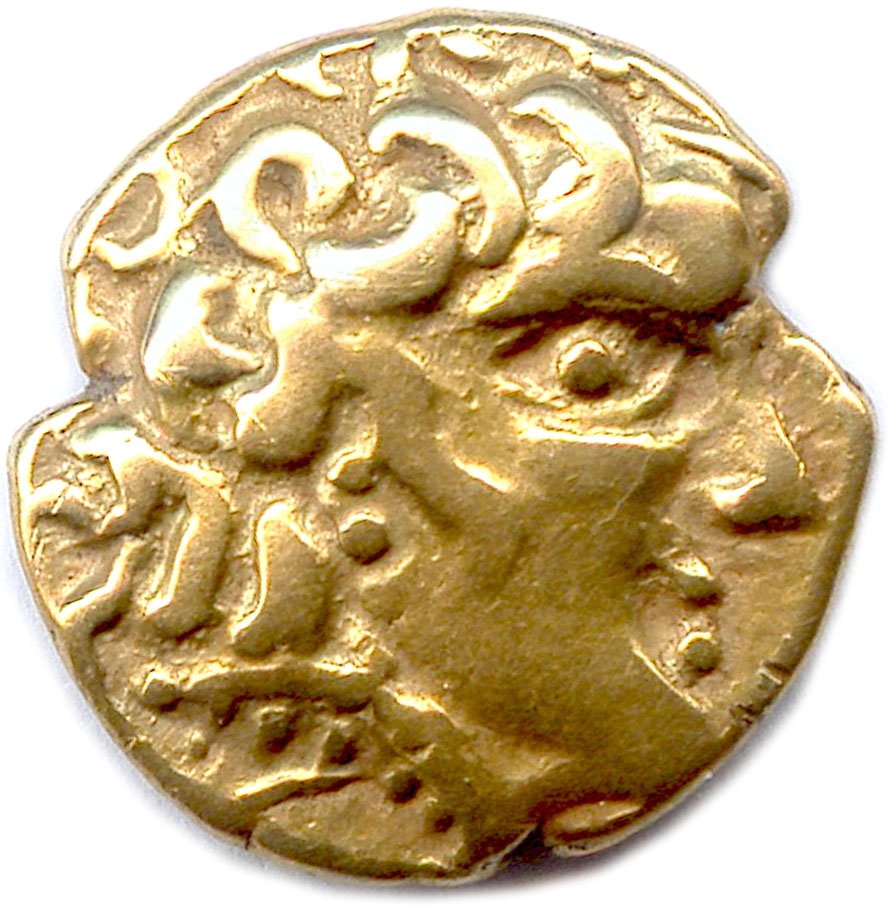 Tête laurée à droite, loeil en amande. Collier de perles.