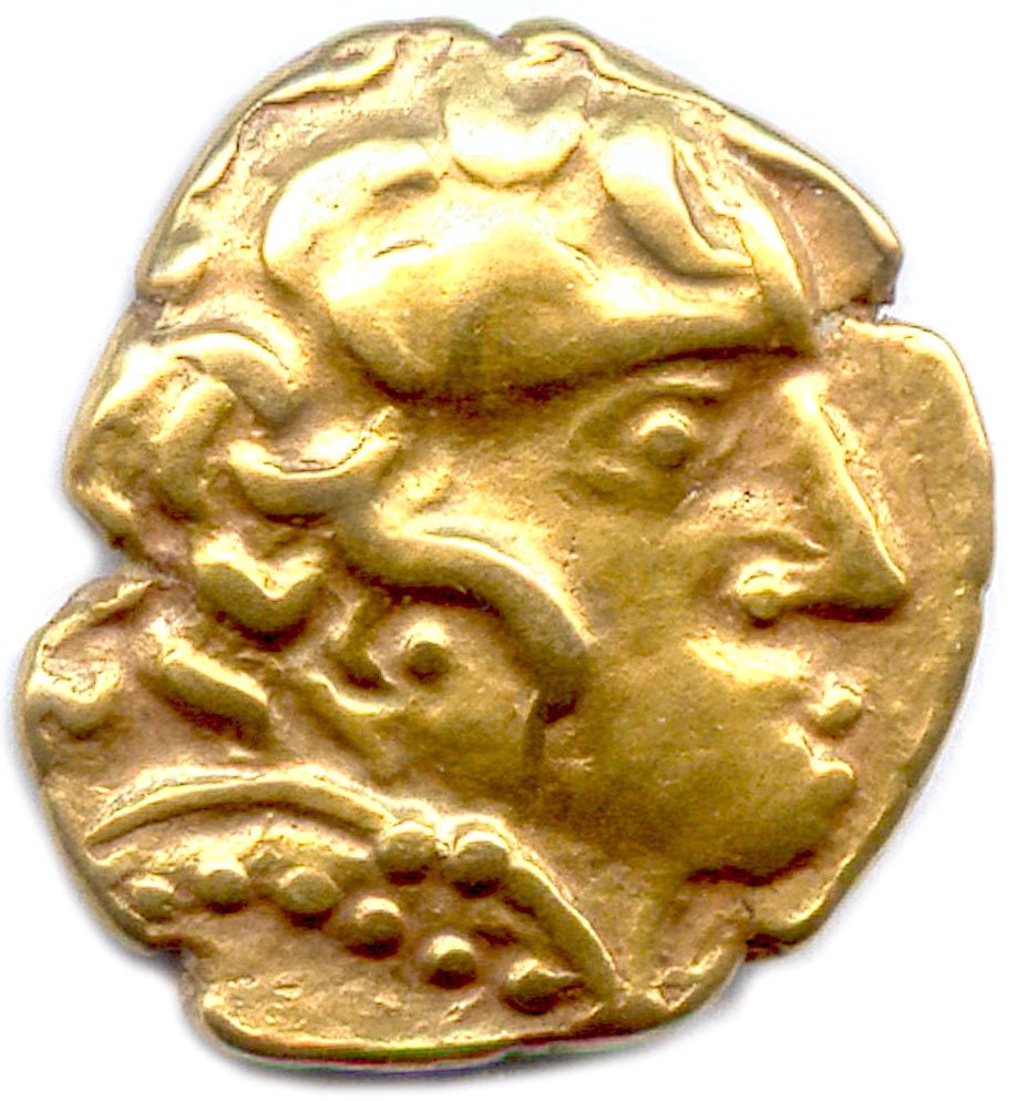 Tête laurée à droite, l’oeil en amande. Collier de perles.