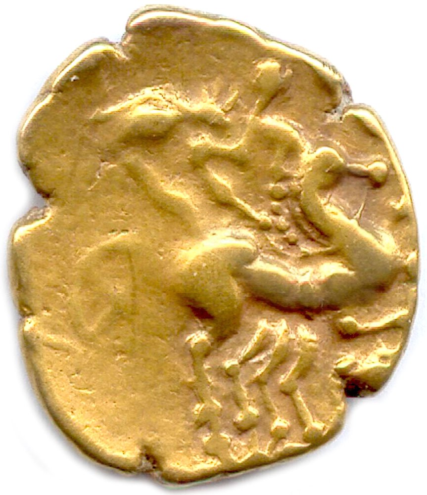 R/. Bige de chevaux conduit à droite par un aurige. Dessous, lyre inversée.