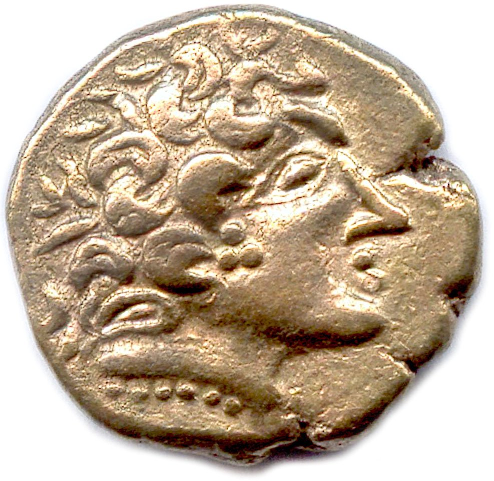 Tête apollonienne à droite, loeil en amande. Trois perles près de loreille sur la joue. Collier de perles.