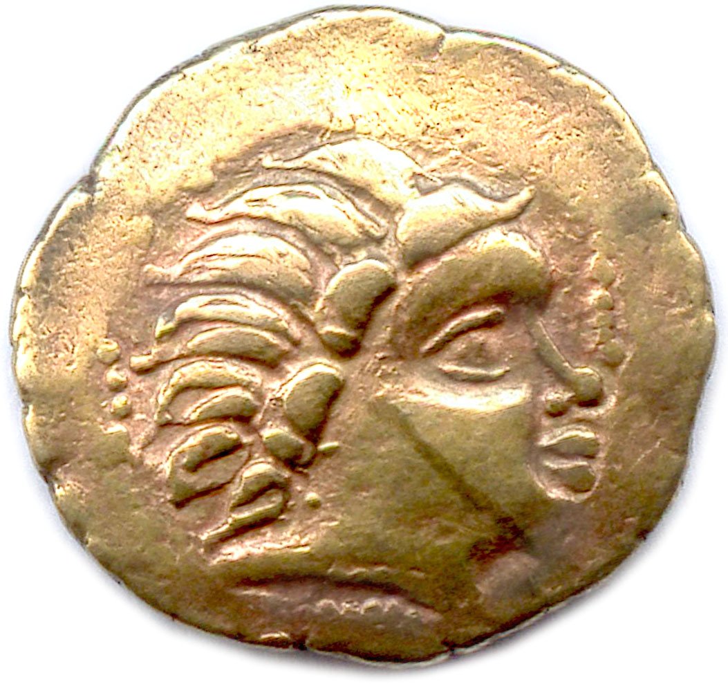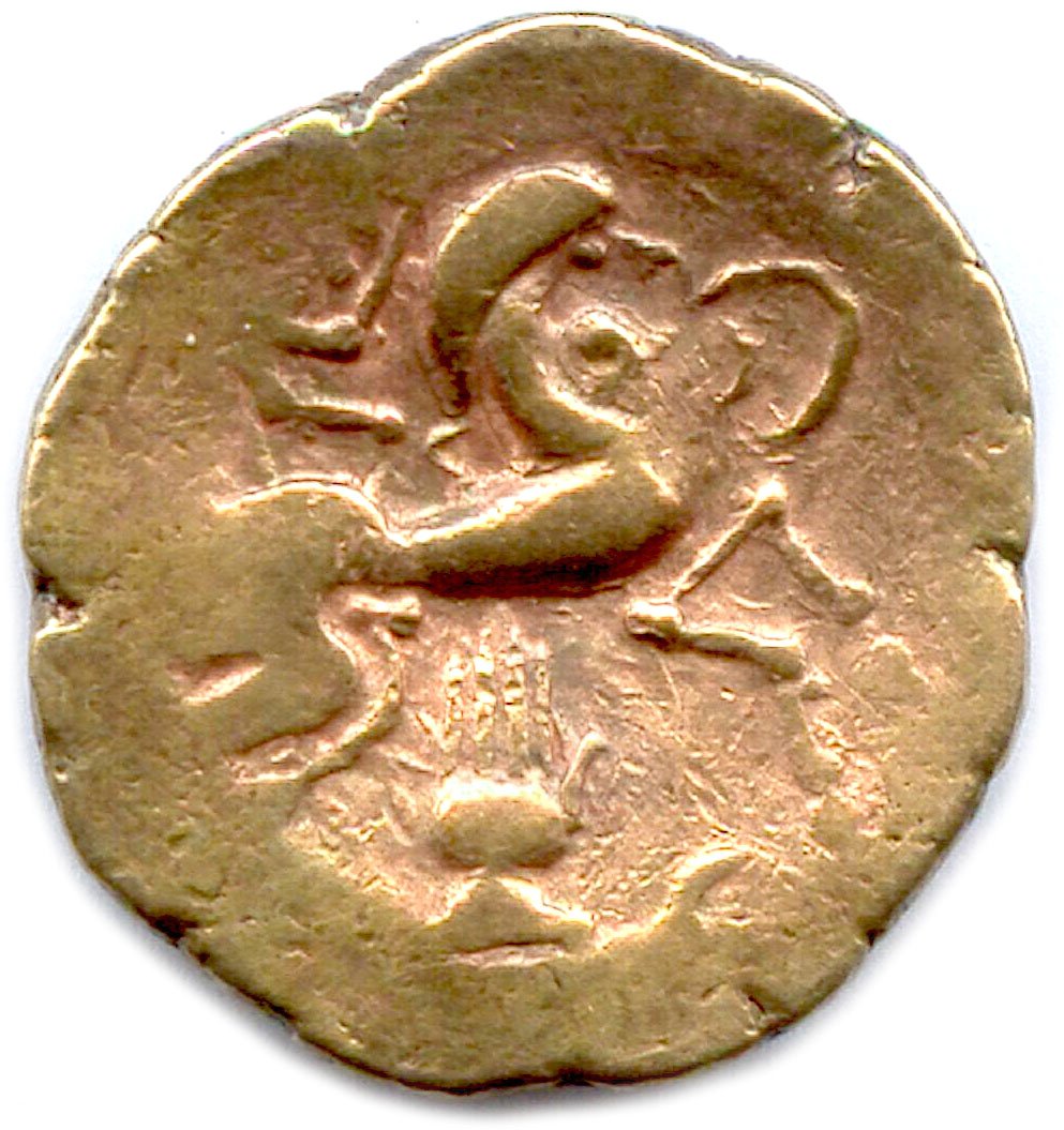 R/. Cheval androcéphale conduit à droite par un aurige. Dessous, main sur un joug.