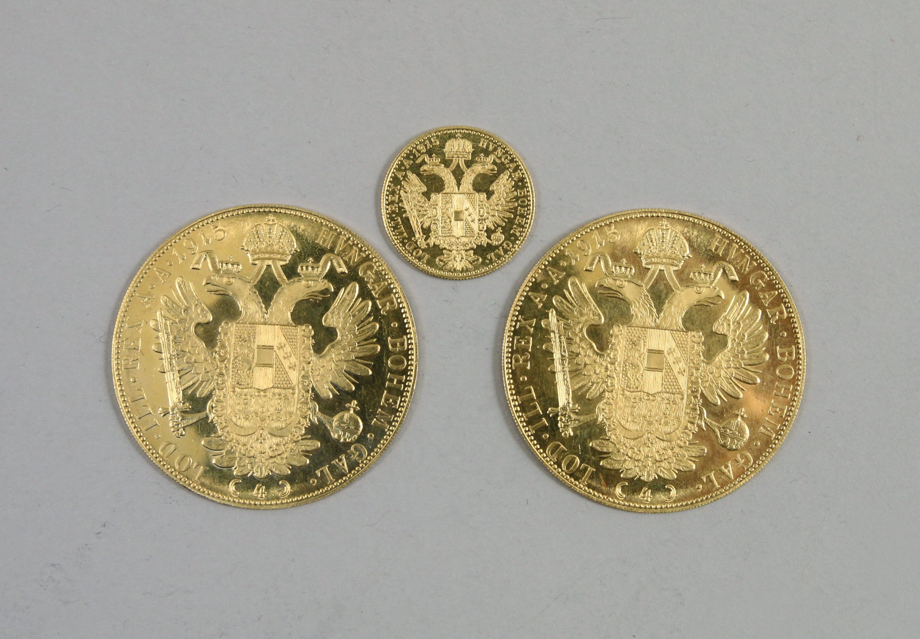 AUTRICHE-HONGRIE. 3 Ducats or, frappes modernes François-JosephI, grand module (2), petit module (1), 1915.
