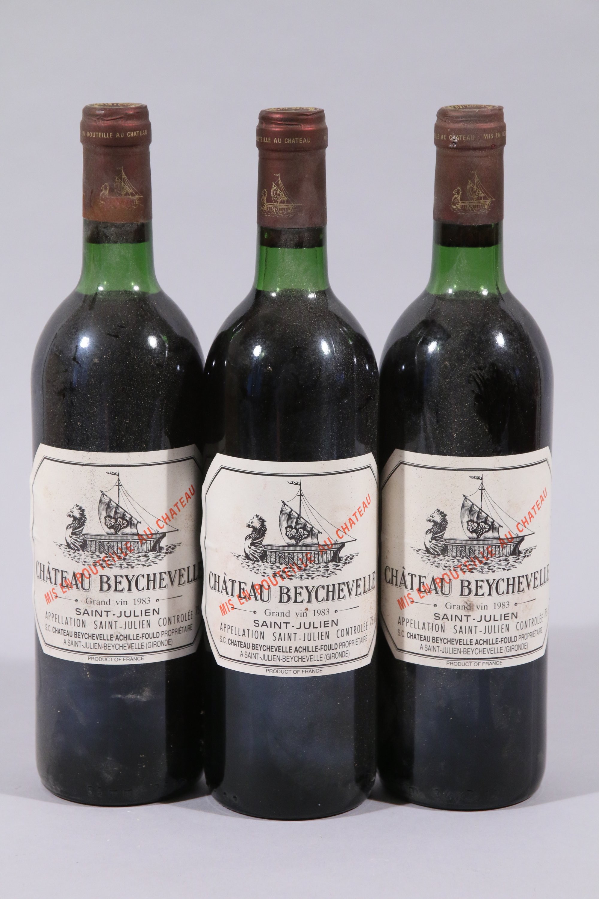SAINT-JULIEN, Château Beychevelle/Grand Cru Classé, 1983, 3 bouteilles, LB, bouchons affaissés.