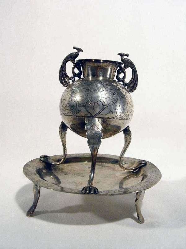 MATÉ en argent à décor de phénix, fleurs et feuillages. Piètement tripode cambré terminé en griffes. Monté sur une soucoupe en argent, à décor d'arabesques. Piètement tripode en forme de feuilles stylisées. Haut. 15, Diam. 13 cm. Poids : 255 g.