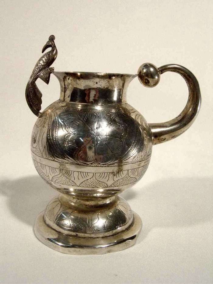 MATÉ en argent à anse, à décor d'un phénix, fleurs, feuillages et motifs géométriques. Piédouche à doucine. Haut. 12 cm. Poids : 155 g.