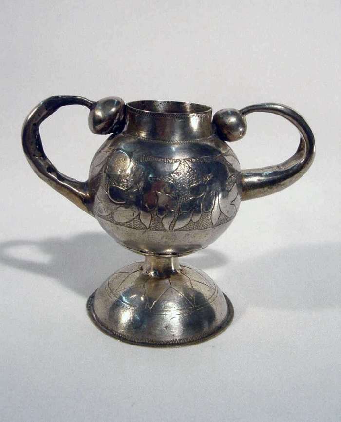 MATÉ en argent, à deux anses. Décor de feuillage, stries et frise à motifs géométriques. Piédouche à doucine. Haut. 10 cm. Poids : 160 g.