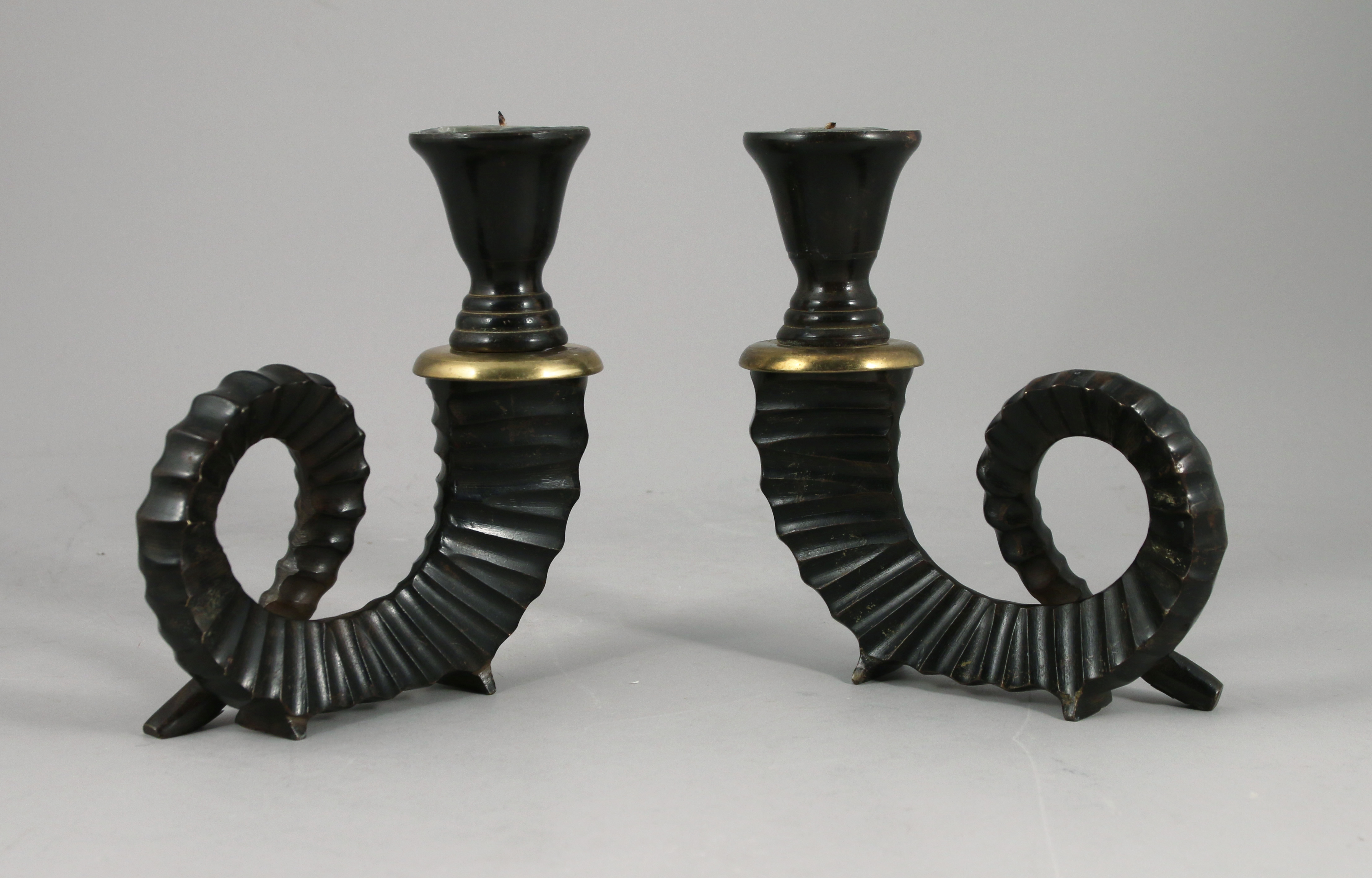 Paire de BOUGEOIRS aux CORNES de BOUQUETIN en bronze patîné (Haut. 19,5 cm) et un VIDE POCHE en verre foncé d'un cuir d'autruche (H. 3,5 L. 20, P. 20 cm).