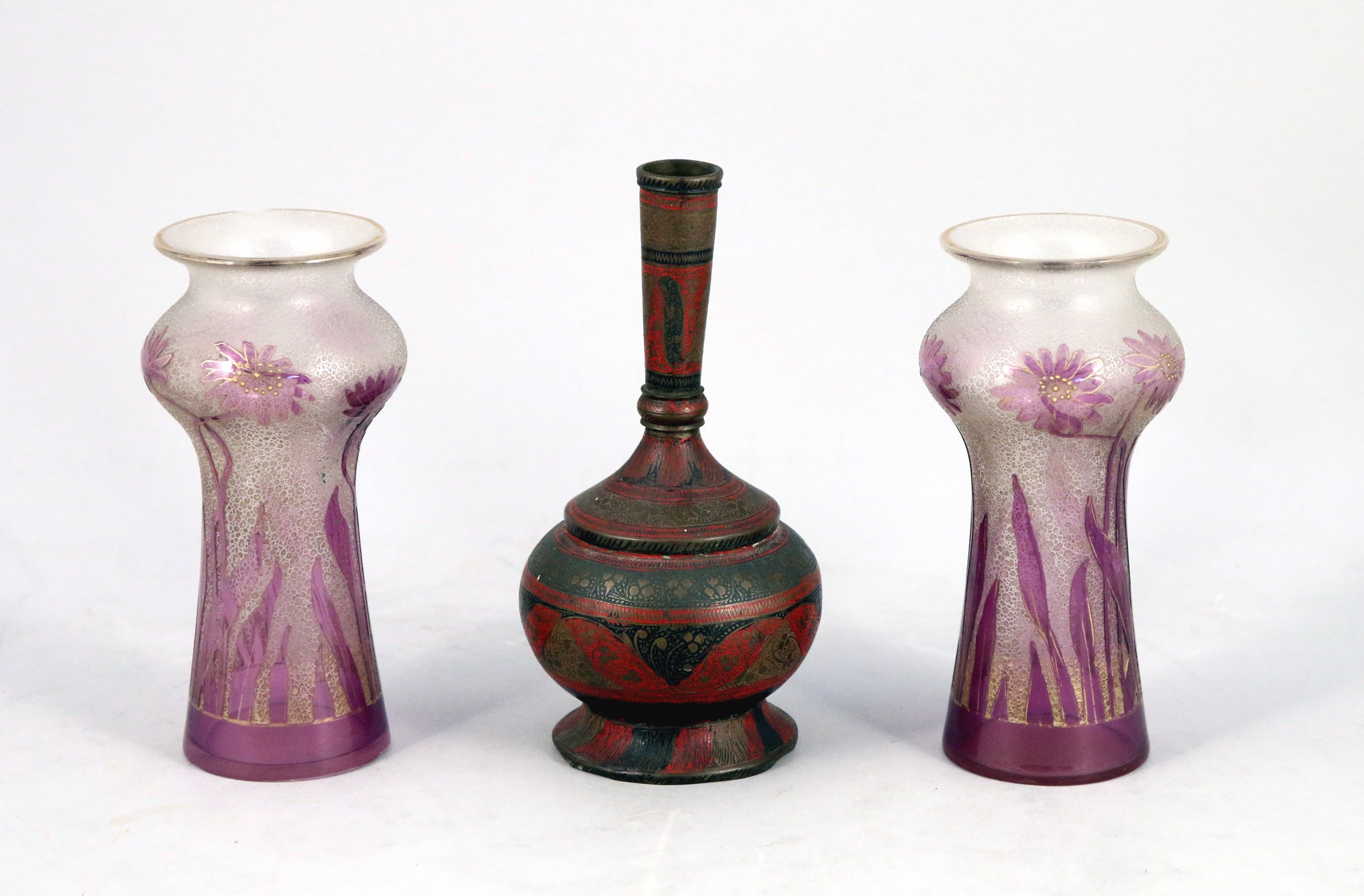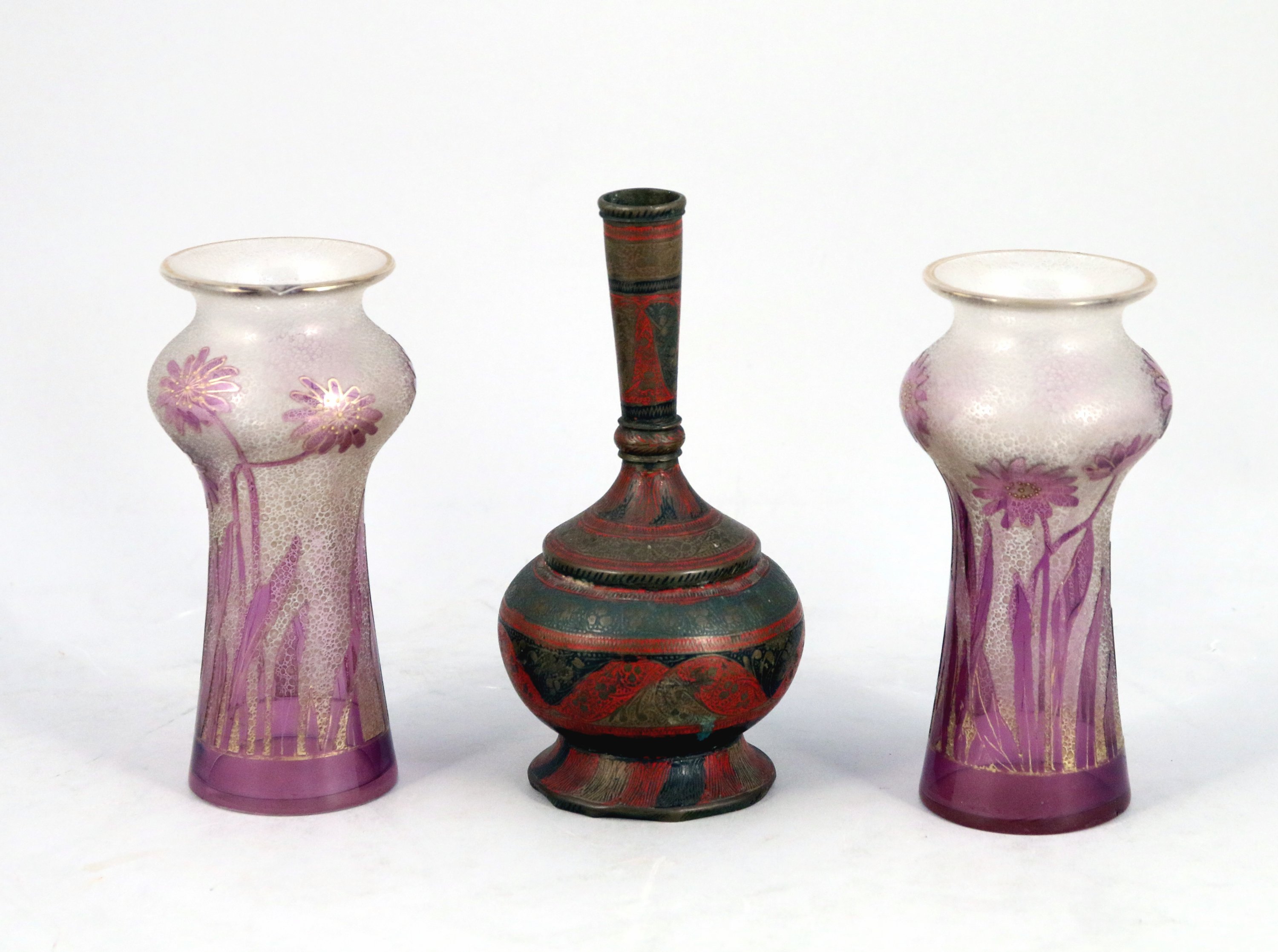 et doré à décors de marguerites (Haut. 14,4 cm) et un petit VASE BOUTEILLE en métal martelé et laqué rouge et noir à décors de fleurs, feuillages et arabesques (Haut. 16 cm).