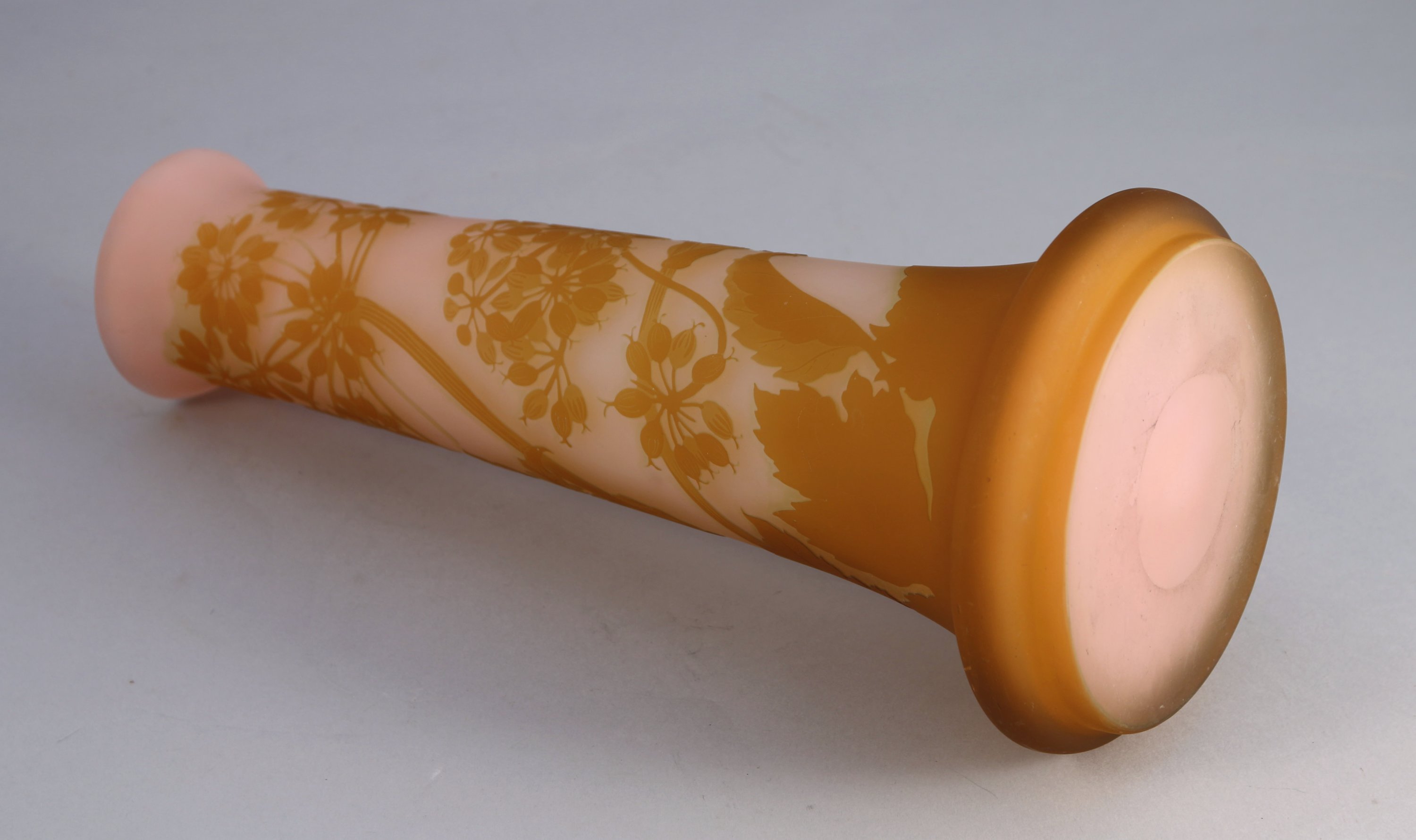 à panse aplatie et col évasé en verre multicouche à décor orangé dégagé à l'acide d'angéliques sur fond rosé. Signé.