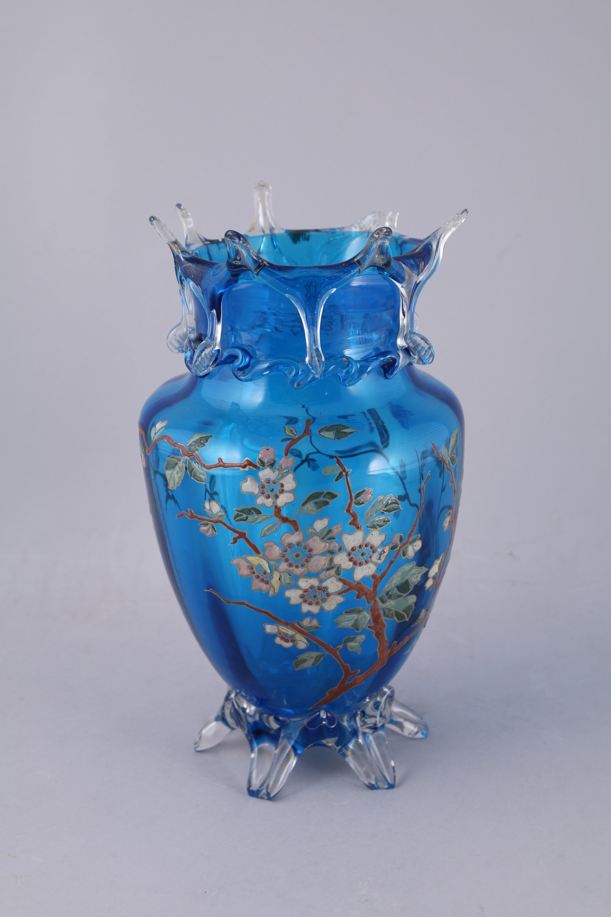 au col pincé et dentelé, coulures en appliques en forme de vaguelettes, le piètement dentelé. Décor en verre émaillé polychrome à branchages fleuris dans le style japonisant. Marque à l'or au-dessous "Grand Dépôt, 21 rue Drouot, Paris".