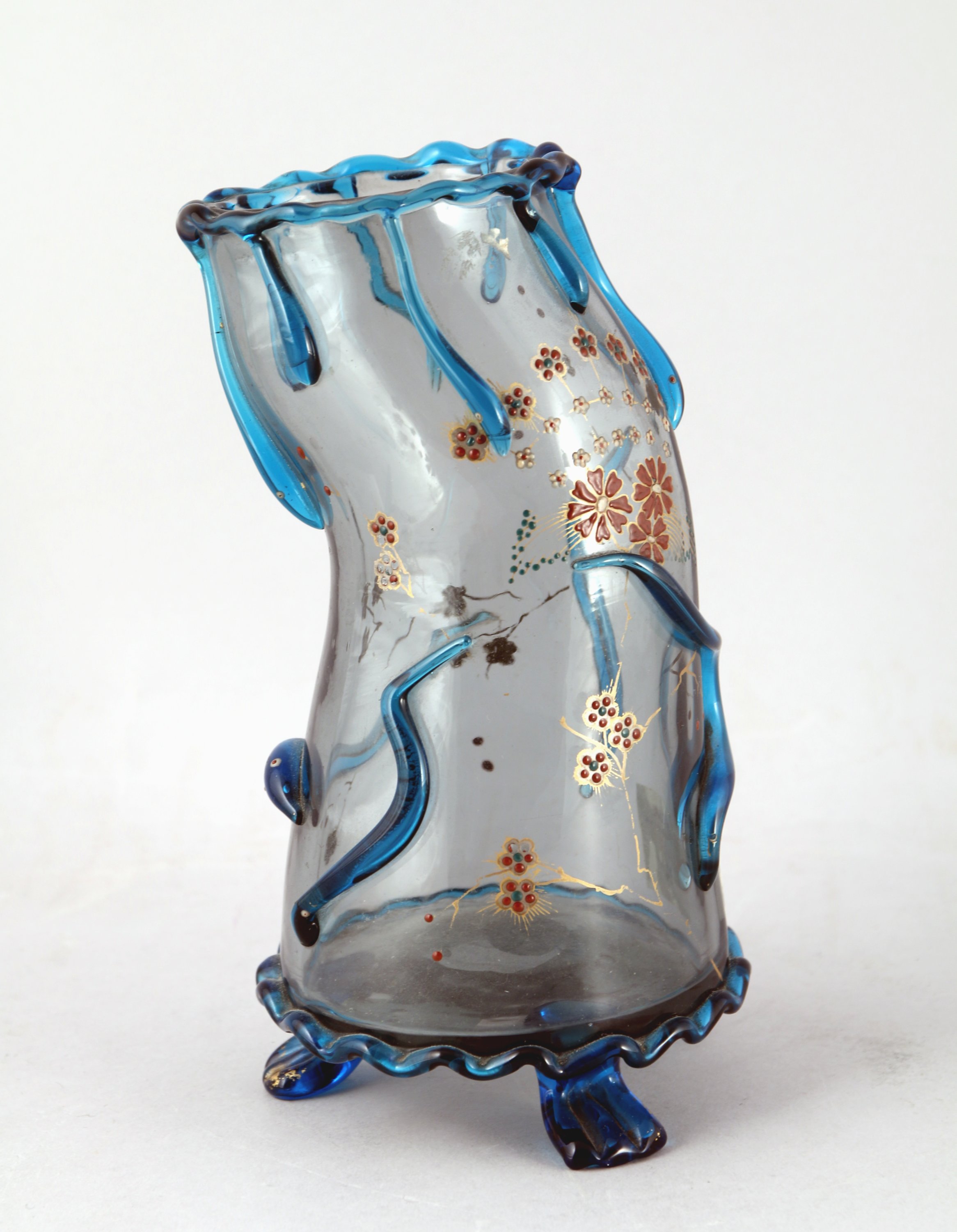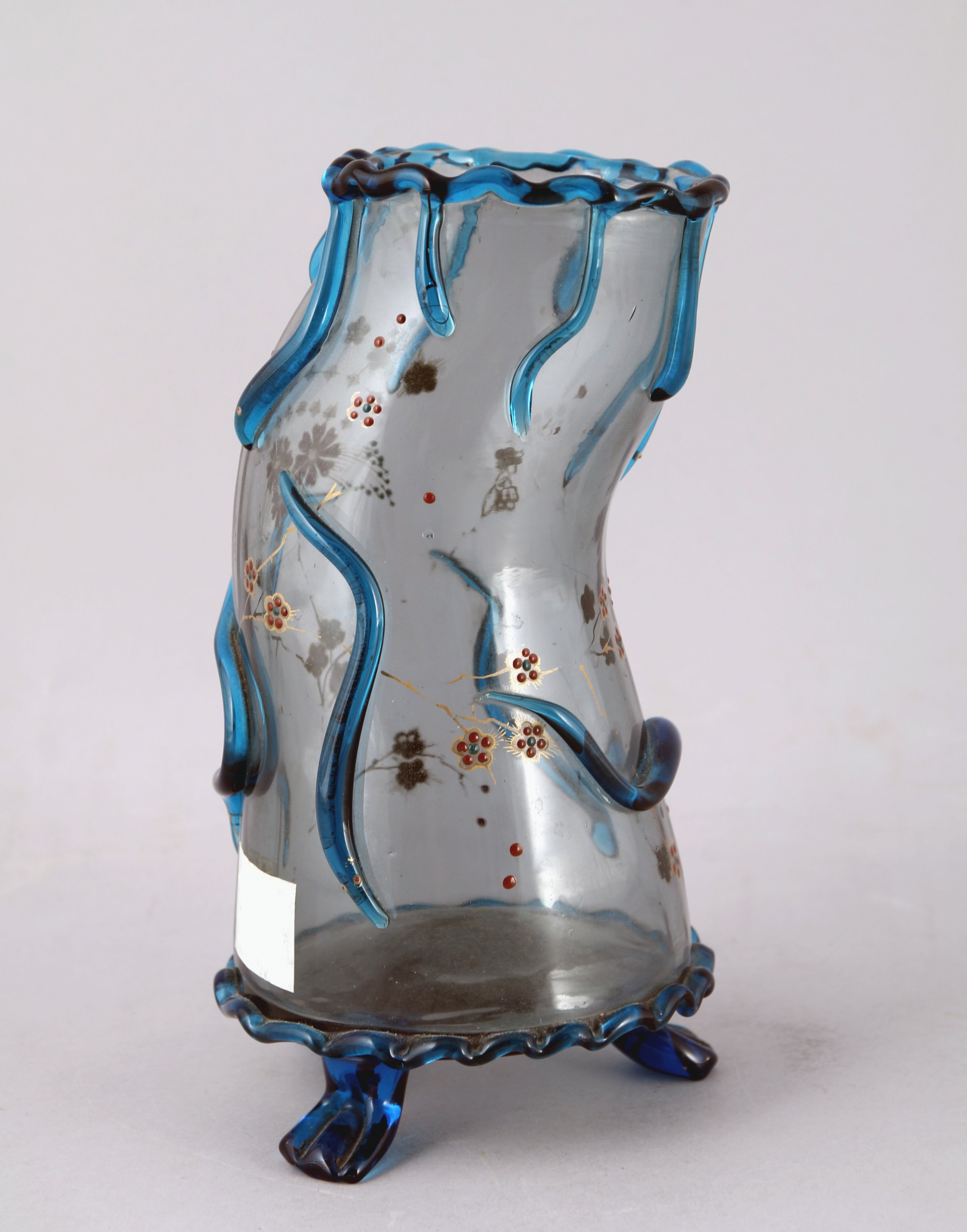 en verre bleuté de forme tubulaire au col ondulé, avec applications de coulures imitant des tétards, décor de fleurettes en émail polychrome. Piètement tripode.