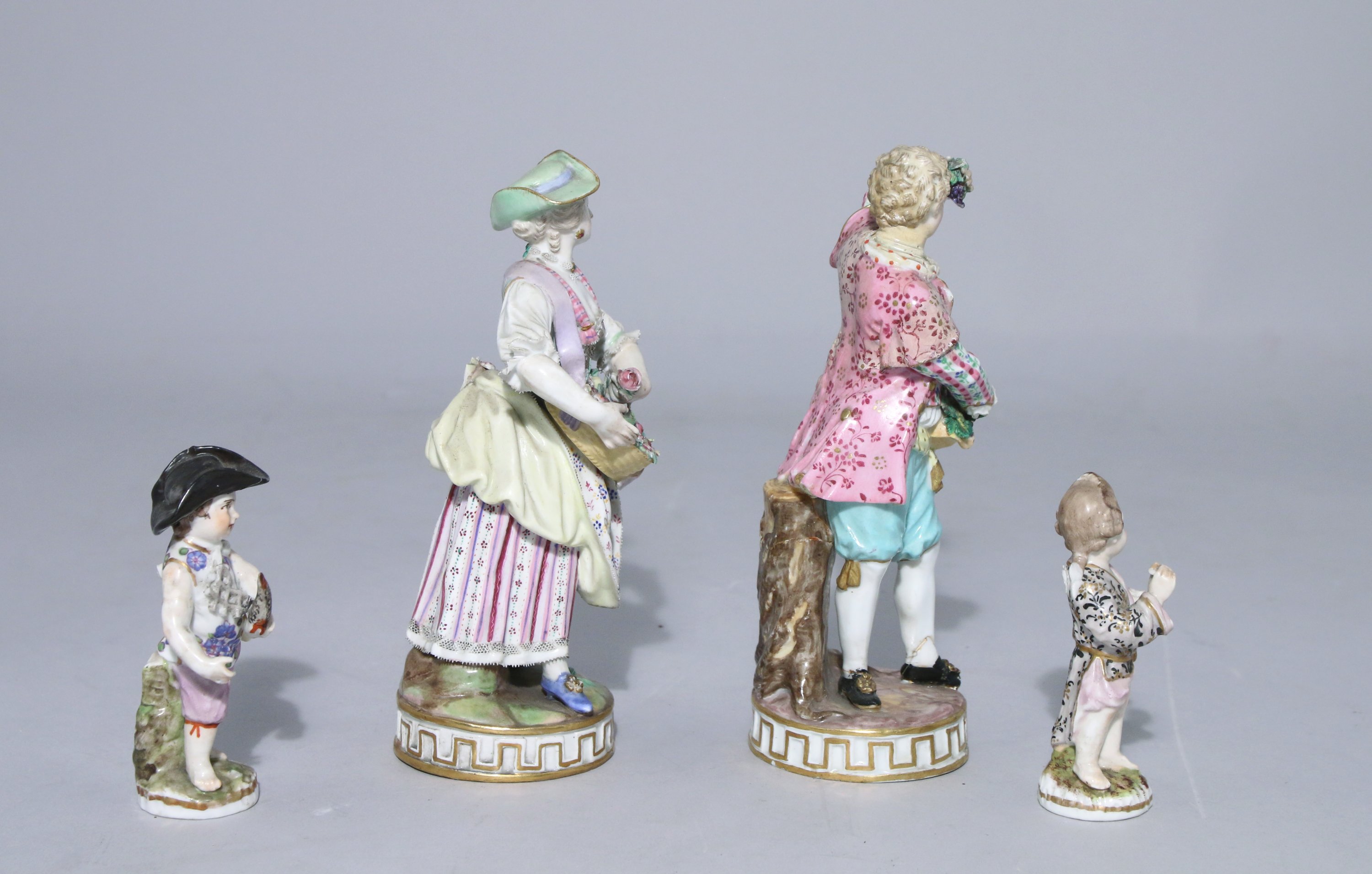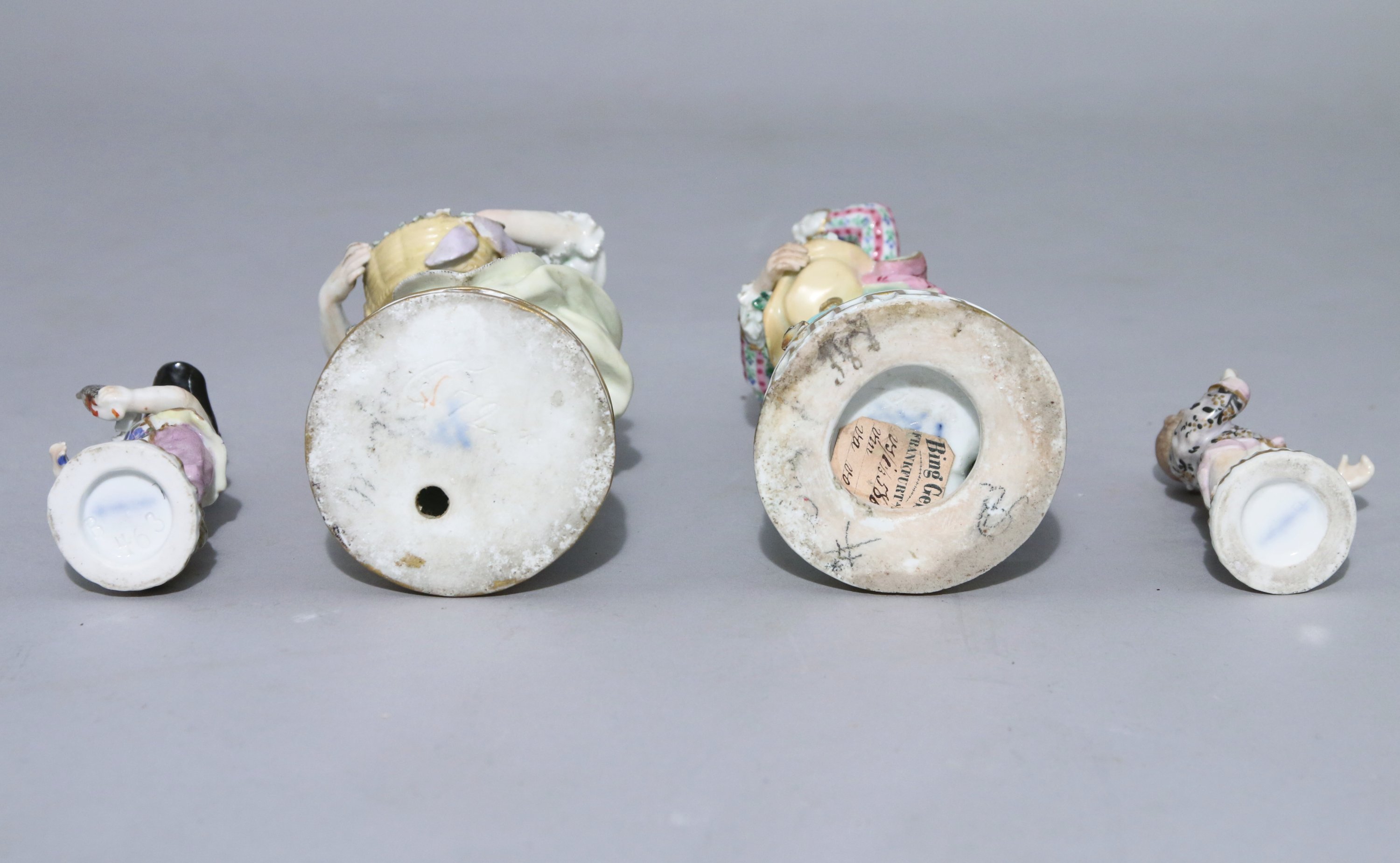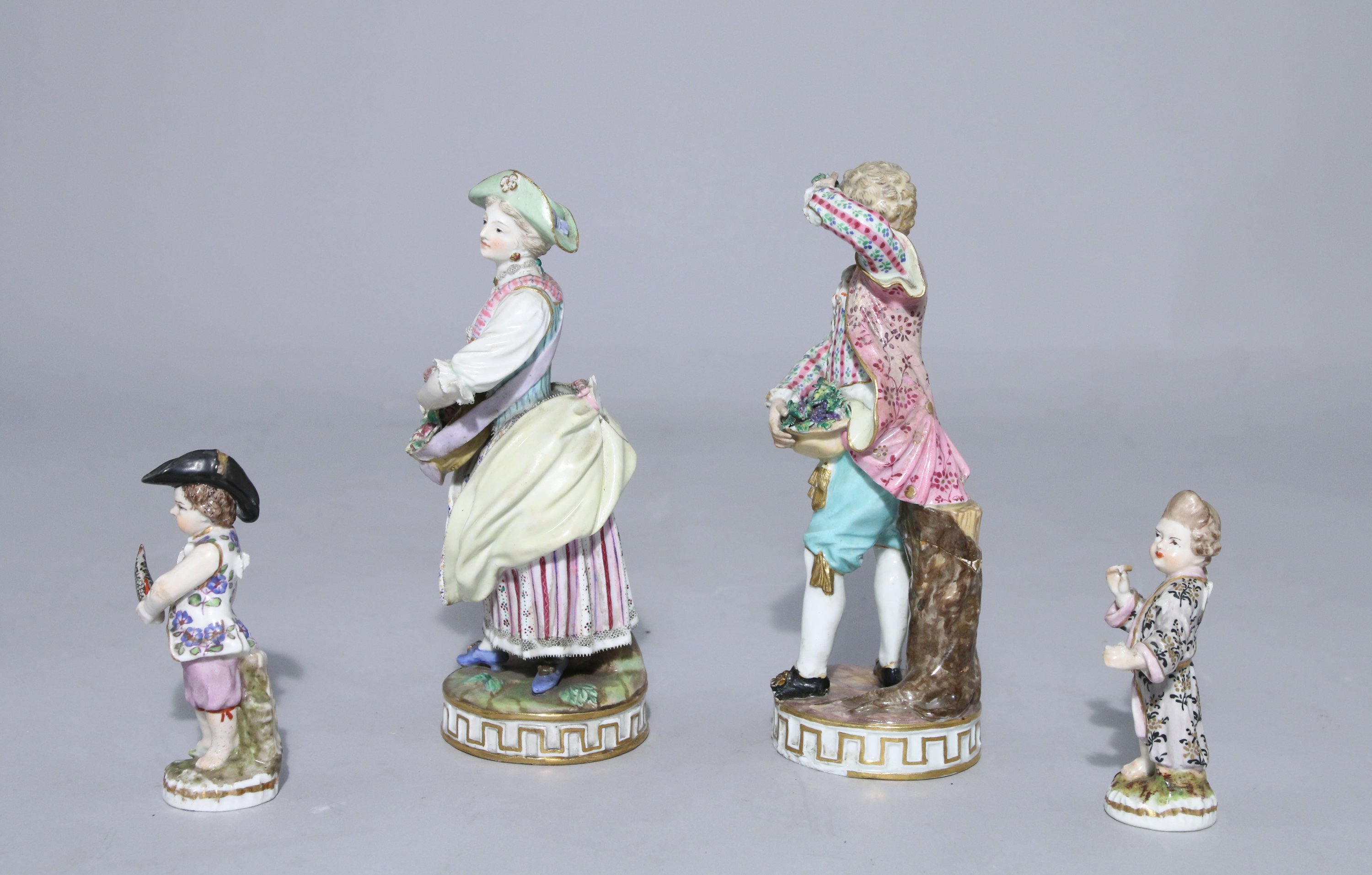 JOINT. MEISSEN, Deux sujets en PORCELAINE polychrome, l'un figurant un enfant coiffé d'un chapeau et tenant dans sa main droite un poisson, le second figurant un enfant au catogan vêtu d'une robe-de-chambre. Marque bleue de Meissen au-dessous.Numéro "R463" et "P".