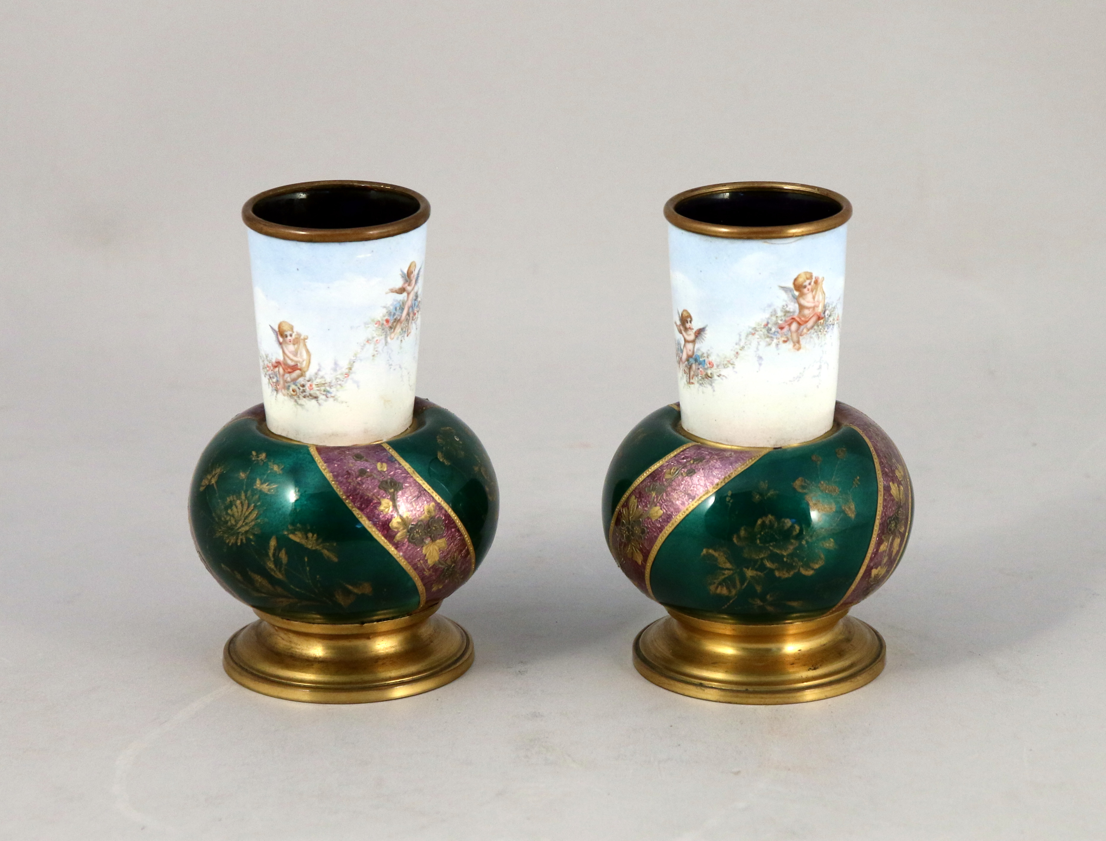 en cuivre émaillé, la partie supérieure à décor d'amours musiciens assis sur des guirlandes de fleurs sur fond nuageux. La partie inférieure de forme renflée à décor en émail translucide de trois galons violet à décor de fleurs à l'or sur fond gaufré s'alternant avec des réserves vertes décorées de fleurs dorées. Piédouche en laiton doré. Intérieur bleu nuit.