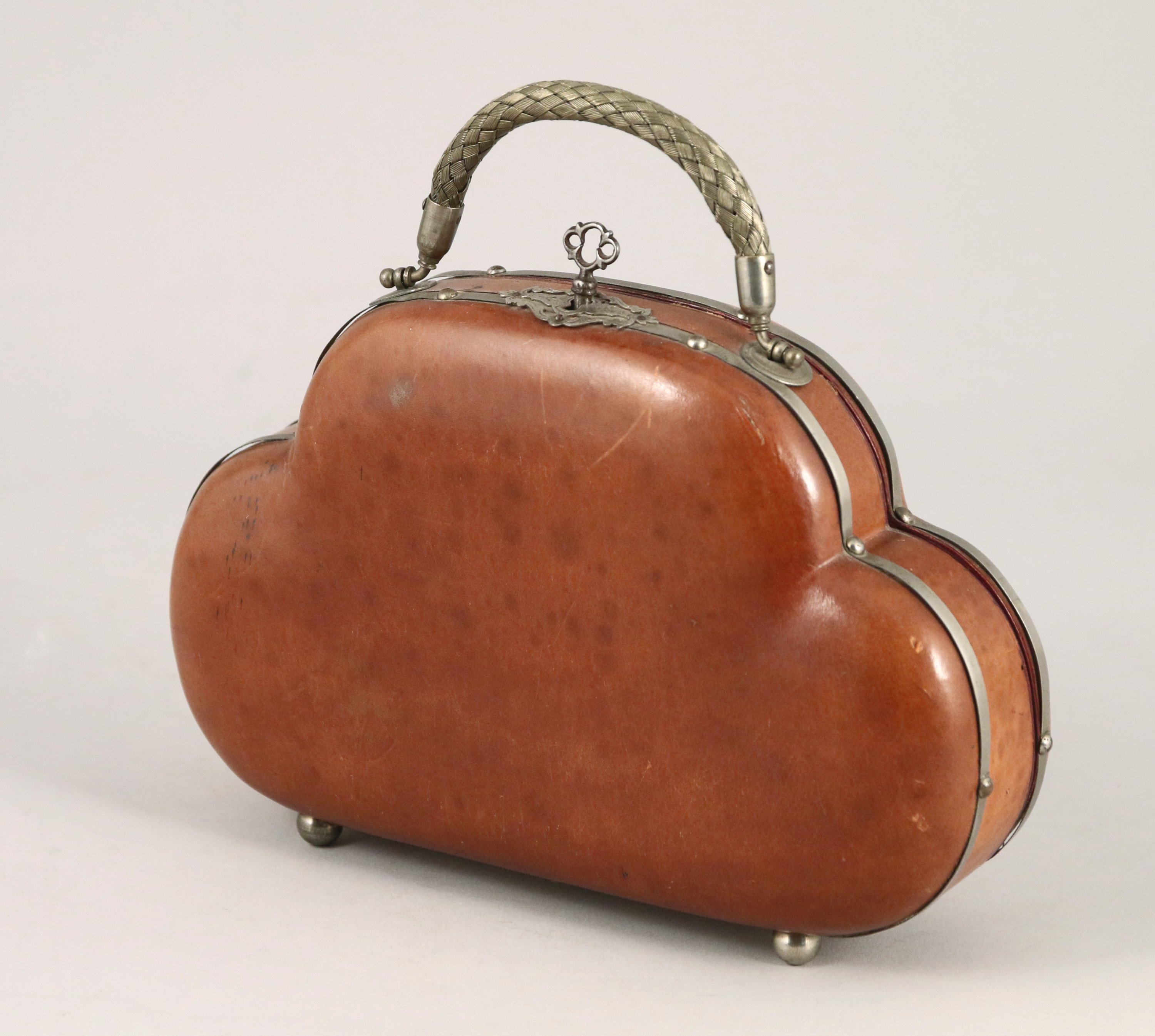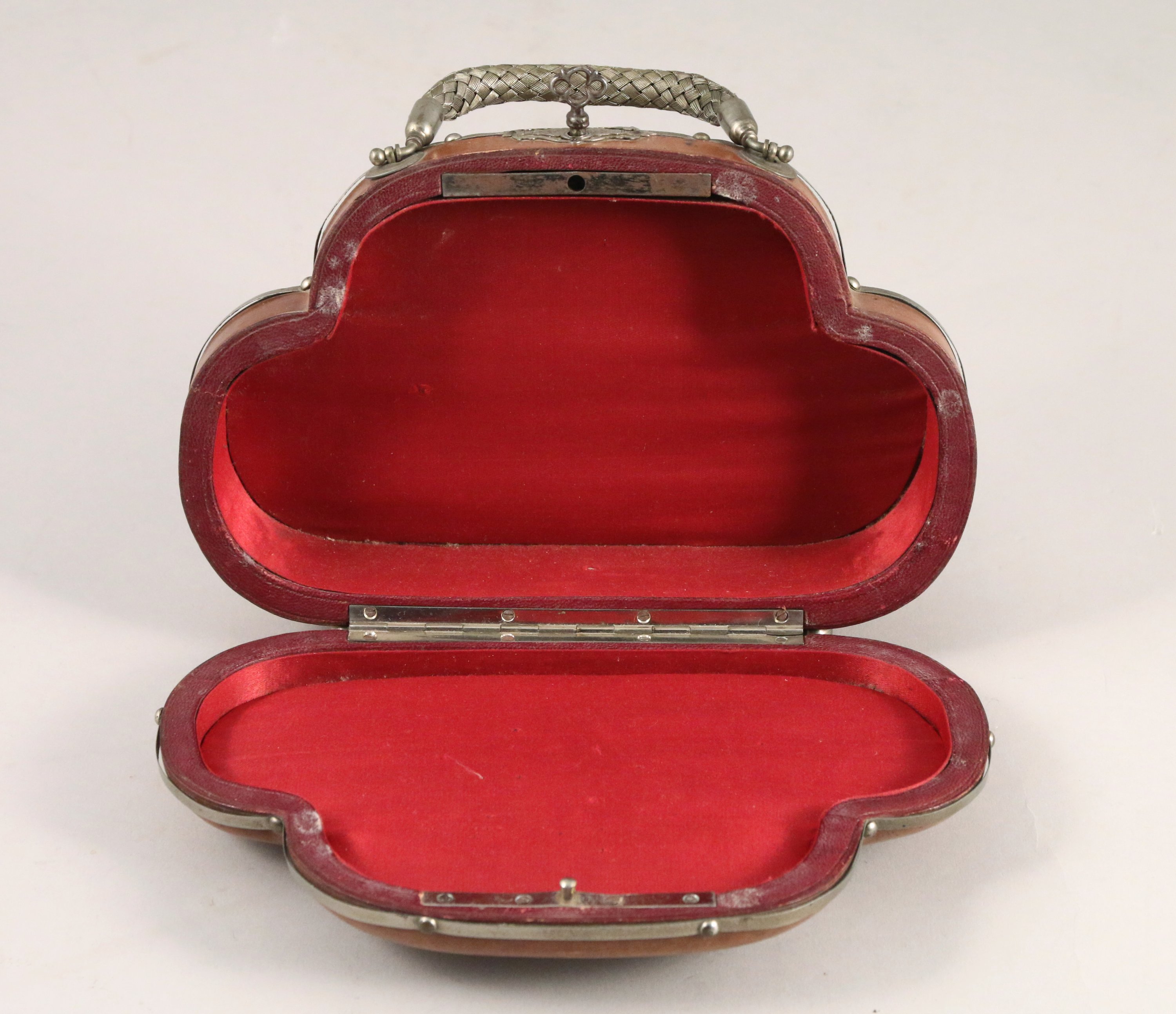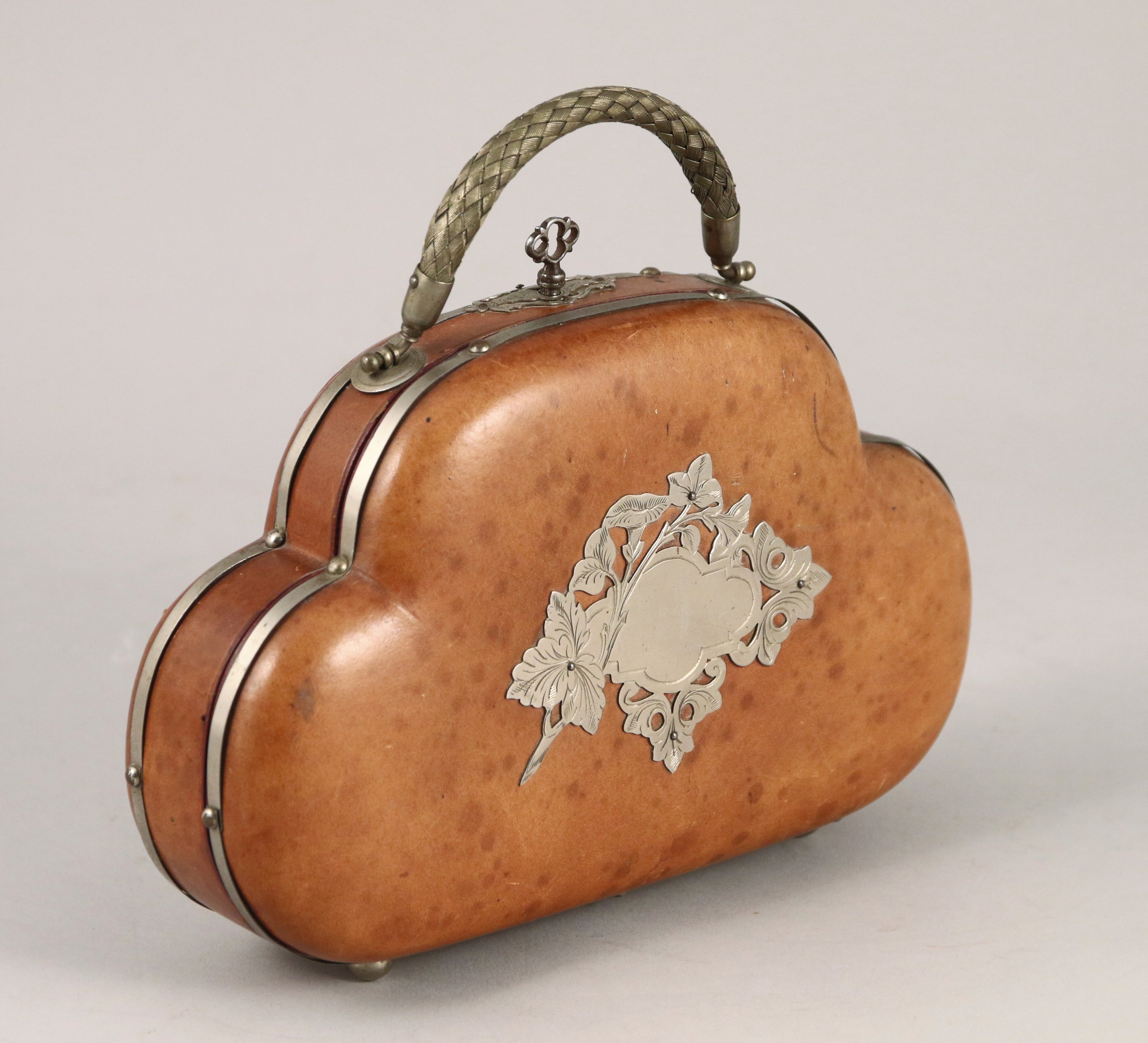 de forme polylobée, gainé de cuir, orné au centre d'un cartouche ajouré en métal argenté à décor fleuri. Anse en métal tressée, entrée de serrure ornée d'un motif de feuillage stylisé.