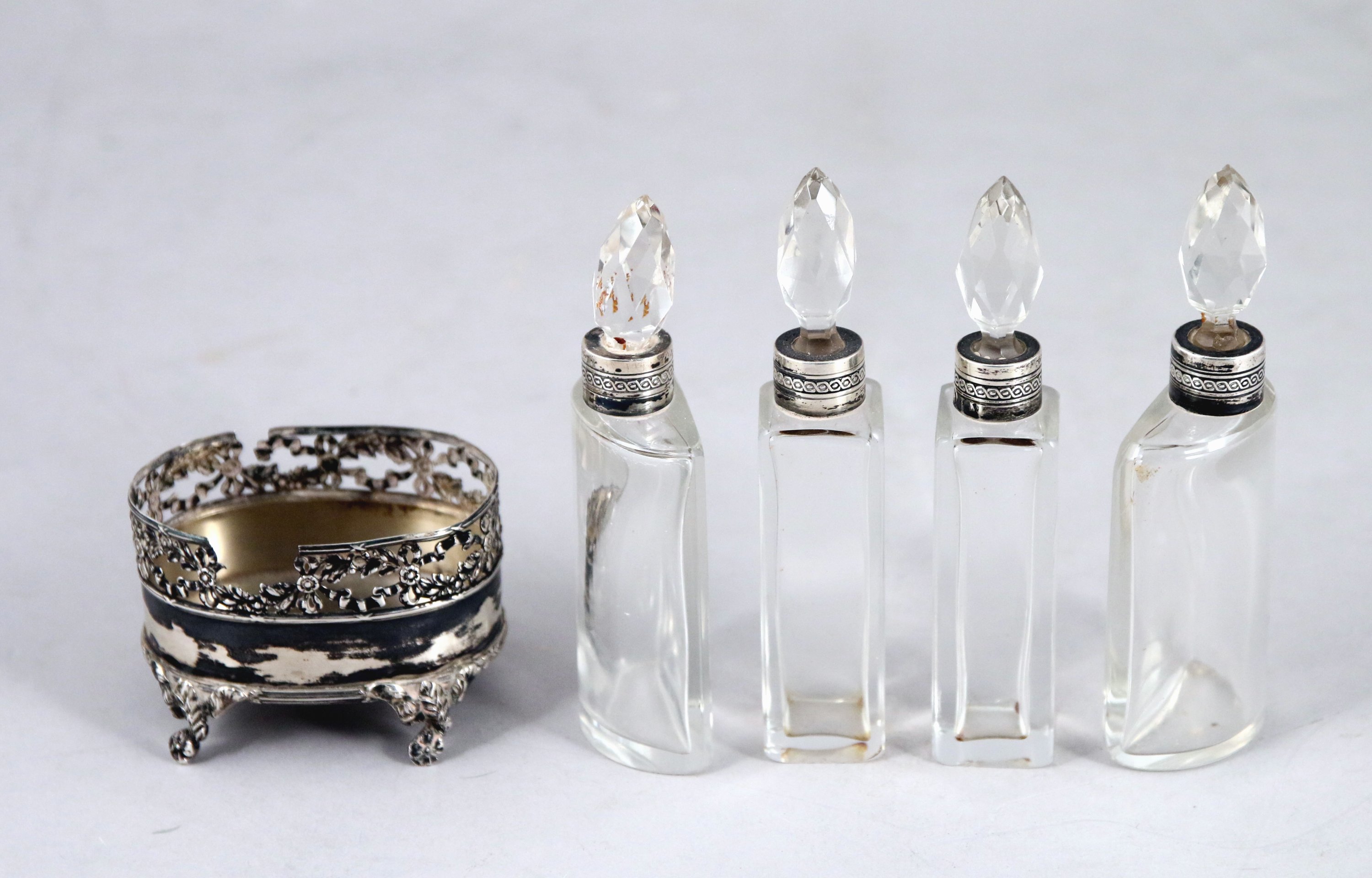 comprenant quatre flacons en verre et bagues argent, les bouchons facetés enchassés dans un réceptacle de forme ovale en argent à galerie ajourée de guilarndes de fleurs et noeuds de rubans reposant sur quatre pieds à motif de fleurettes.