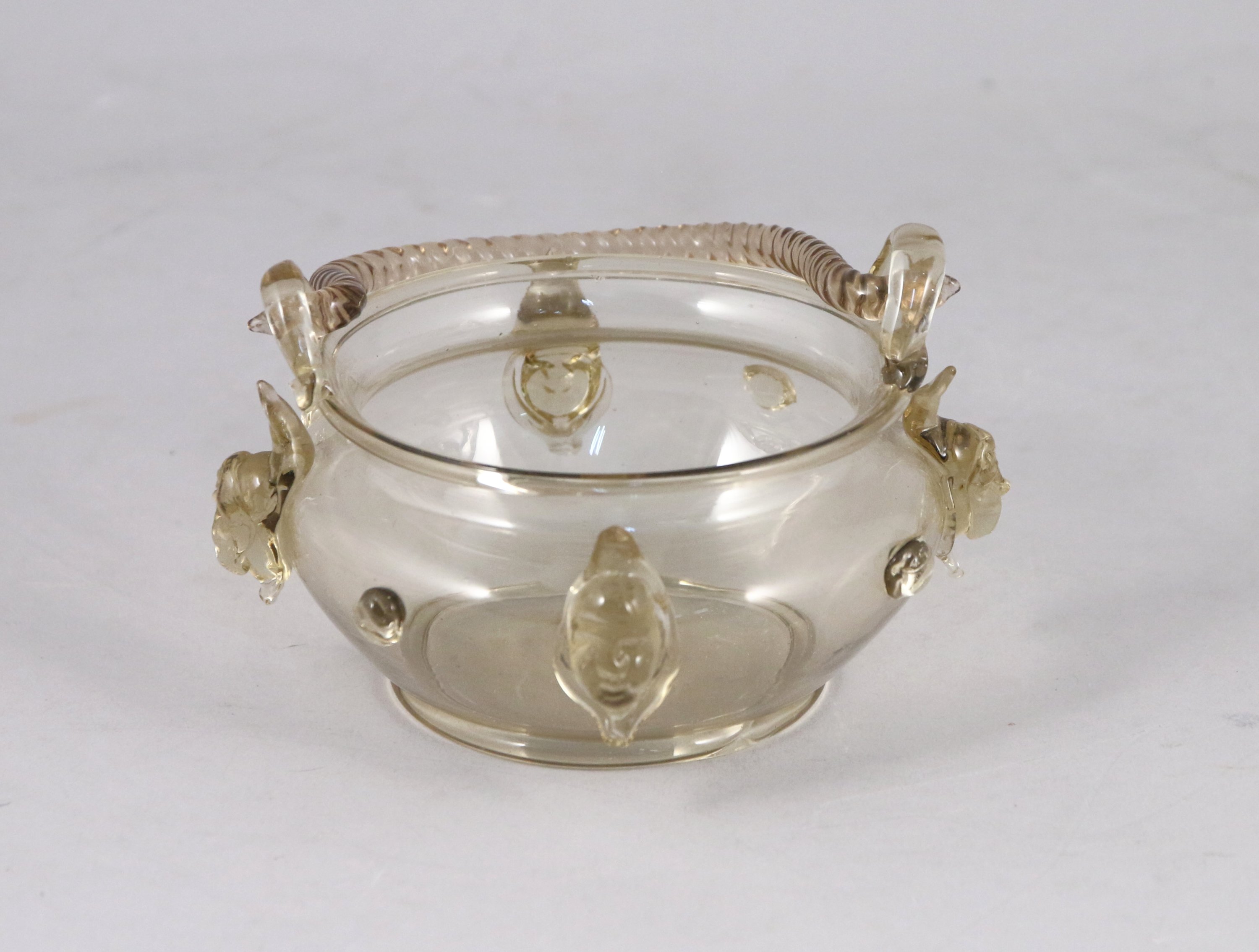 à décor de têtes de personnages saillantes. Anse torsadée mobile.