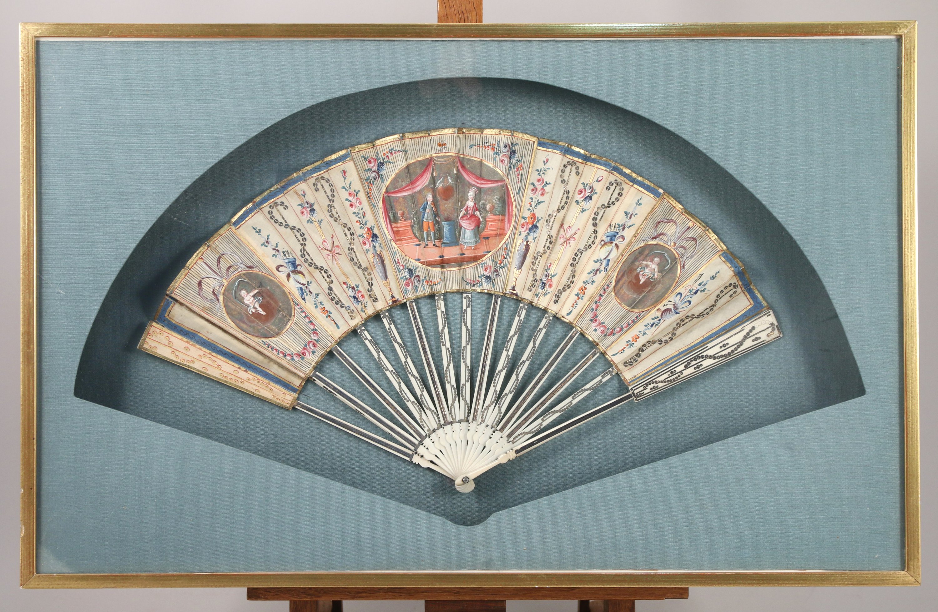 ÉVENTAIL à l'Amour. Soie peinte à la gouache figurant une leçon de musique dans un médaillon central entouré de deux médaillons à l'amour coiffés de noeuds, l'un tenant un arc fléché l'autre une guirlande fleuries. Des pots fleuris et carquois parent le reste de la feuille en alternance de guirlandes pailletées descendant sur les seize brins en ivoire-os.