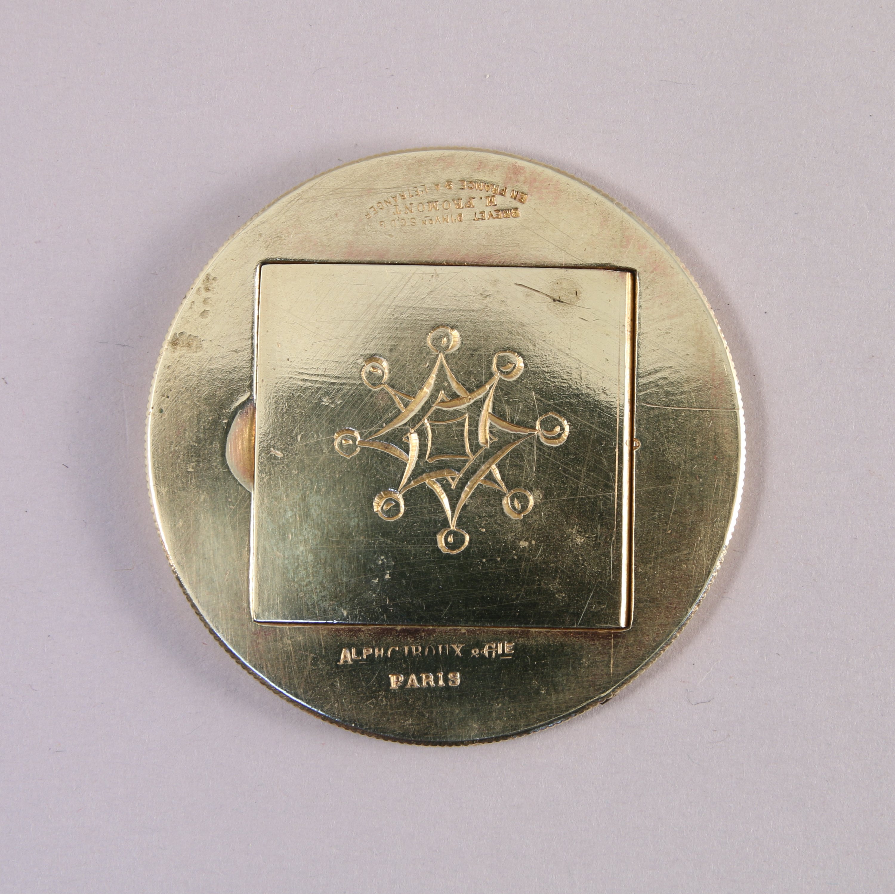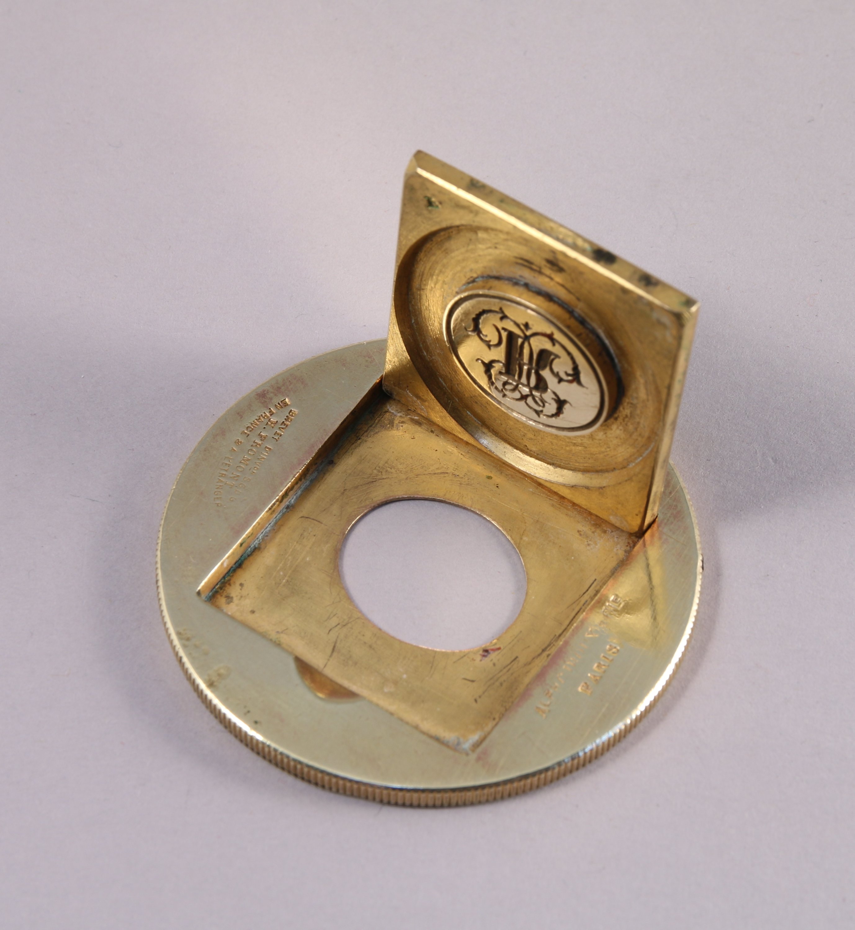 de forme circulaire en bronze doré. Il est centré d'une matrice de forme ovale monogrammée "PR" inscrite dans un carré ouvrant par une charnière. Elle est encadrée d'une rosace gravée. Le dessus, gravé d'une étoile à huit branches pommelées est signé "Alph GIROUX & Cie / Paris" et marqué "Brevet d'invon SGDG / M. FROMONT / en France & à l'étranger". Tranche cannelée.