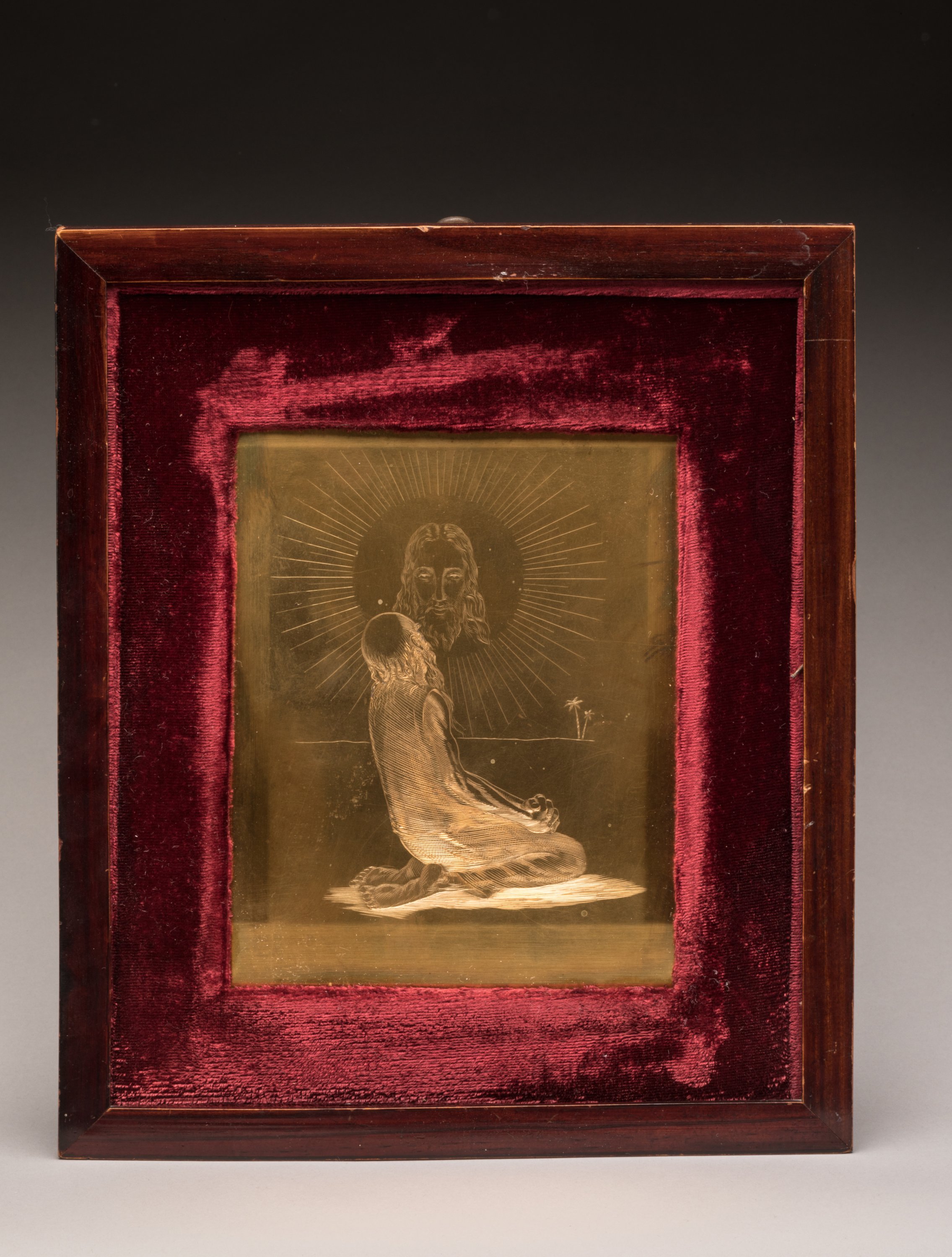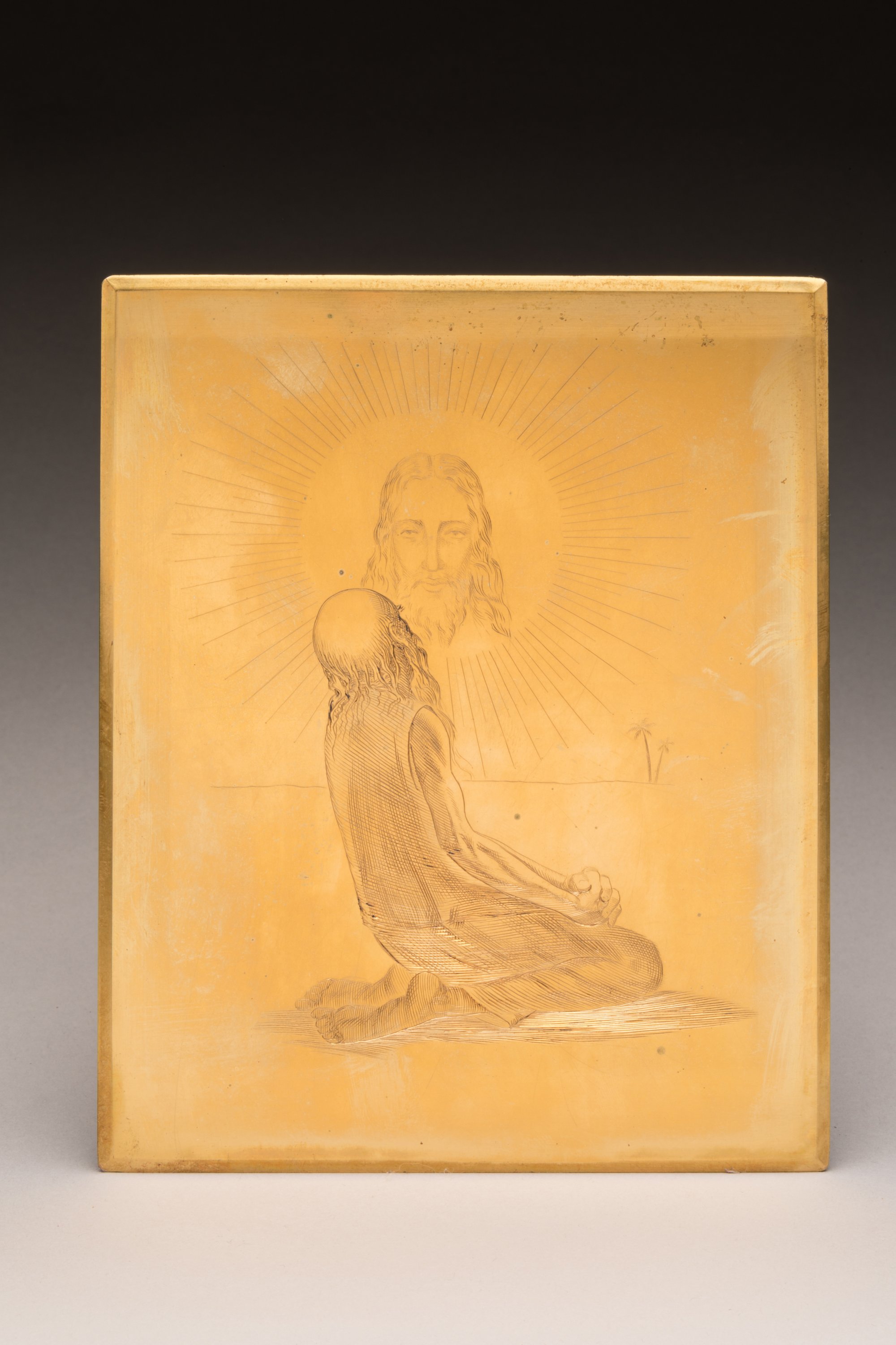 gravée d'une scène religieuse. Un homme agenouillé dans le désert devant l'apparition de la sainte Face.
