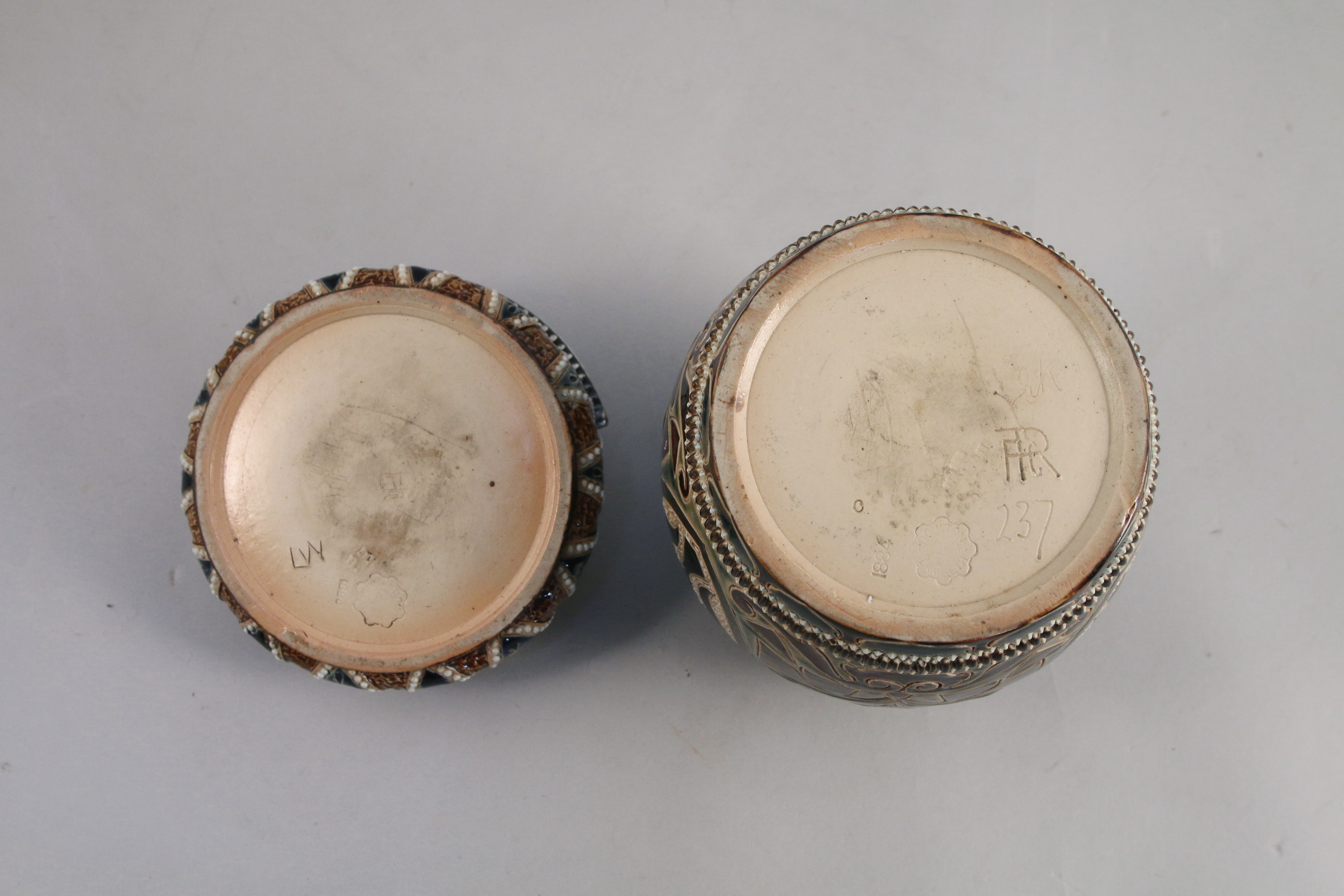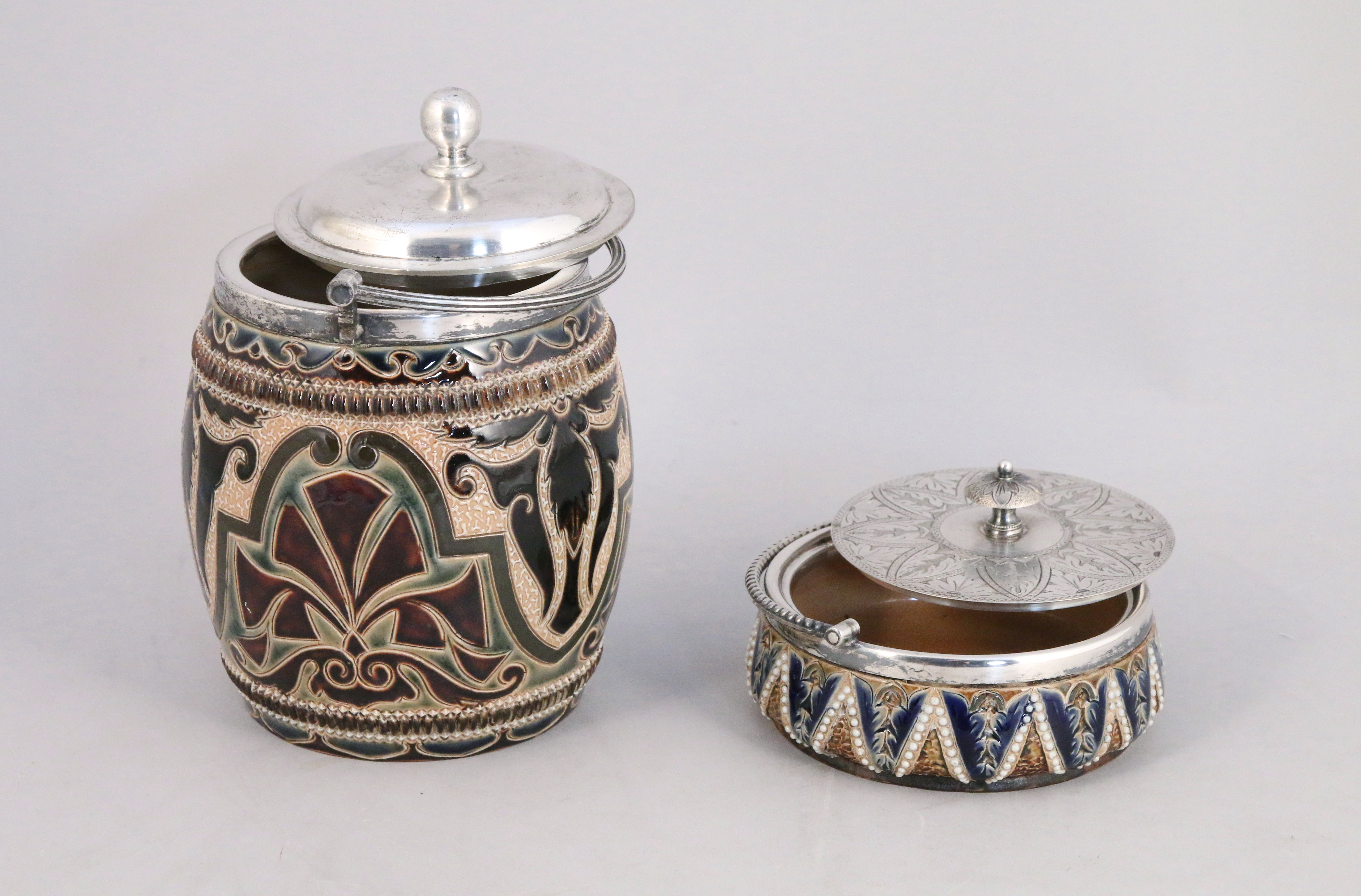 - L'UN à décor d'une frise de feuillage stylisé et perles bleu et brun,cerclage et couvercle en métal à décor gravé d'une rosace. Cachet sous la base : DOULTON LAMBETH 1880. Haut. 4, Diam. 10,5 cm.