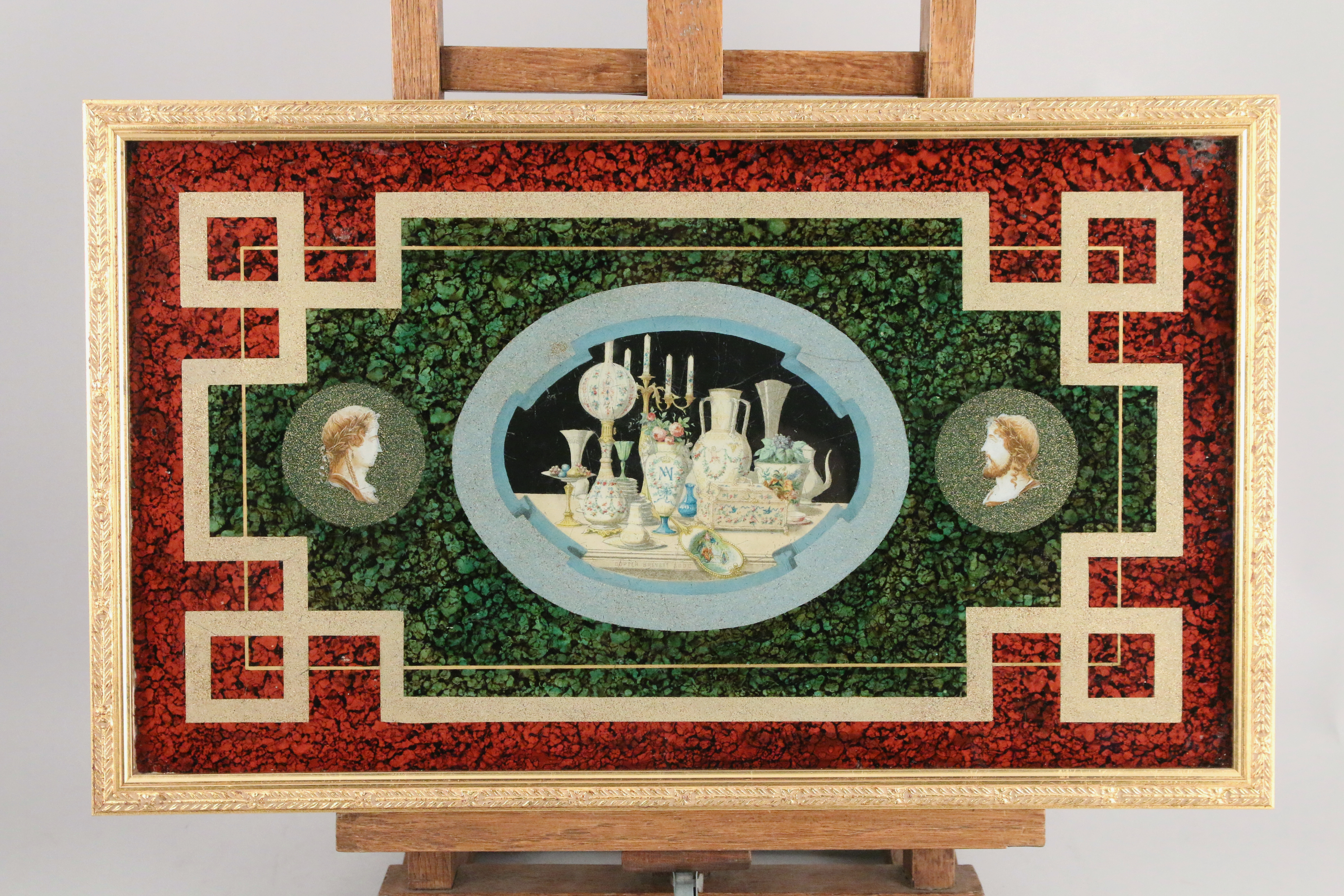 Trois chromo-lithographies, une nature morte et deux camées antiques, dans un entourage en verre façon églomisé, de frises à la grecque aventurine sur faux marbre vert et rouge.