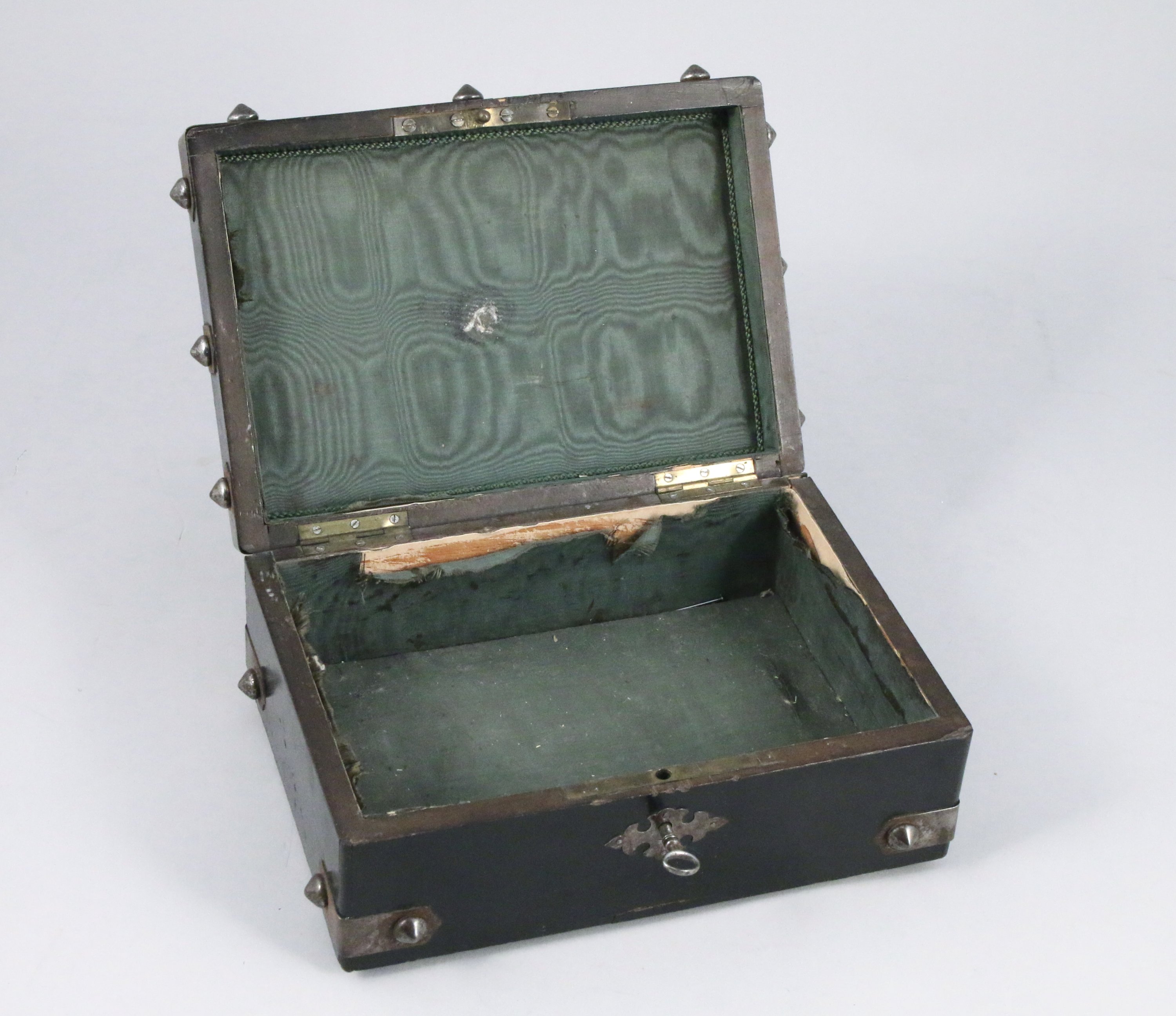 à riche ornementation de ferrrures et cabochons en fer. L'intérieur tapis d'un tissus vert moiré.
