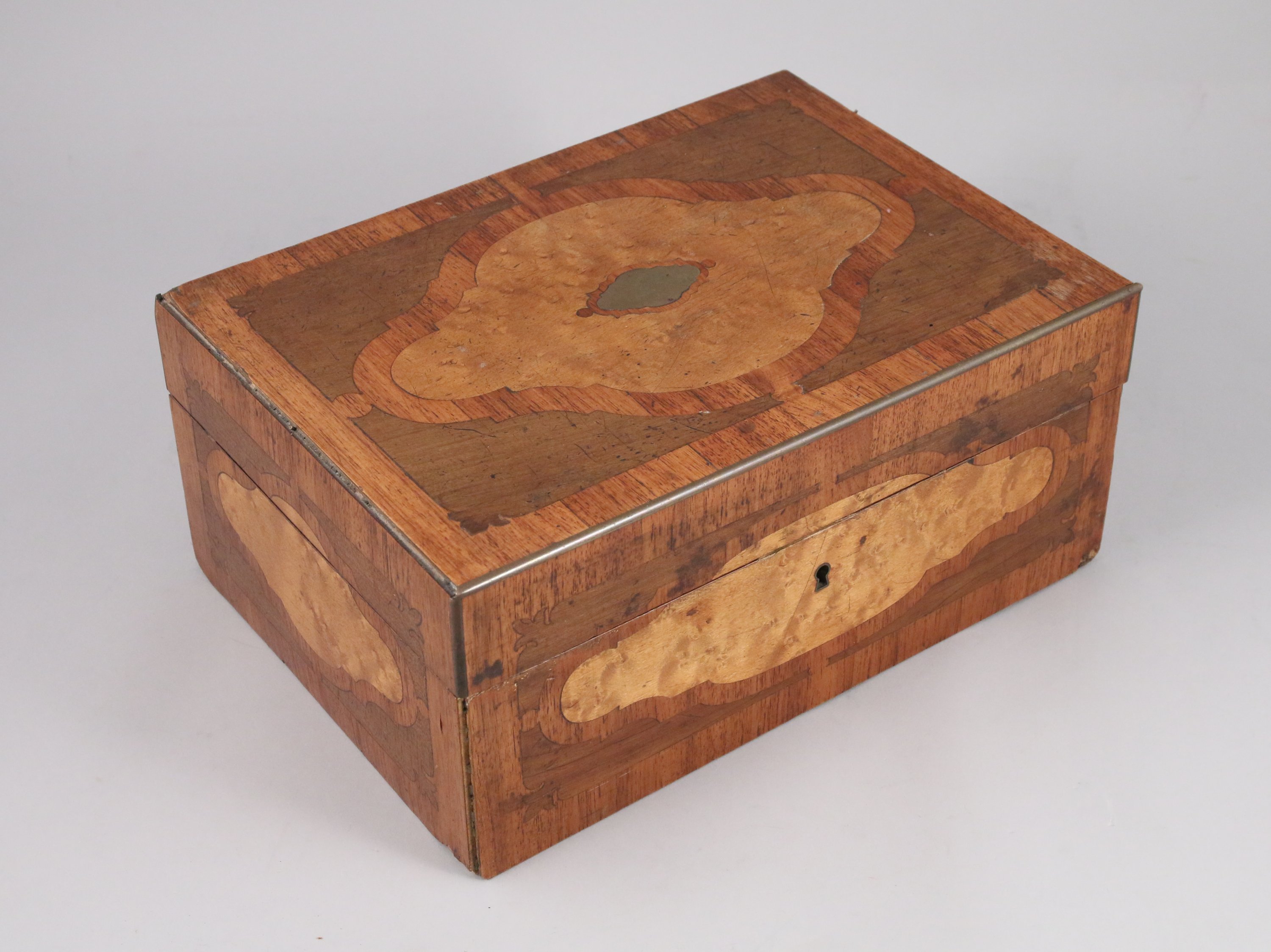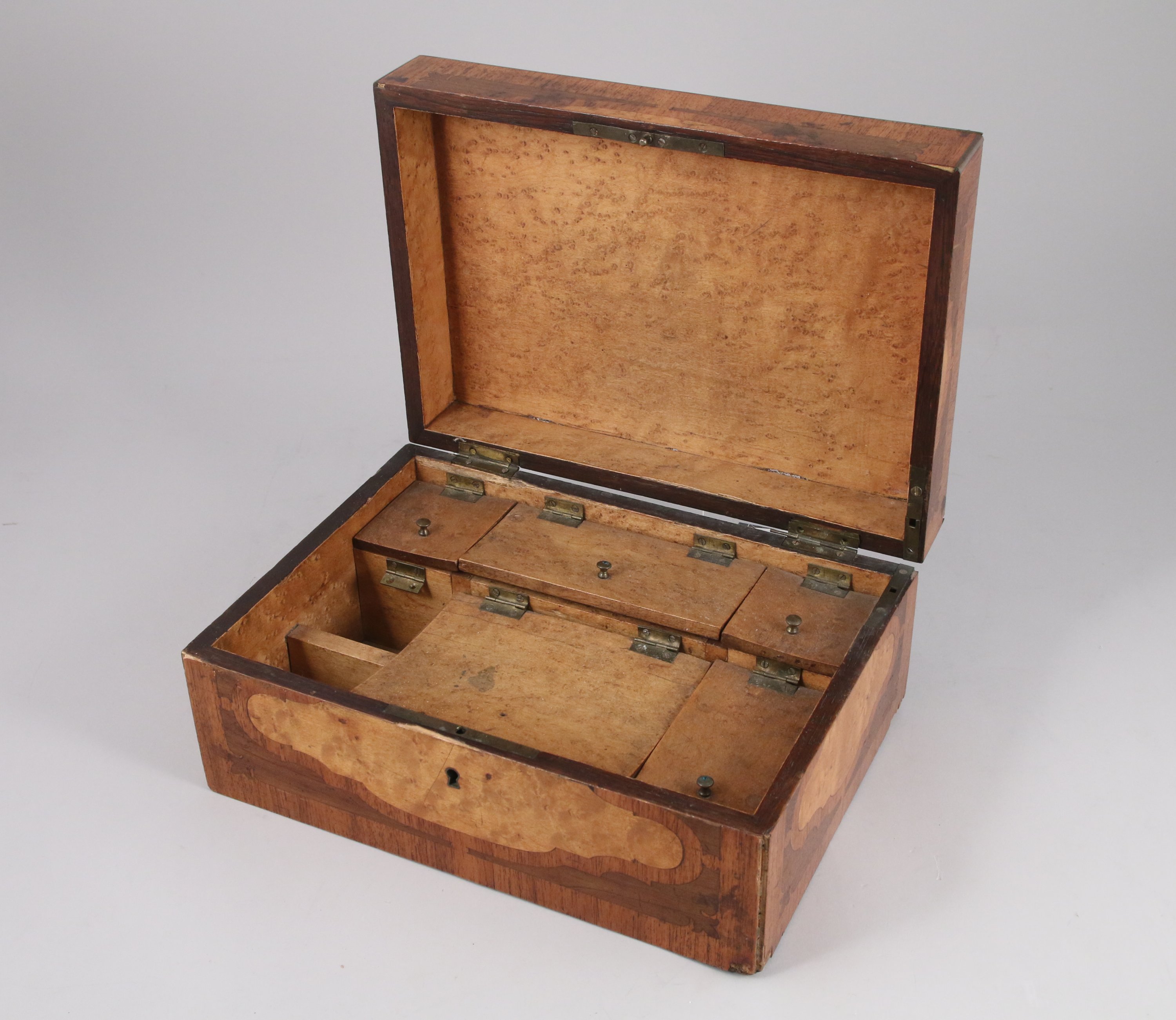 toute face en loupe d'érable, pallisandre clair et noyer d'Amérique et orné au centre d'un médaillon en cuivre. Intérieur composé de six compartiments couverts par cinq battants.