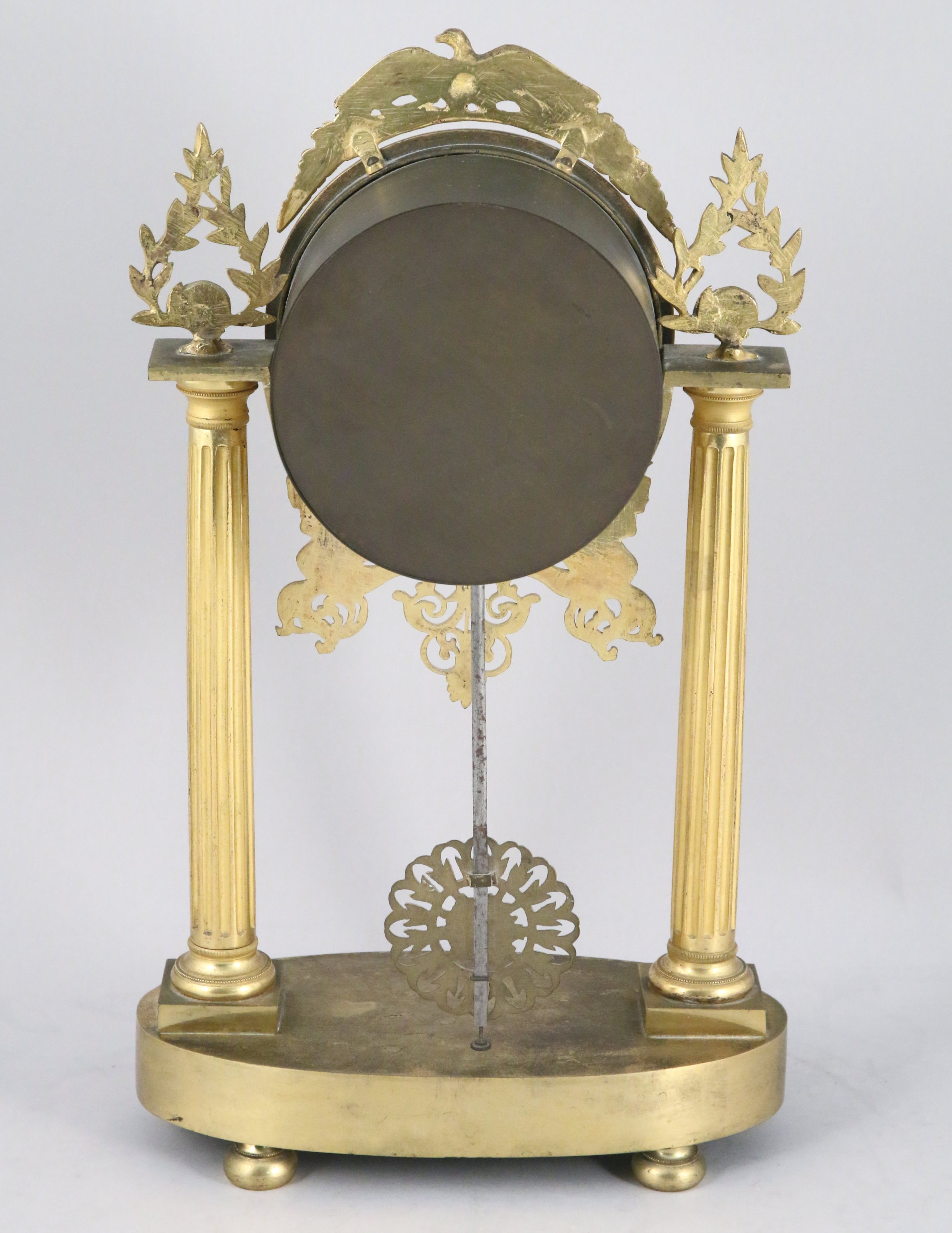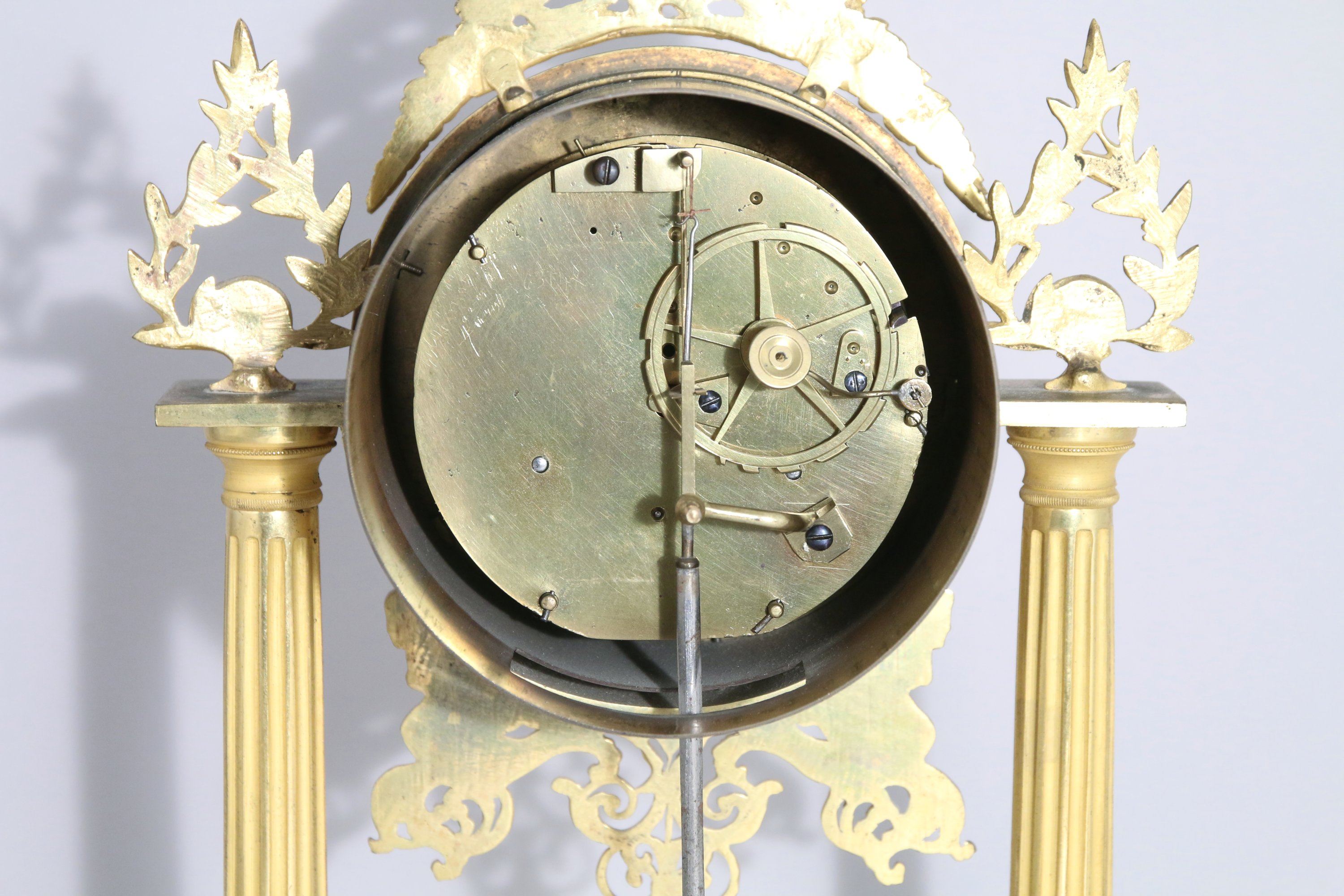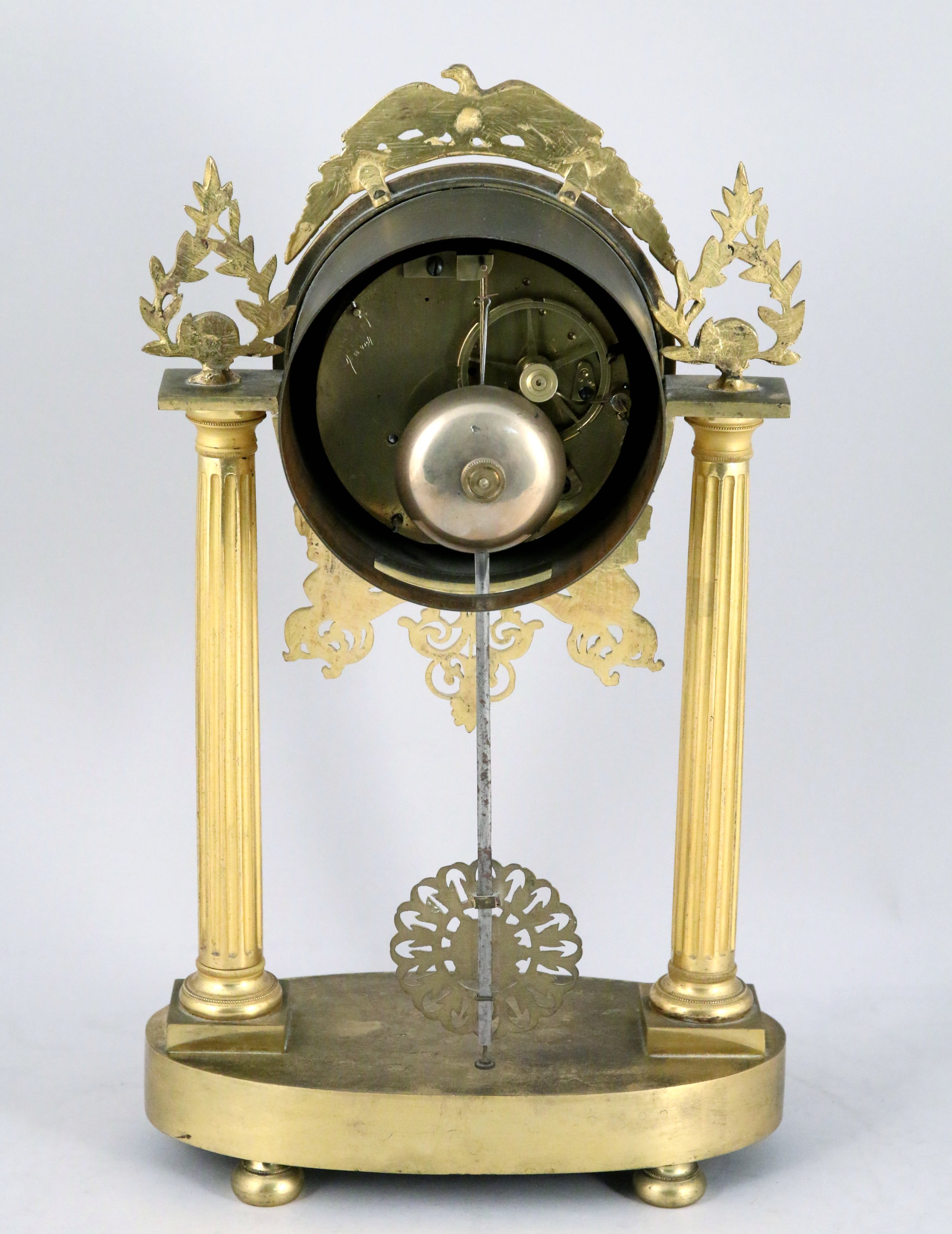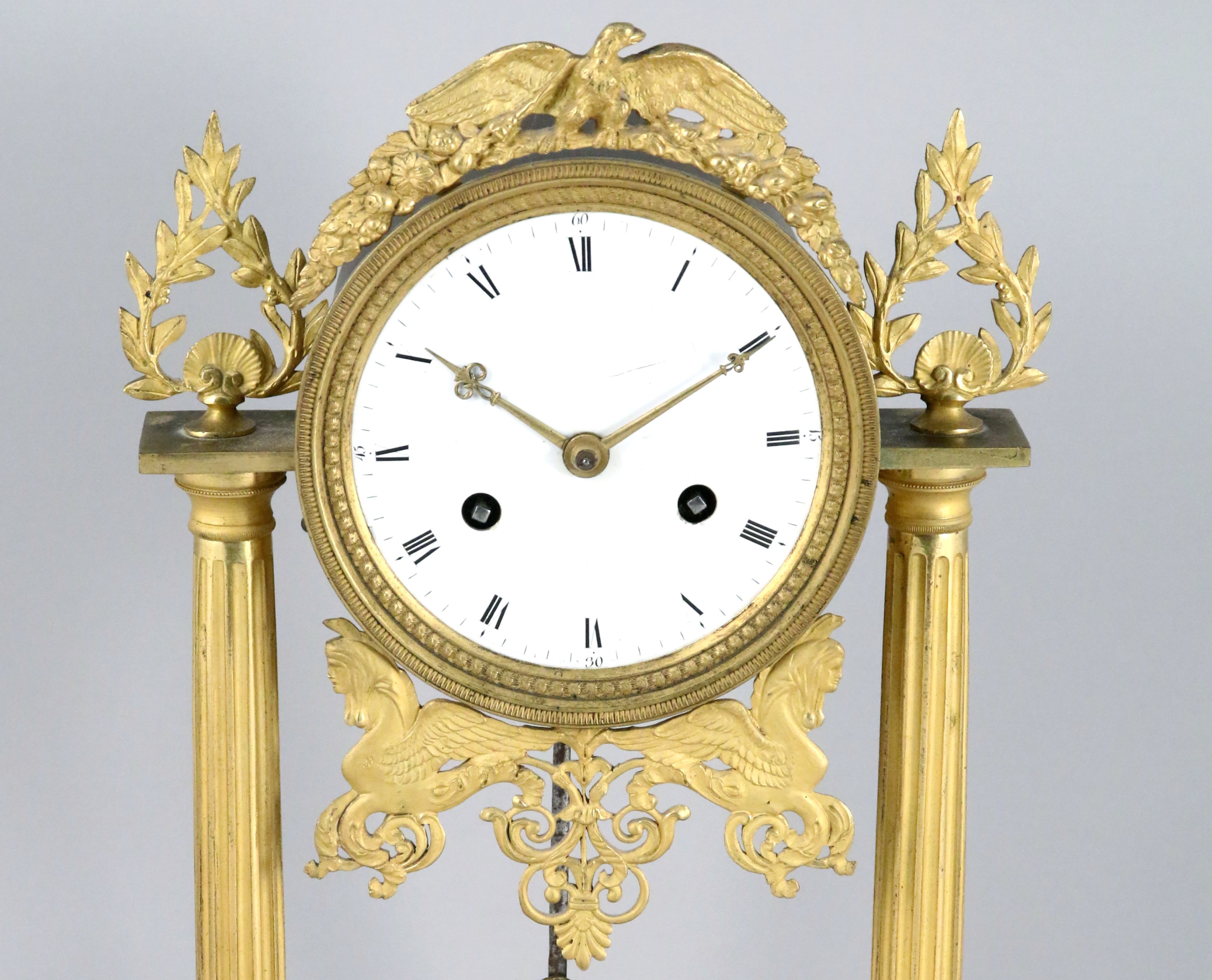 coiffée d'un aigle aux ailes déployées tenant entre ses serres une guirlande fleurie. Deux branches affrontées de laurier reposant sur une coquille Saint-Jacques entourent le cadran circulaire soutenu par deux colonnes doriques cannelées supportées par une base ovale se terminant par quatre pieds boules. Deux sphinges séparées par des enroulements se terminant par une palmette ornent la partie centrale. Le balancier à décor de tête dans un soleil rayonnant entouré de motifs végétaux. Le cadran émaillé indiquant les heures en chiffres romains, les minutes par un chemin de fer.