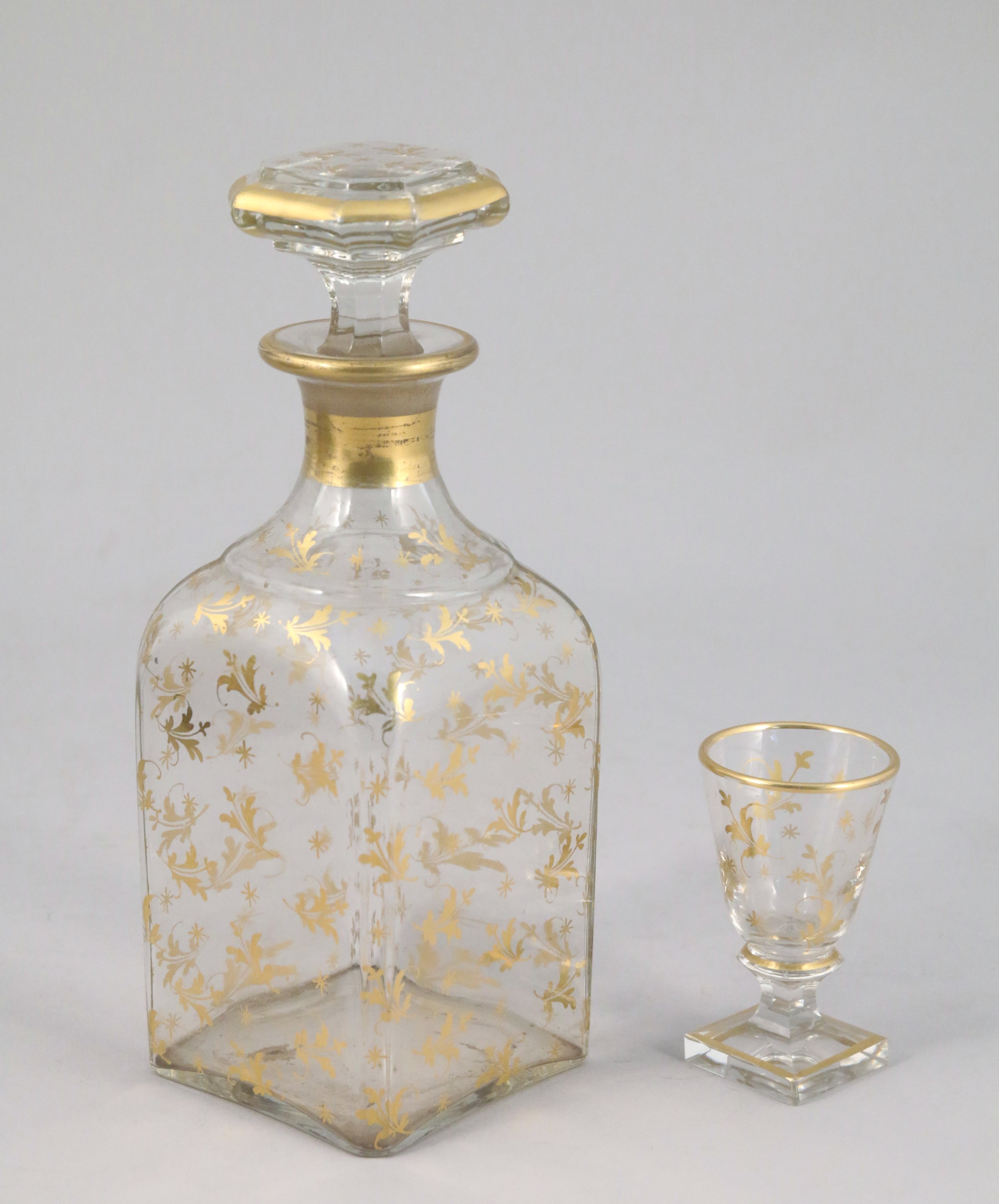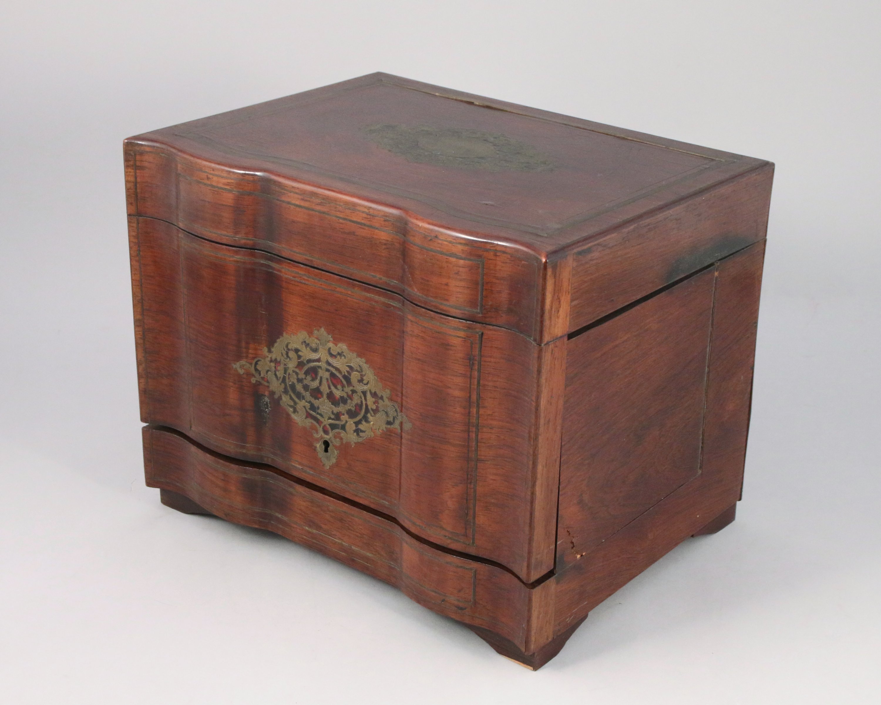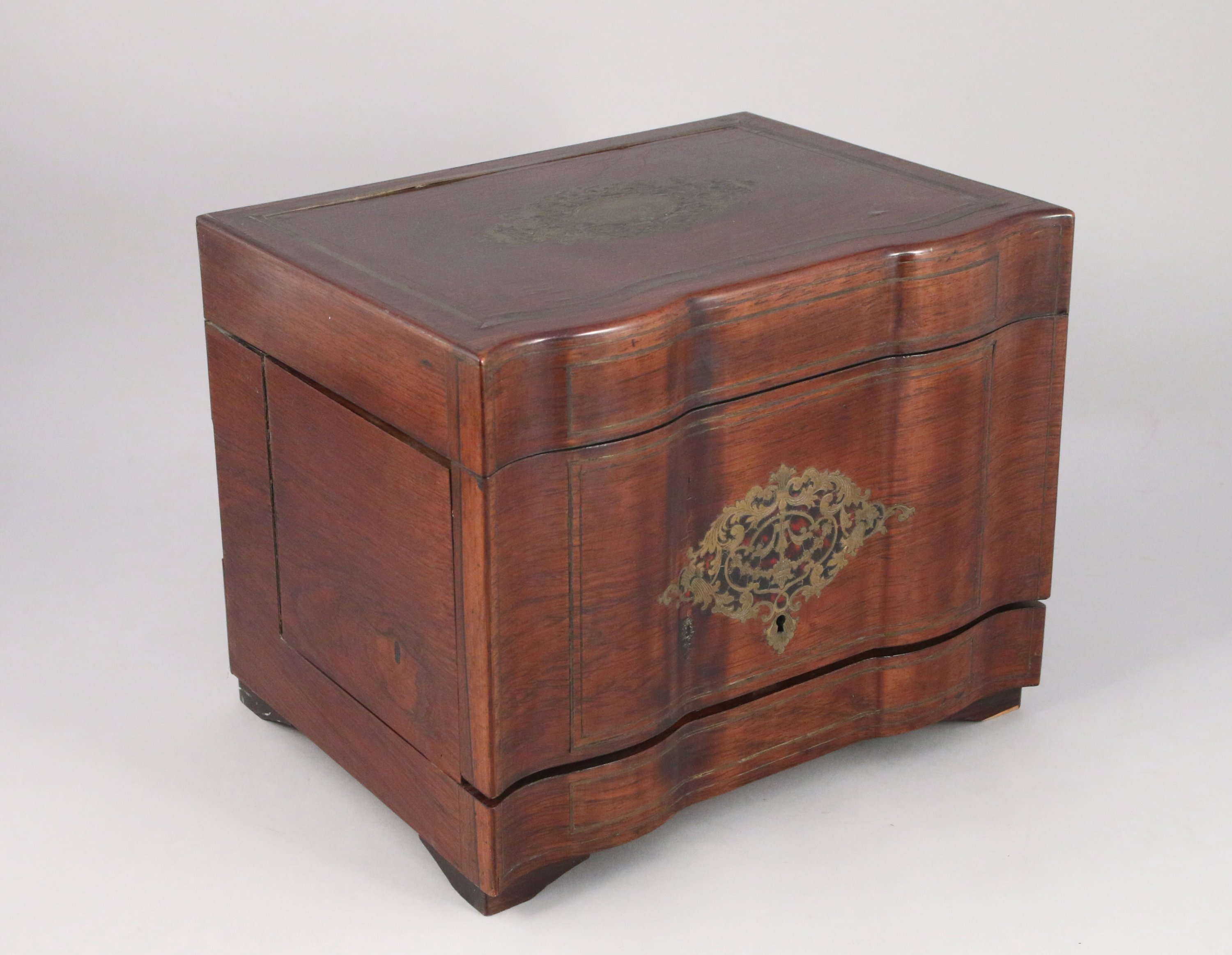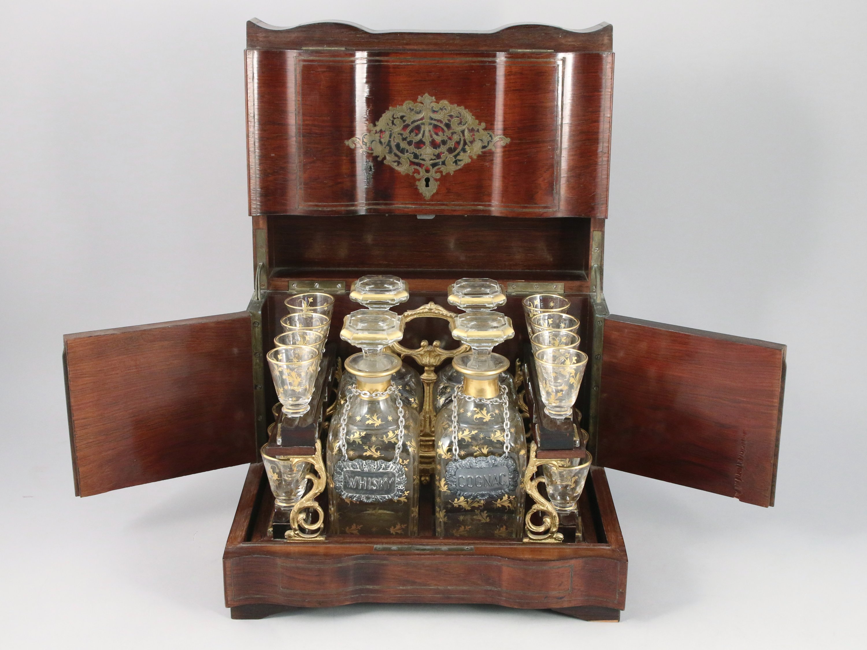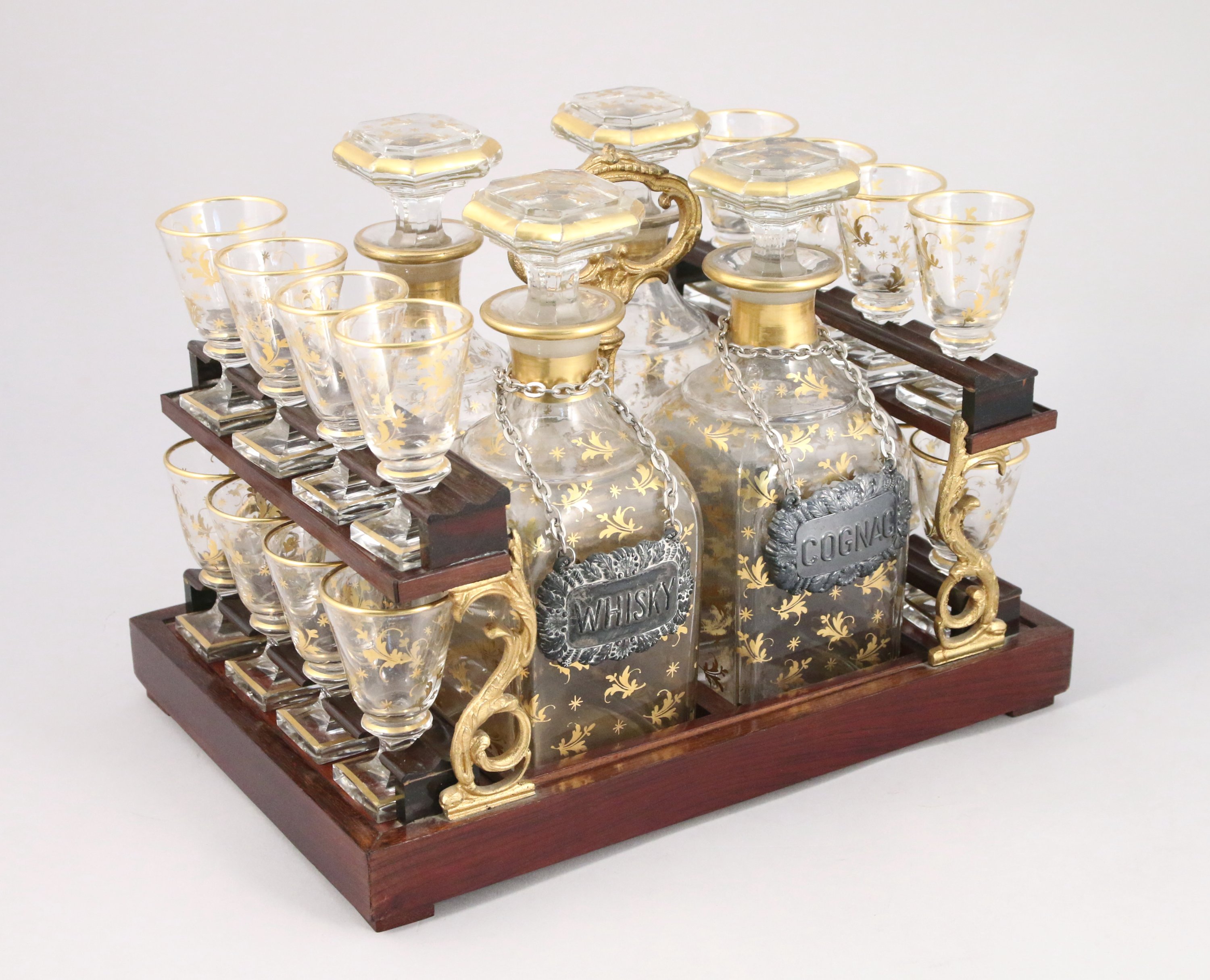 à la façade mouvementée en placage d'acajou, filets de laiton et marqueterie dite Boulle. L'intérieur découvrant seize verres et quatre carafes en cristal.