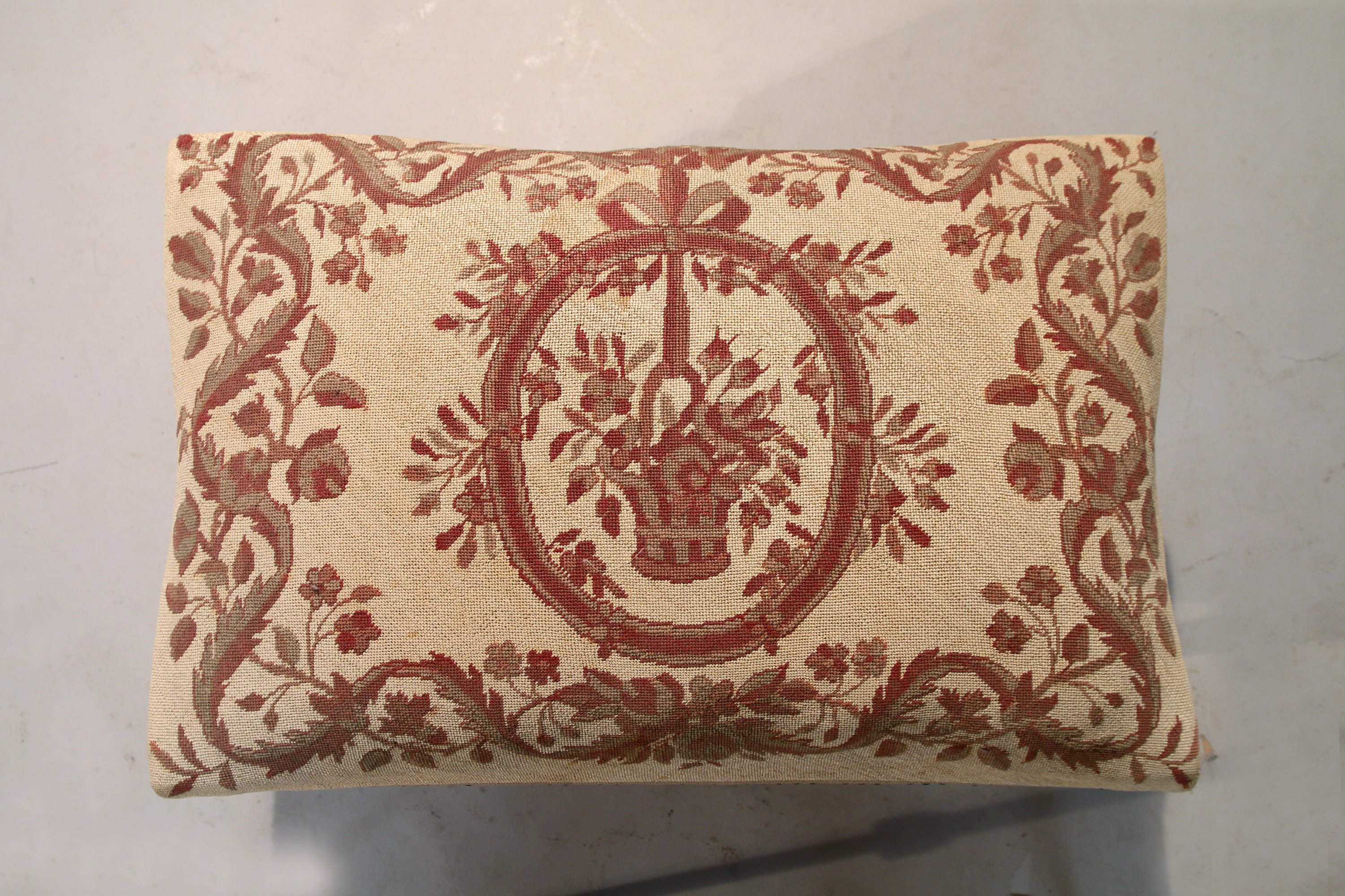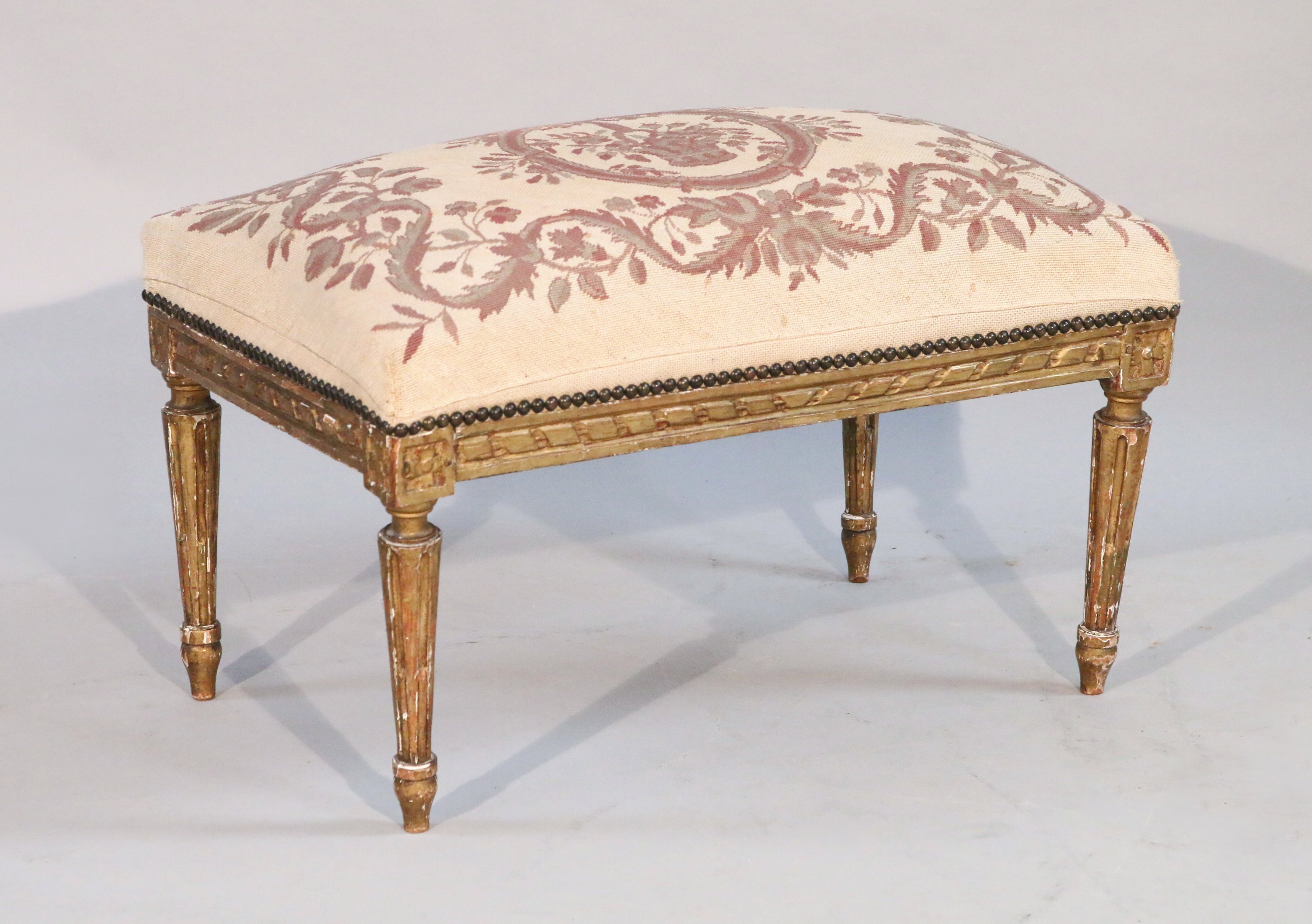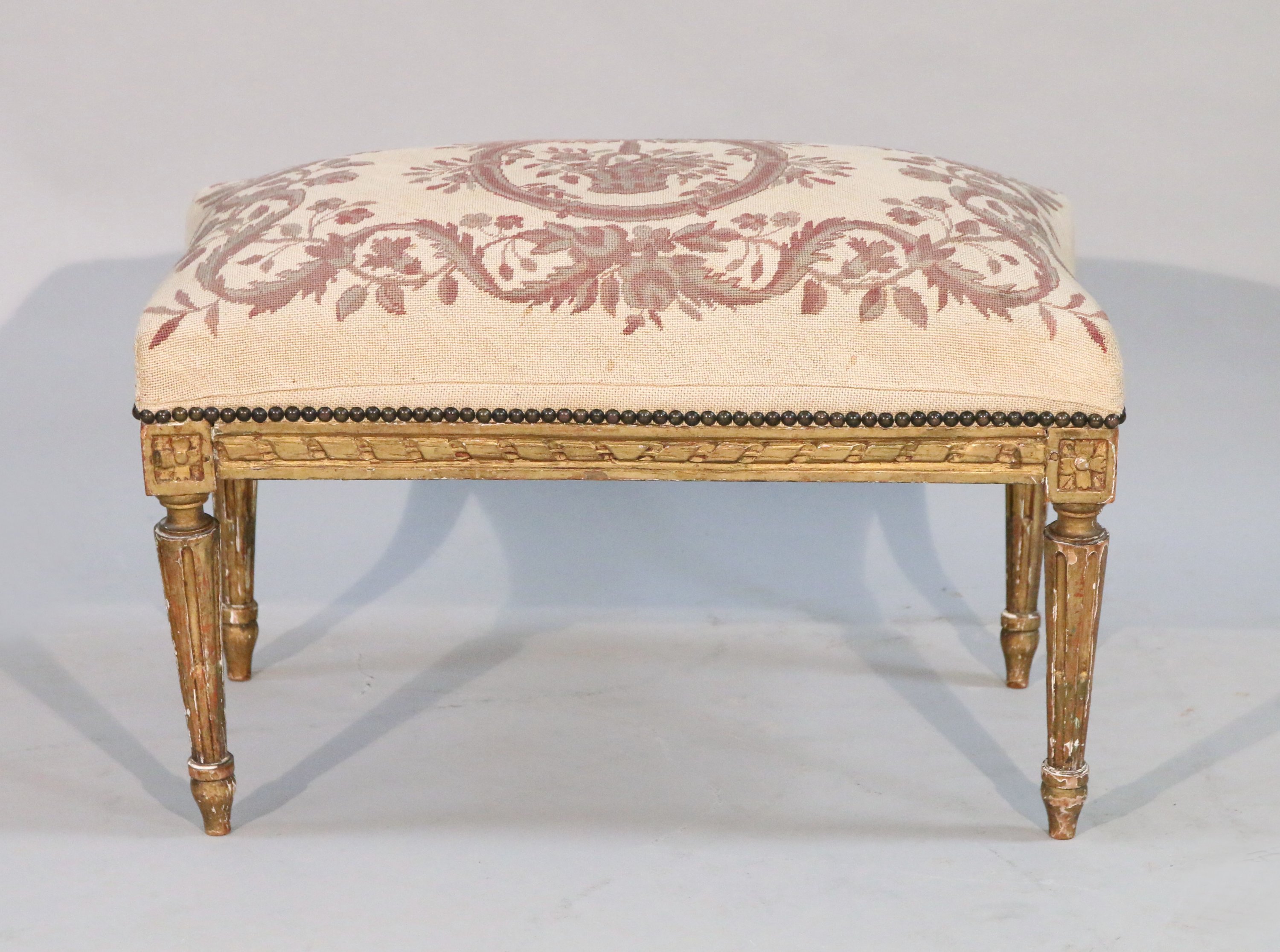 les dès de raccordement à fleurette. Quatre pieds fuselés, cannelés et rudentés. Recouvert d'une tapisserie au petit point à décor de guirlandes fleuries entourant un médaillon central.