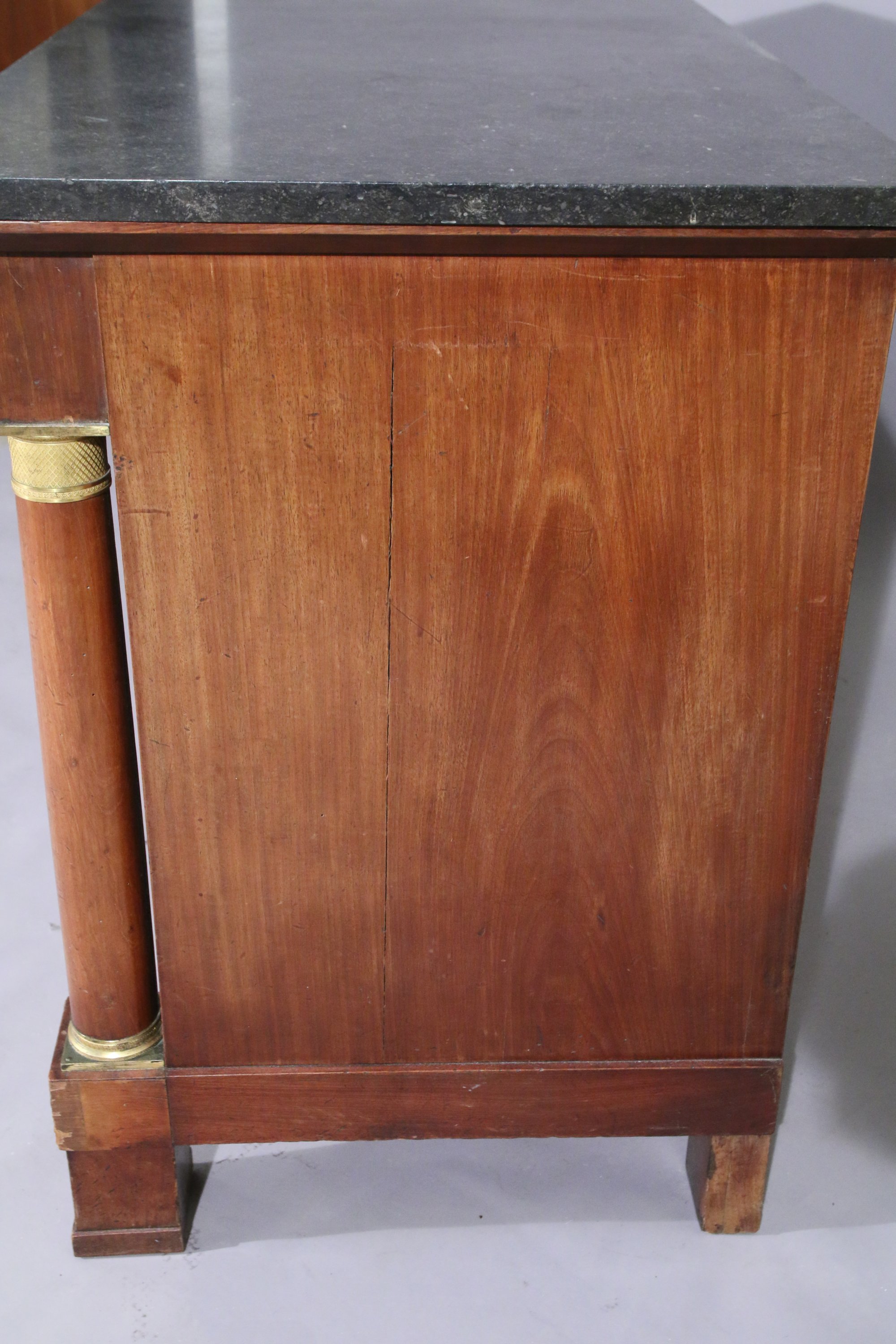 en acajou et placage, flanquée de deux colonne détachées aux chapitaux en bronze doré, elle ouvre par quatre tiroirs dont un dissimulé. Le meuble repose sur une plinthe. Poignées et entrées de serrures aux cornes d'abondances en bronze doré.
