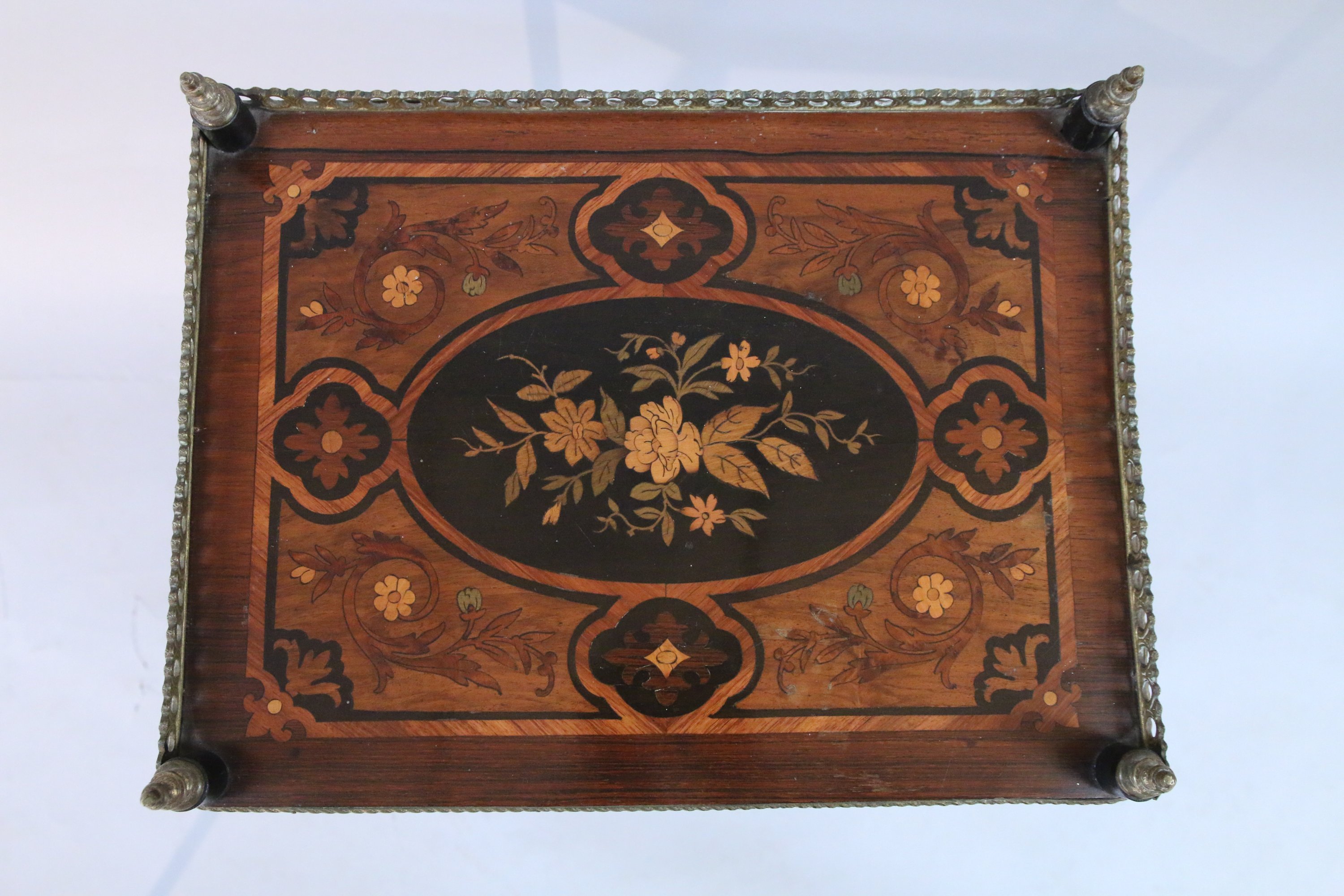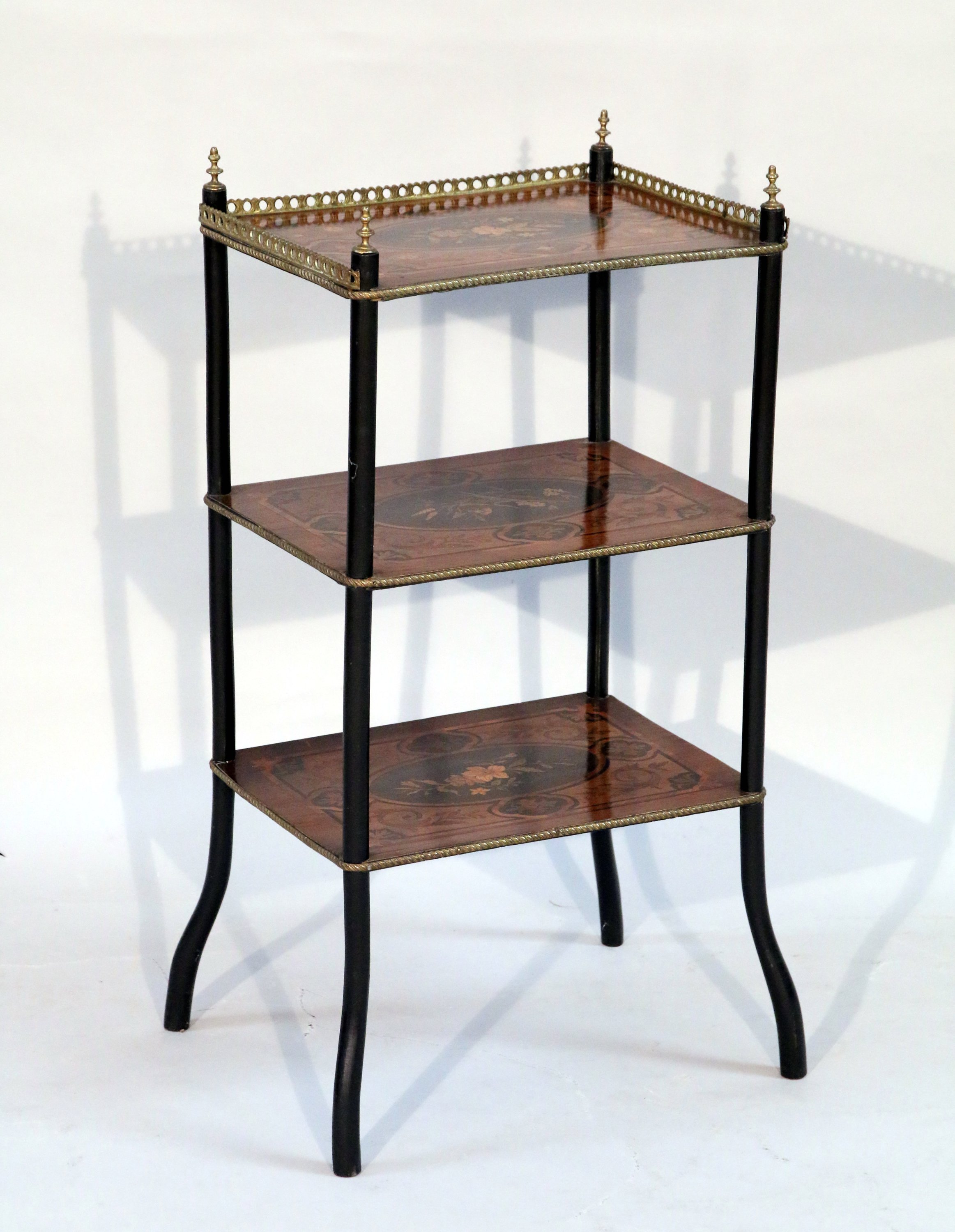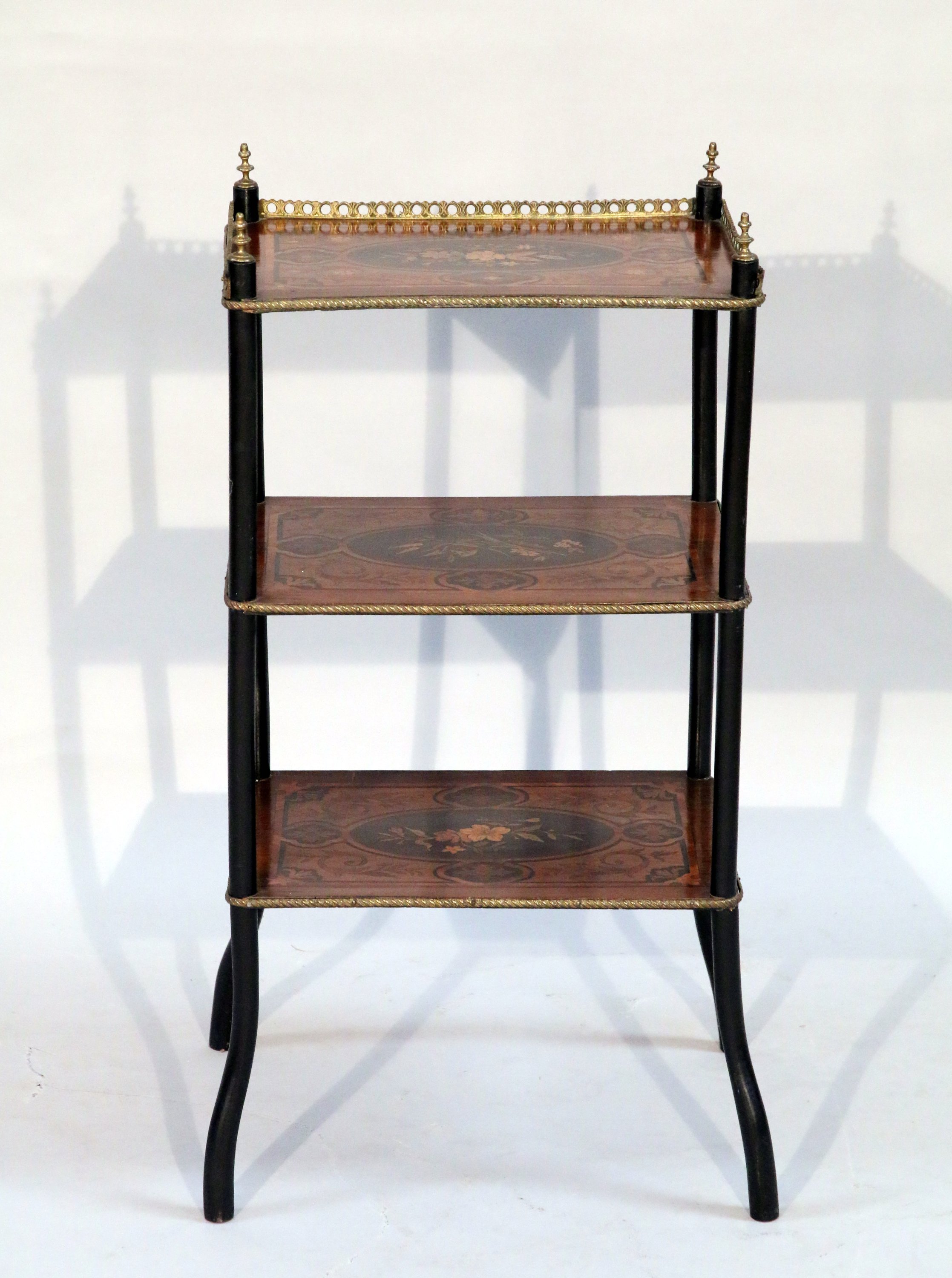 à trois plateaux marquetés à décor de fleurs coupées et rinceaux reposant sur quatre montants et piétement en bois noirci. Ornementation de laiton tels que la galerie ajourée entourant la tablette supérieure, lingotière et toupies.