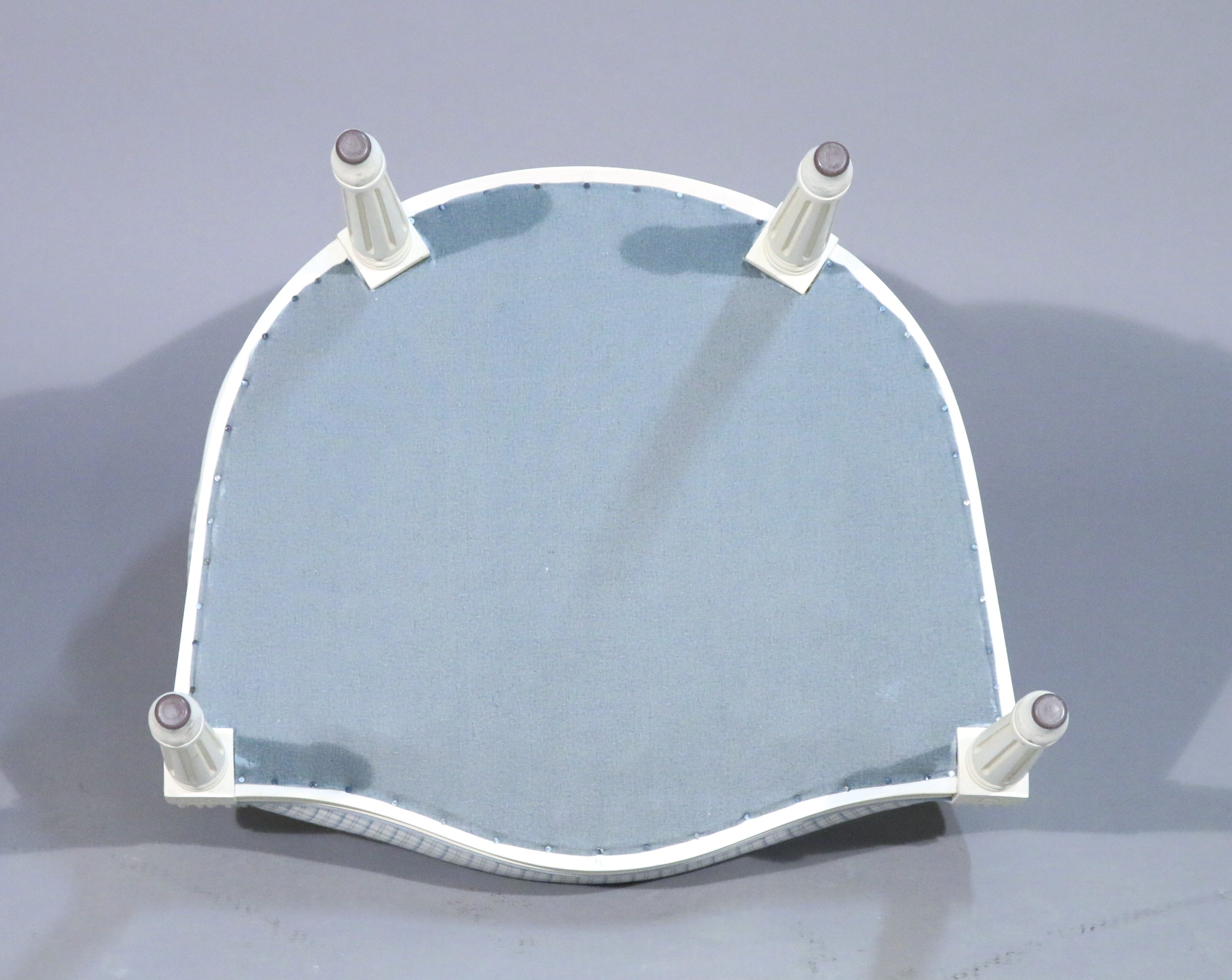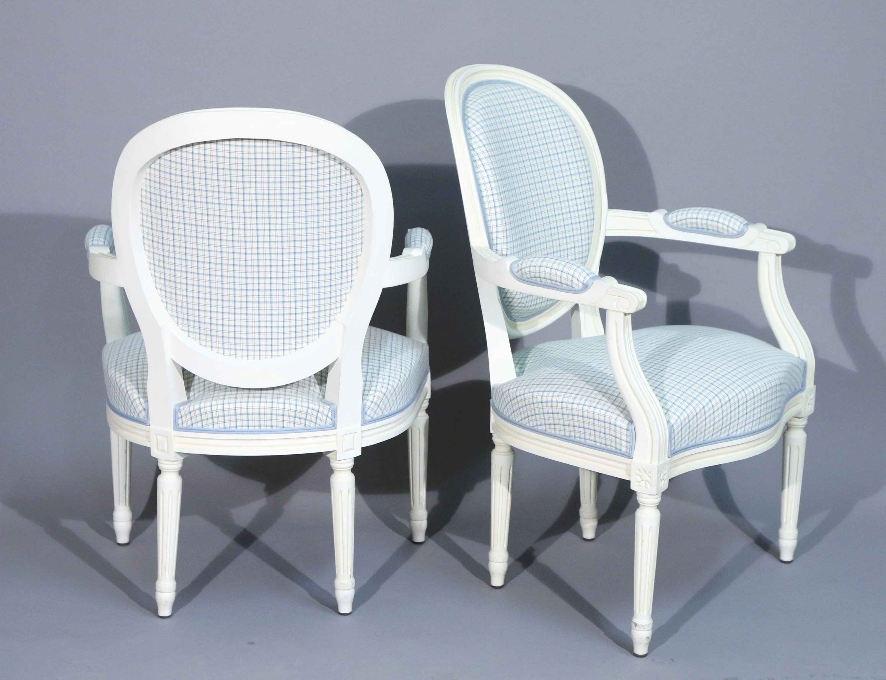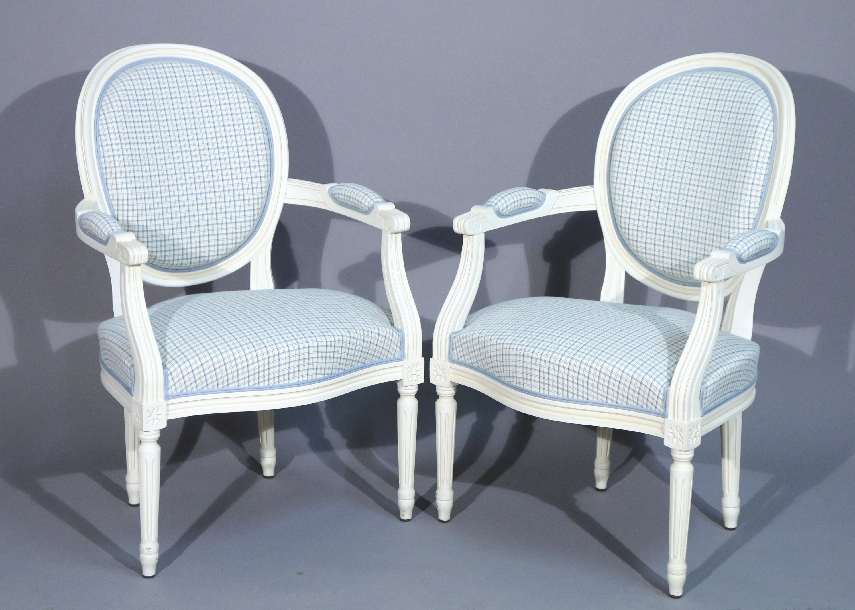 en bois mouluré rechampi blanc à dossier médaillon et accotoirs à manchettes reposant su quatre pieds cannelés.