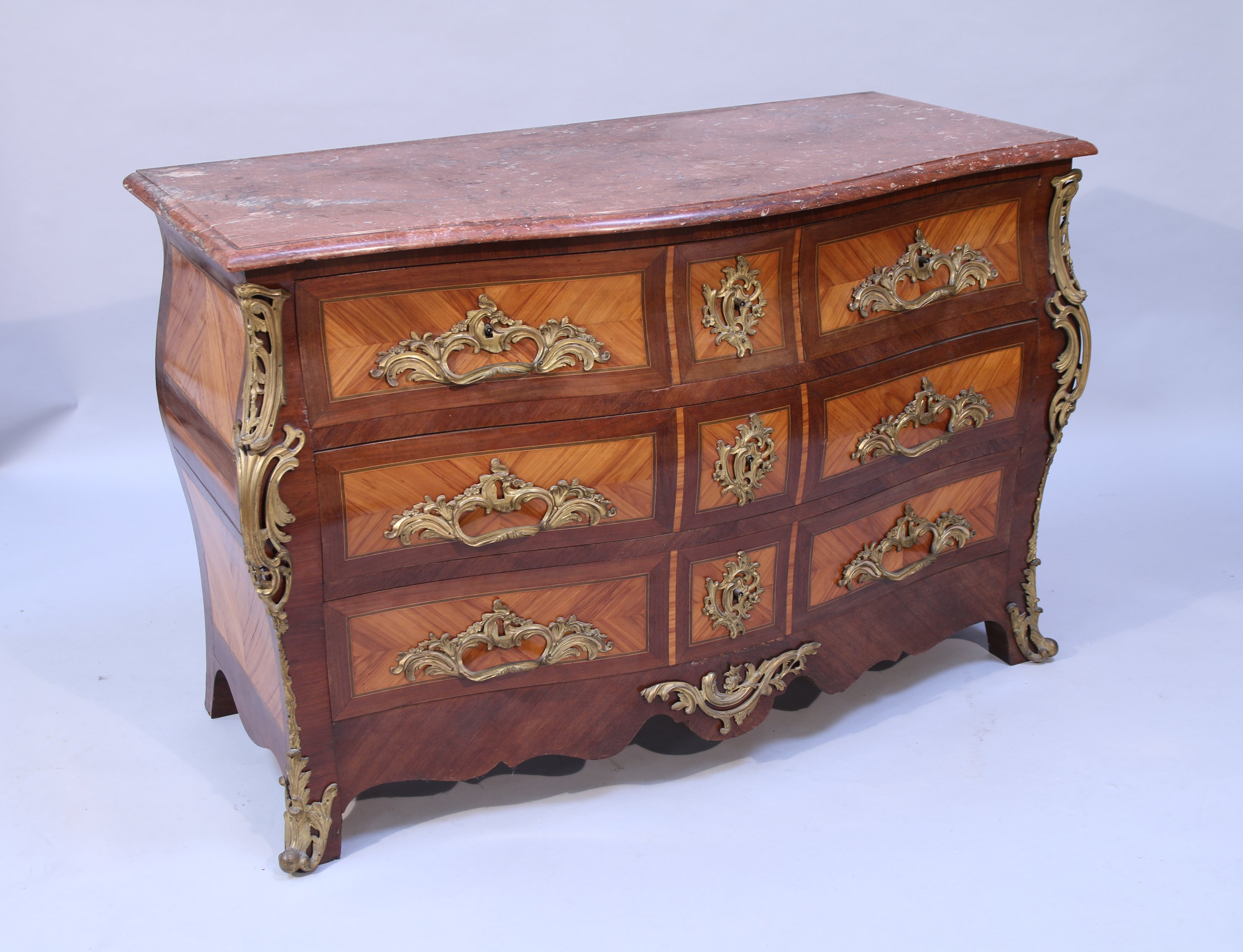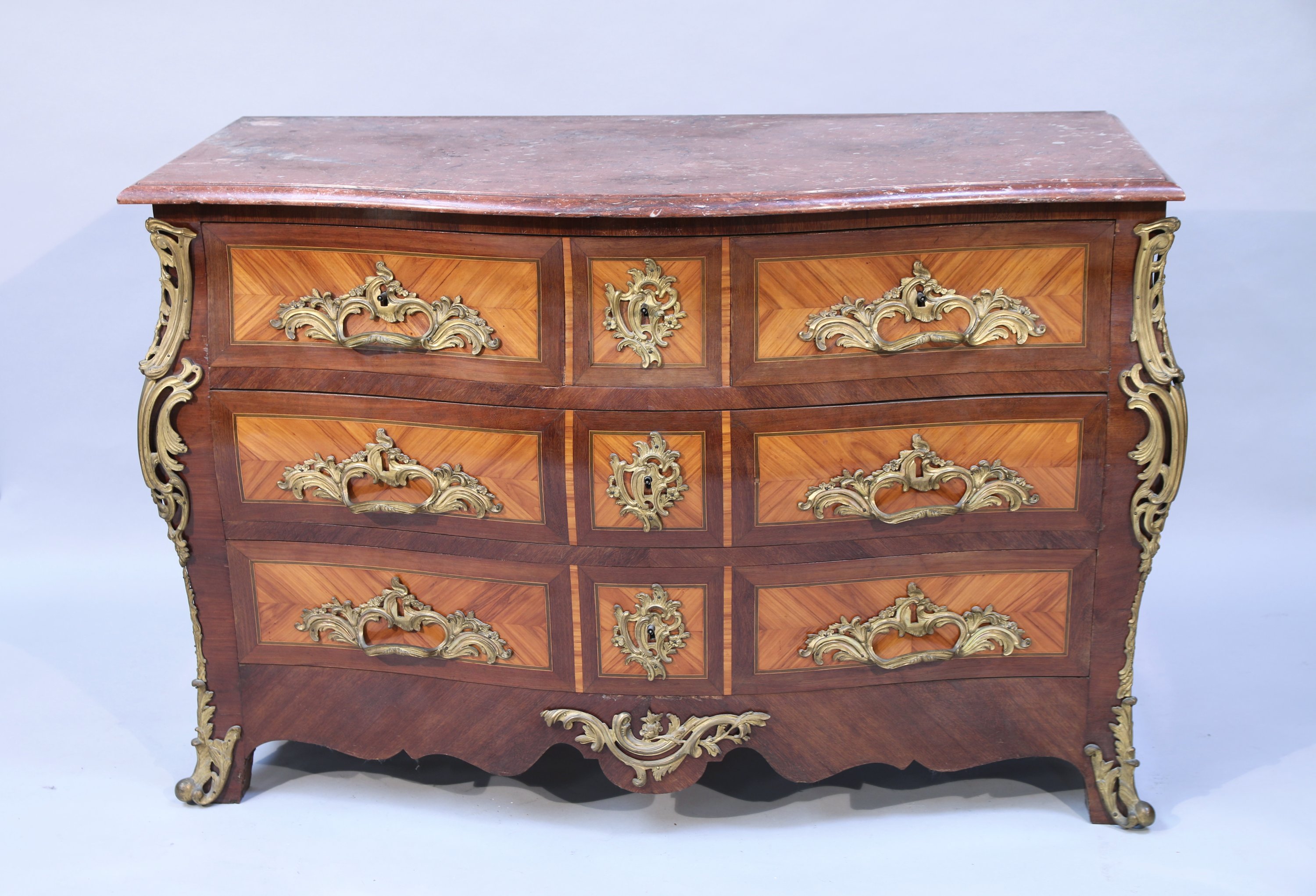 en placage de bois de rose et amarante. La façade galbée ouvrant par cinq tiroirs sur trois rangs. Elle repose sur des pieds cambrés. Garniture de bronze ciselé et doré à décor feuillagé. Dessus de marbre rouge du languedoc à bec de corbin.