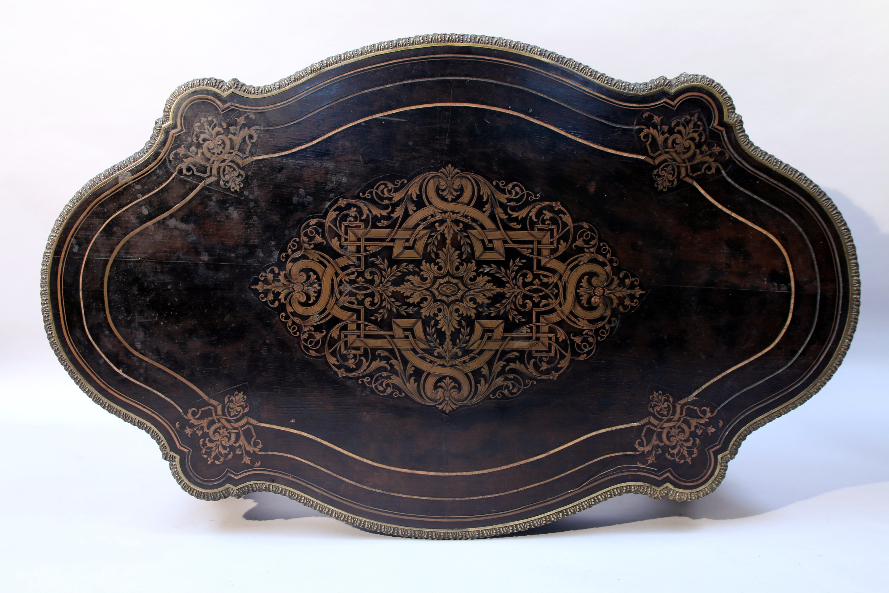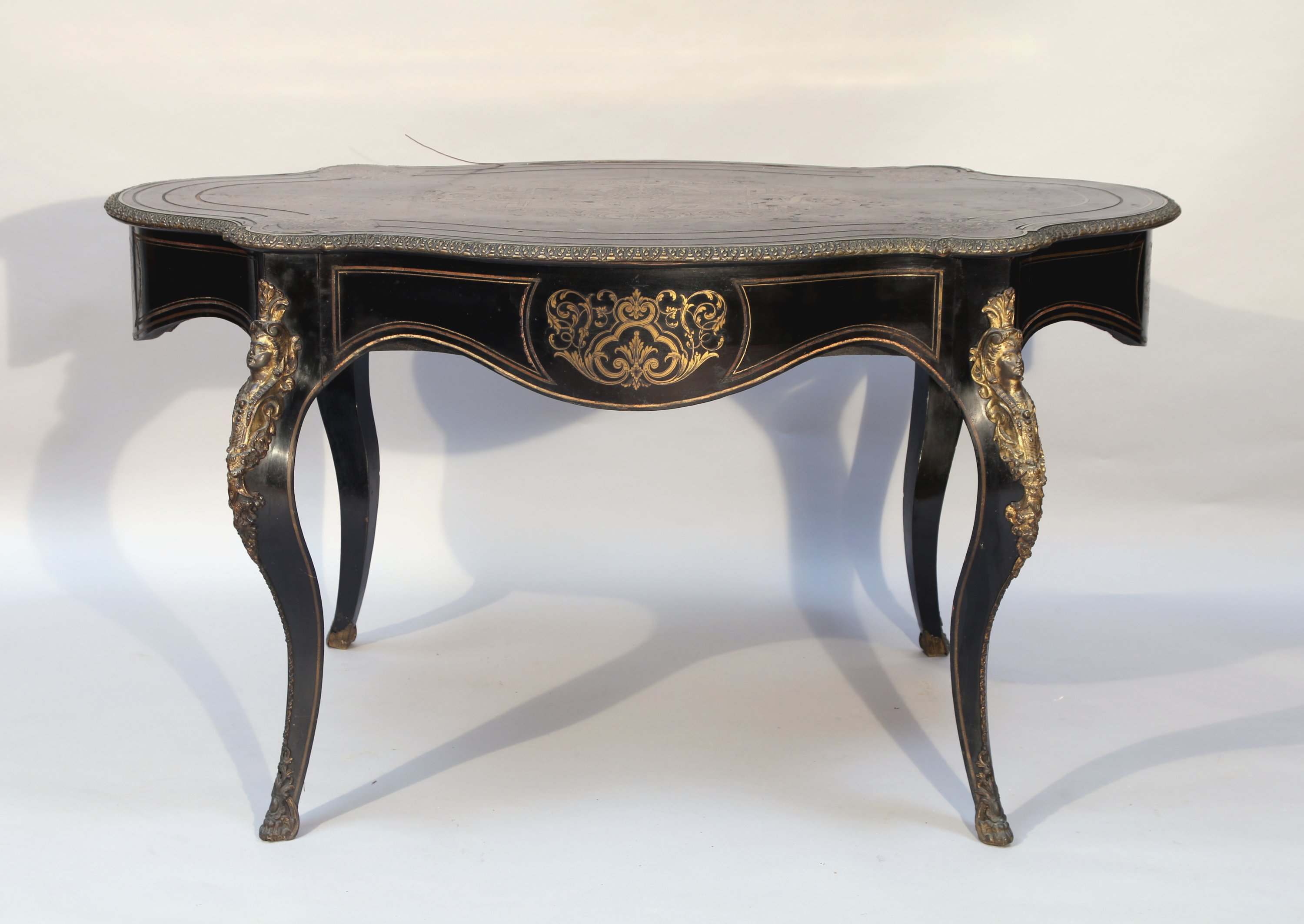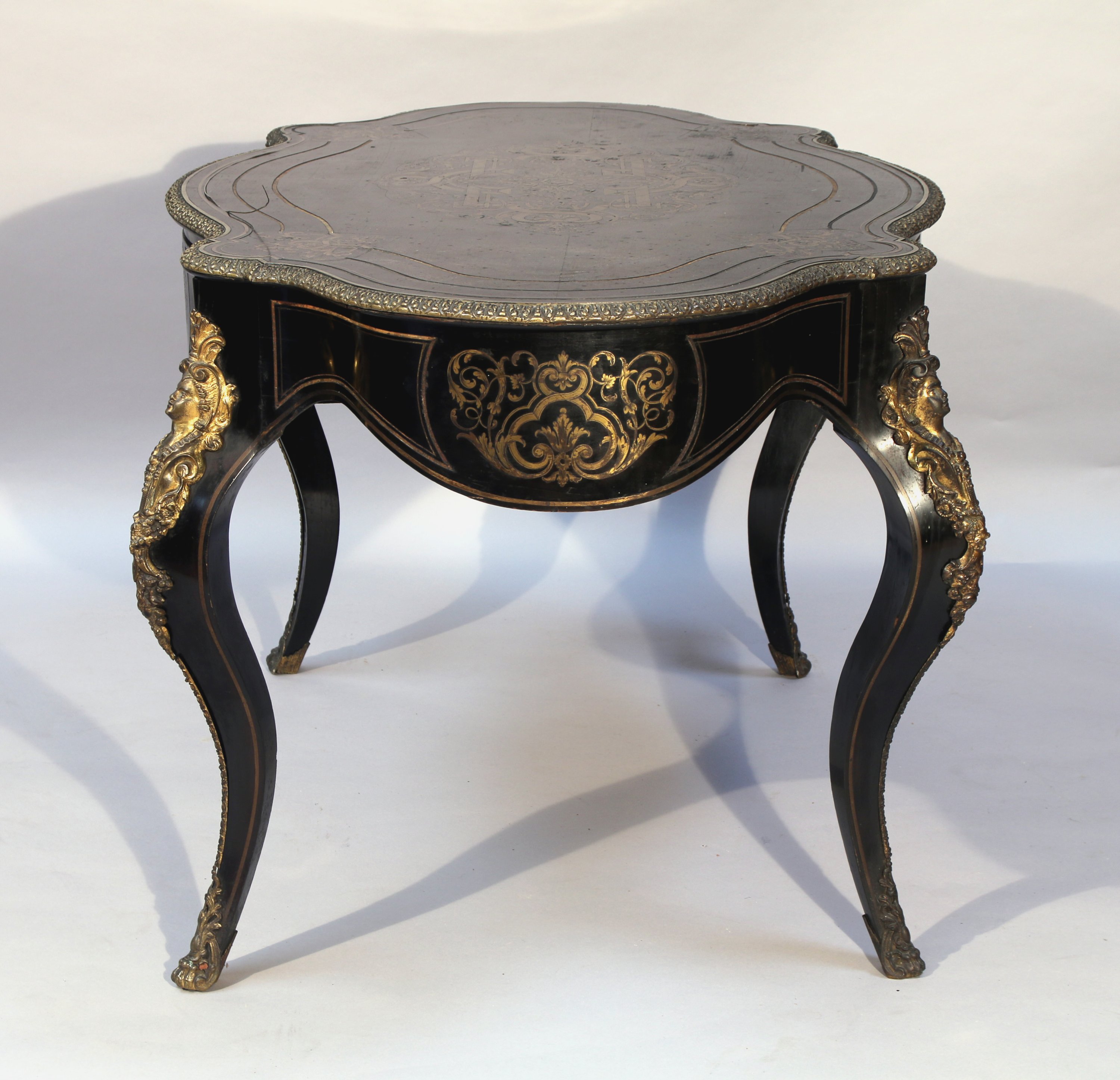 en placage de bois noirci ouvrant par un tiroir en ceinture. Riche décor de fleurons, ferronneries, rinceaux feuillagés et filets en marqueterie de laiton, tant sur le plateau que sur les traverses chantournées. Le plateau est ceint d'une lingotière à frise d'oves et de feuillages. Elle repose sur quatre pieds cambrés agrémentés de bronzes tels qu'une espagnolette en partie supérieure et de sabots.