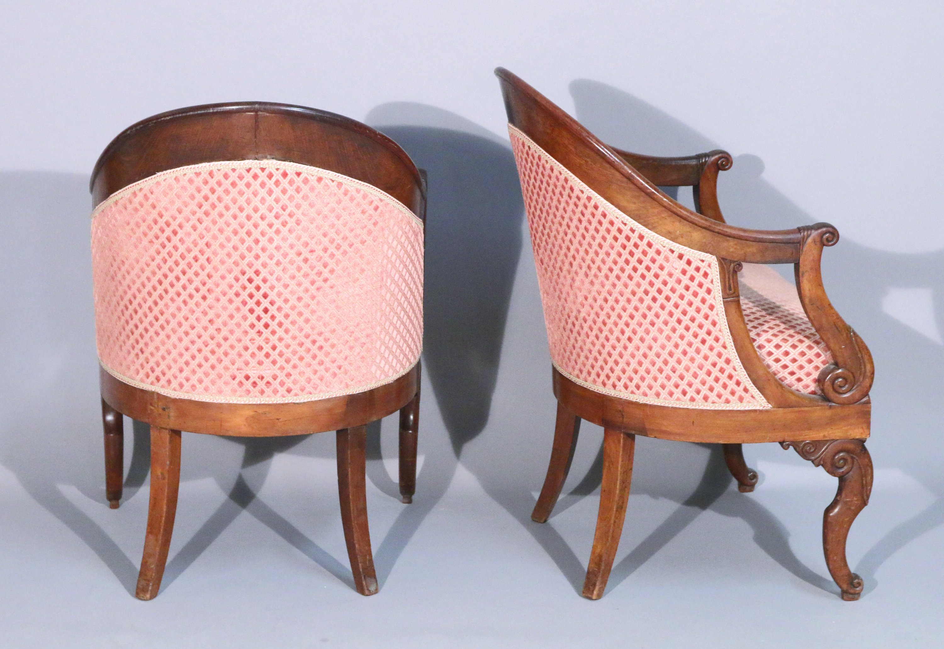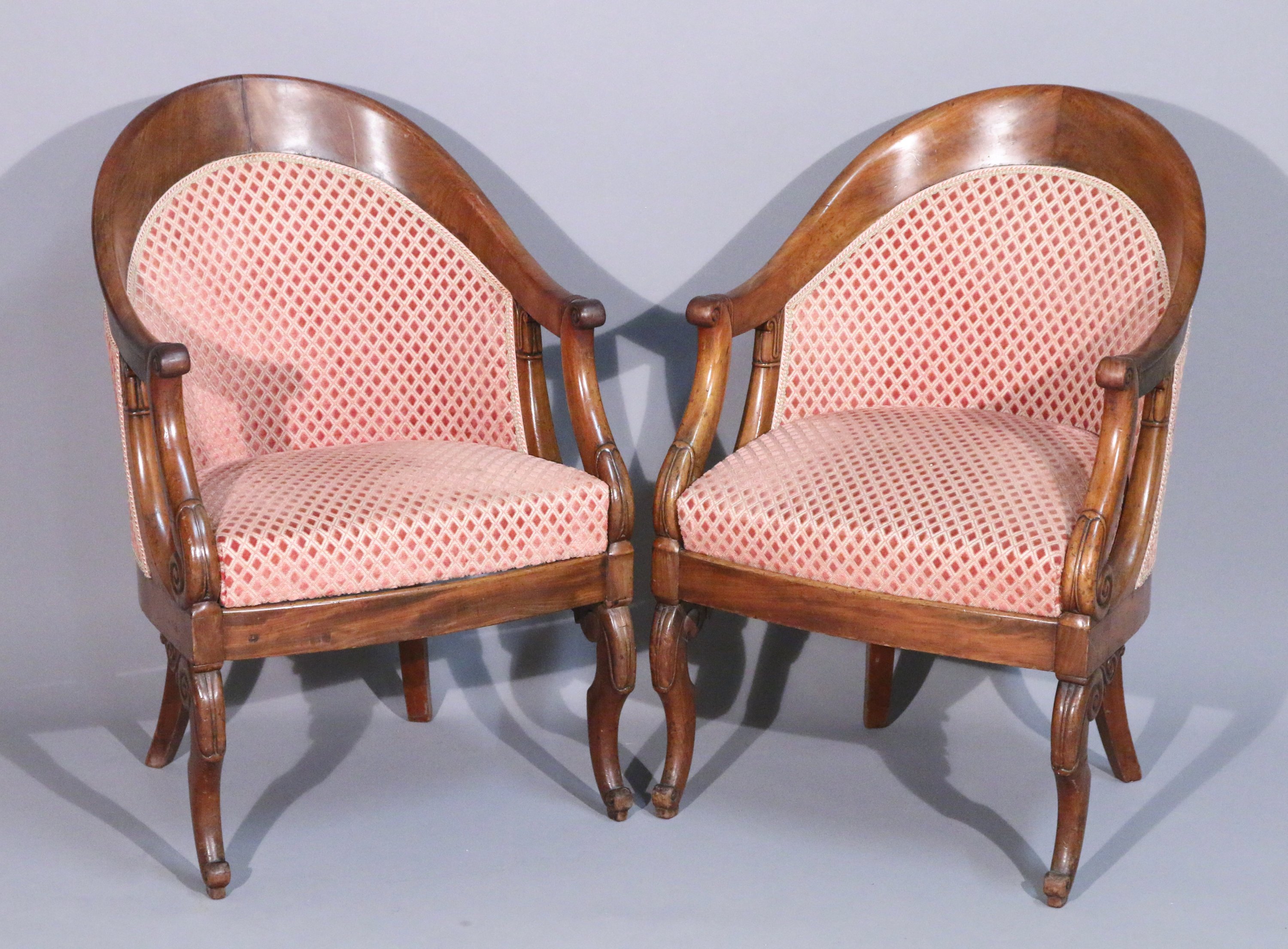 Paire de FAUTEUILS gondoles en acajou. Les montants d'accotoirs et les pieds postérieurs en jarret se répondant.