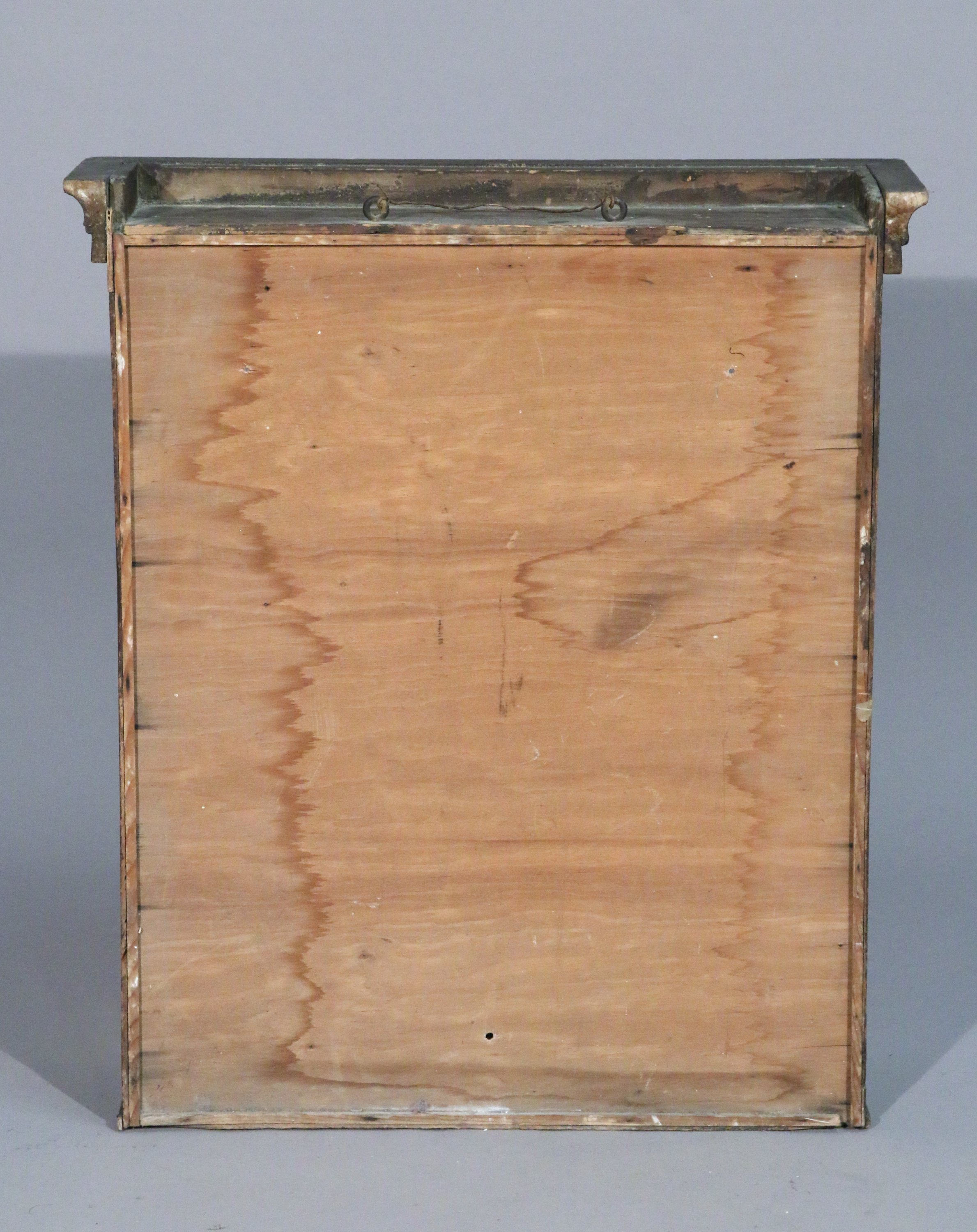 VITRINE murale en bois naturel ouvrant par une porte vitrée qui dévoile trois étagères. Elle est flanquée de piles ornées de vases couverts et rosaces sculptées.