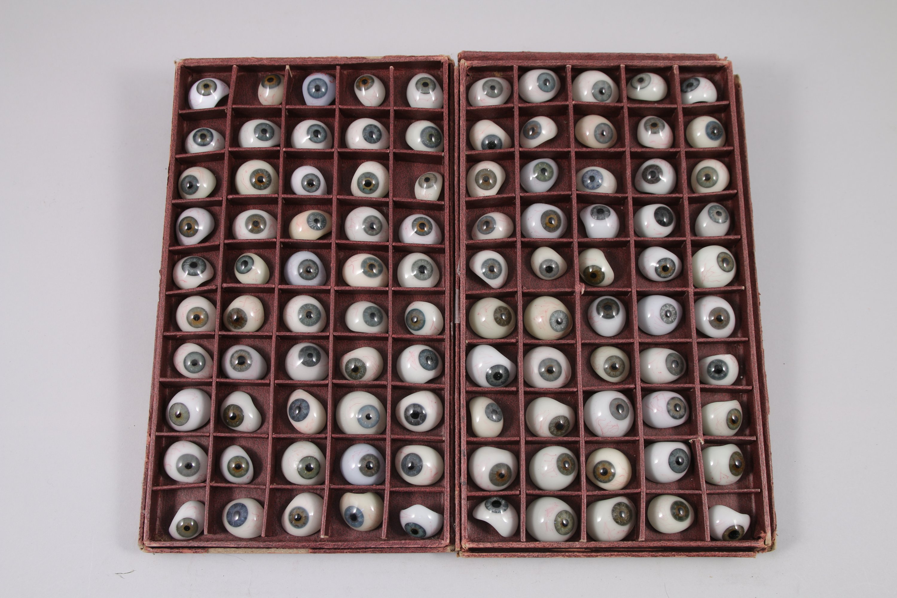 Environ une centaine de GLOBES OCULAIRES, simple ou double coque, dans un ou plusieurs coffrets gainés de chagrin. Les globes en verre teinté de différentes tailles, nuances de couleurs aux petits vaisseaux sanguins peints sur la conjonctive reproduisent l'iris grâce à des pigments de toutes teintes. Les formes des prothèses en demi-coquille sont irrégulières. Les tailles et couleurs diverses ont vocation à s'adapter aux patients ayant subi une énucléation.