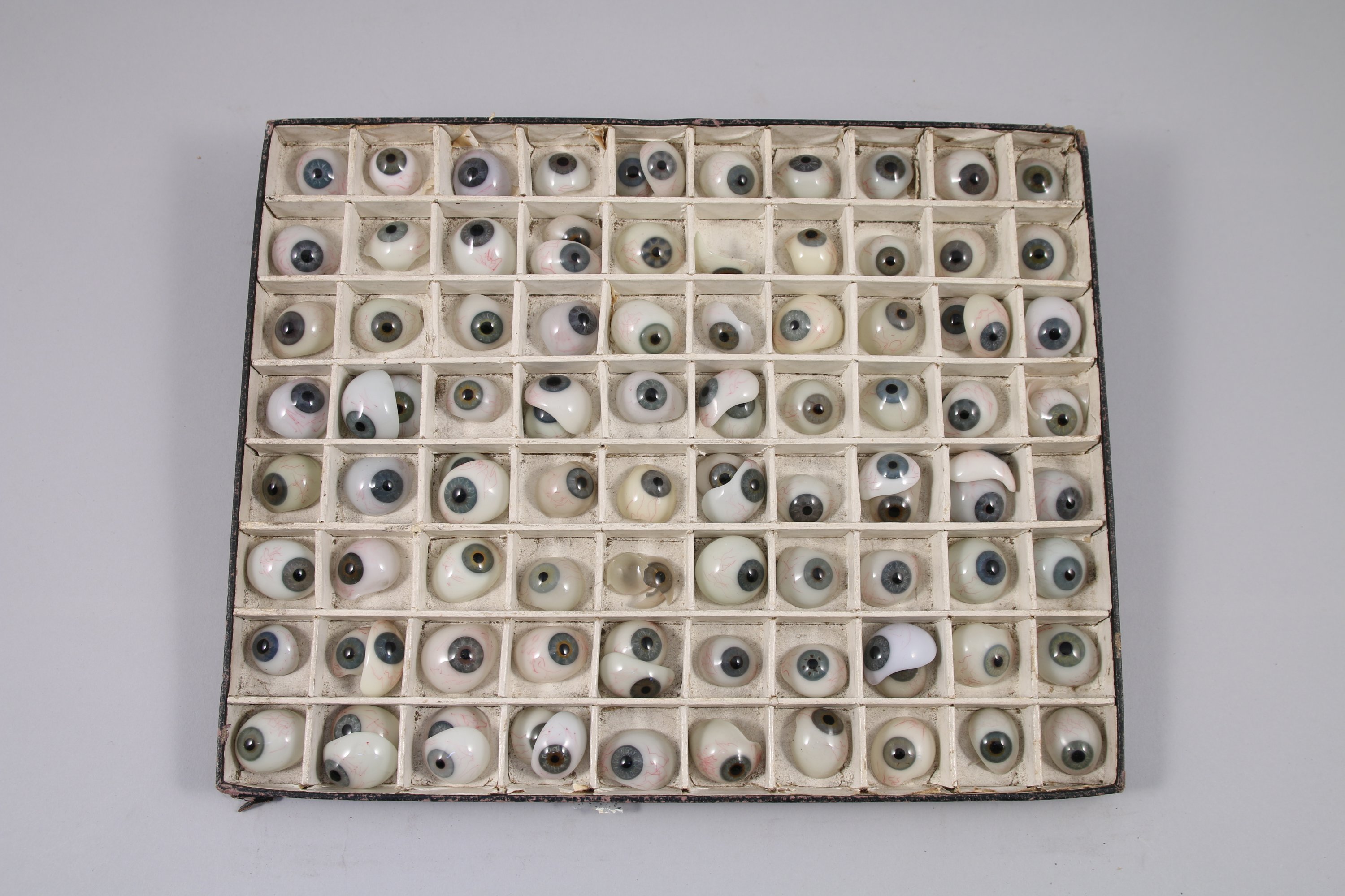 Environ une centaine de GLOBES OCULAIRES, simple ou double coque, dans un ou plusieurs coffrets gainés de chagrin. Les globes en verre teinté de différentes tailles, nuances de couleurs aux petits vaisseaux sanguins peints sur la conjonctive reproduisent l'iris grâce à des pigments de toutes teintes. Les formes des prothèses en demi-coquille sont irrégulières. Les tailles et couleurs diverses ont vocation à s'adapter aux patients ayant subi une énucléation.