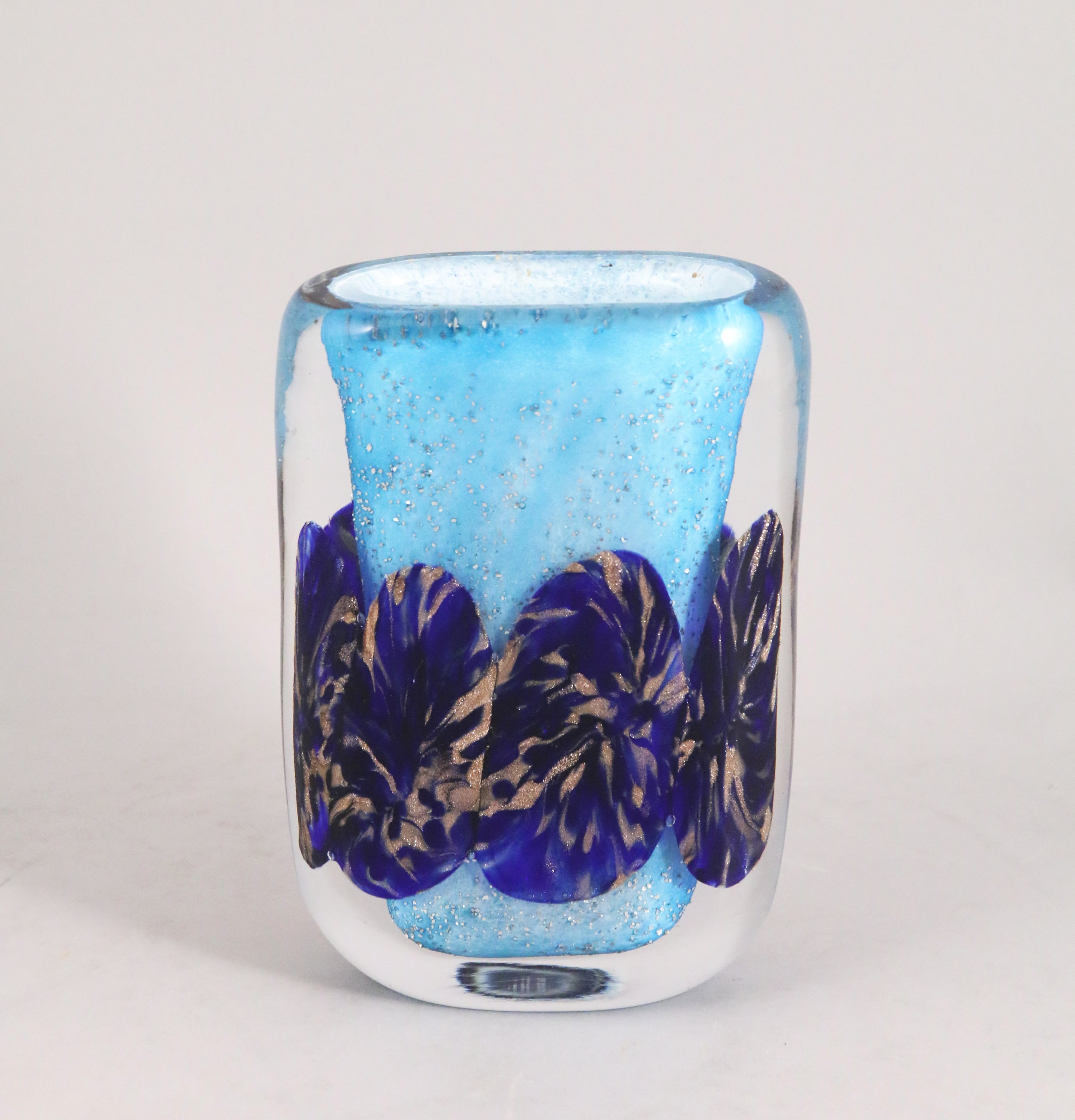 Vase méplat en verre soufflé à inclusions de paillettes d'argent et aventurine.