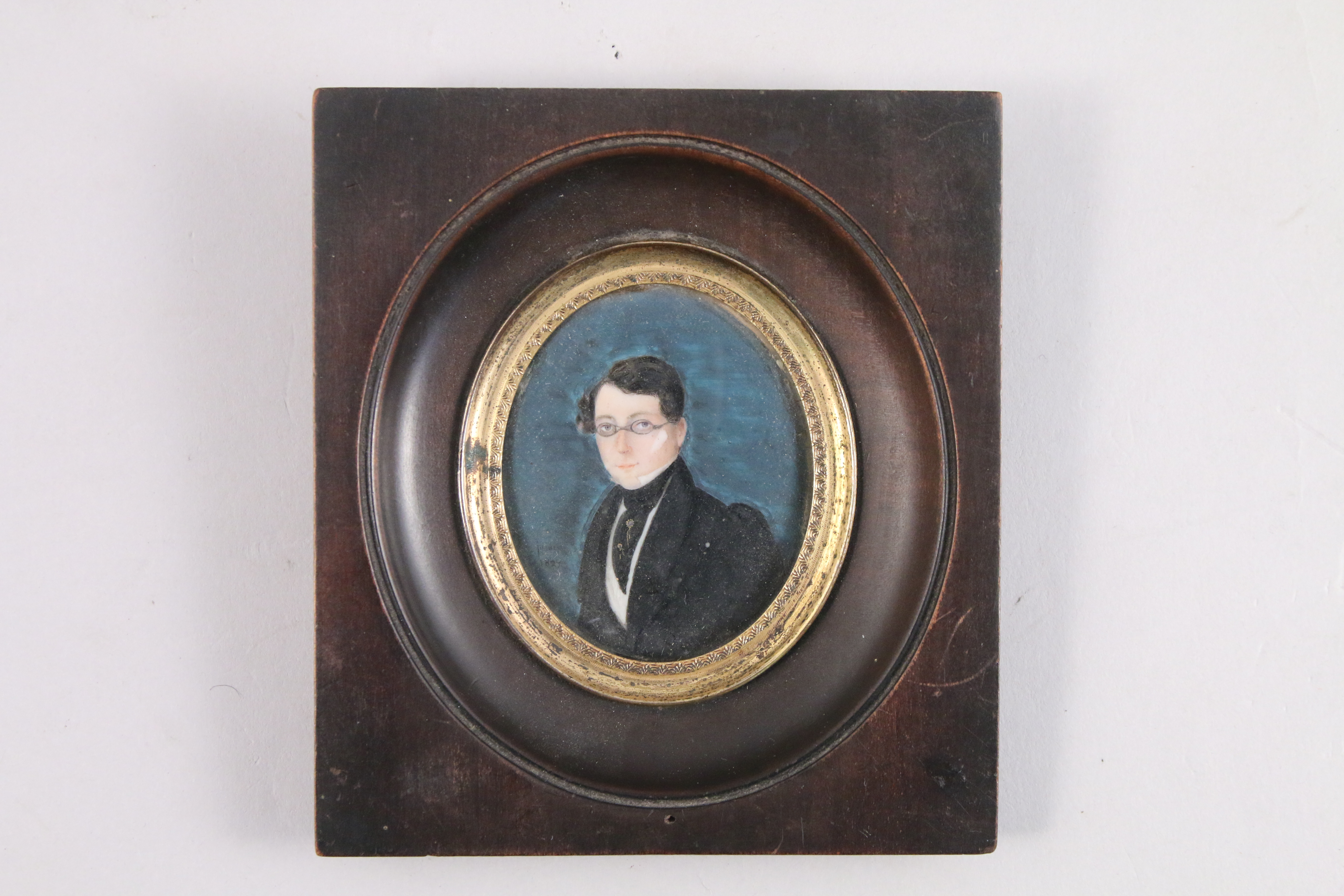 - ÉCOLE du XIXe, MINIATURE de forme ovale, gouache sur ivoire représentant le portrait d'un homme aux lunettes. Haut, 7, Larg. 5 cm.