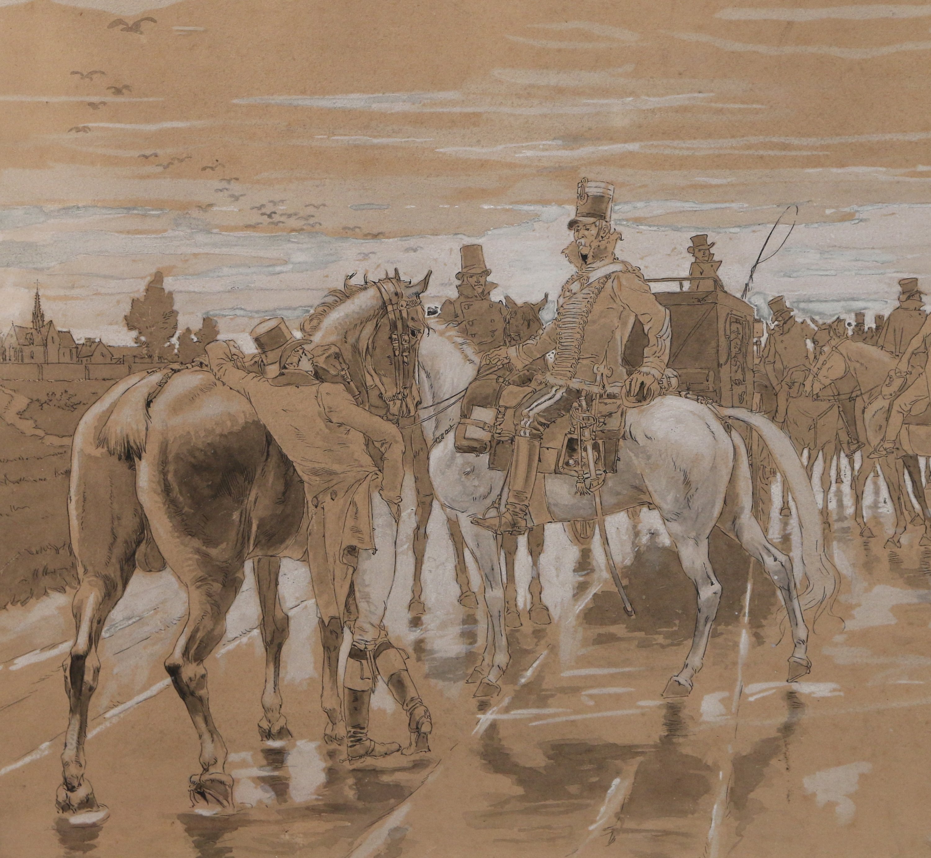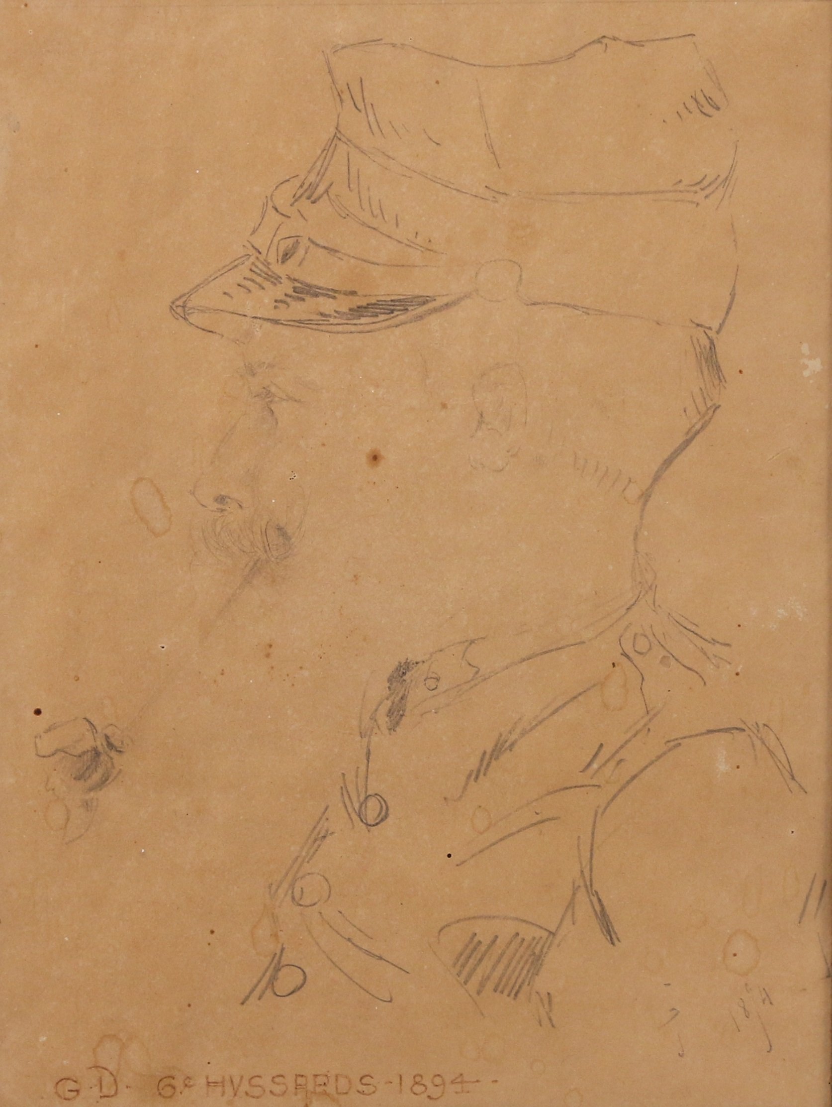 JOINT : Dessin au crayon d'un soldat du 6e Hussards, daté 1894 et monogrammé GD (22 x 16 cm).