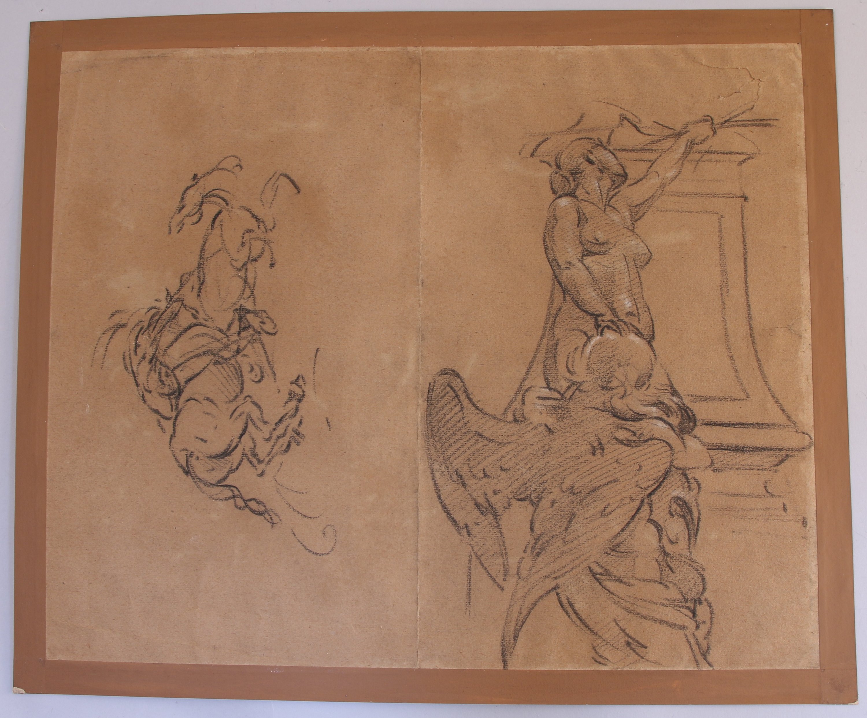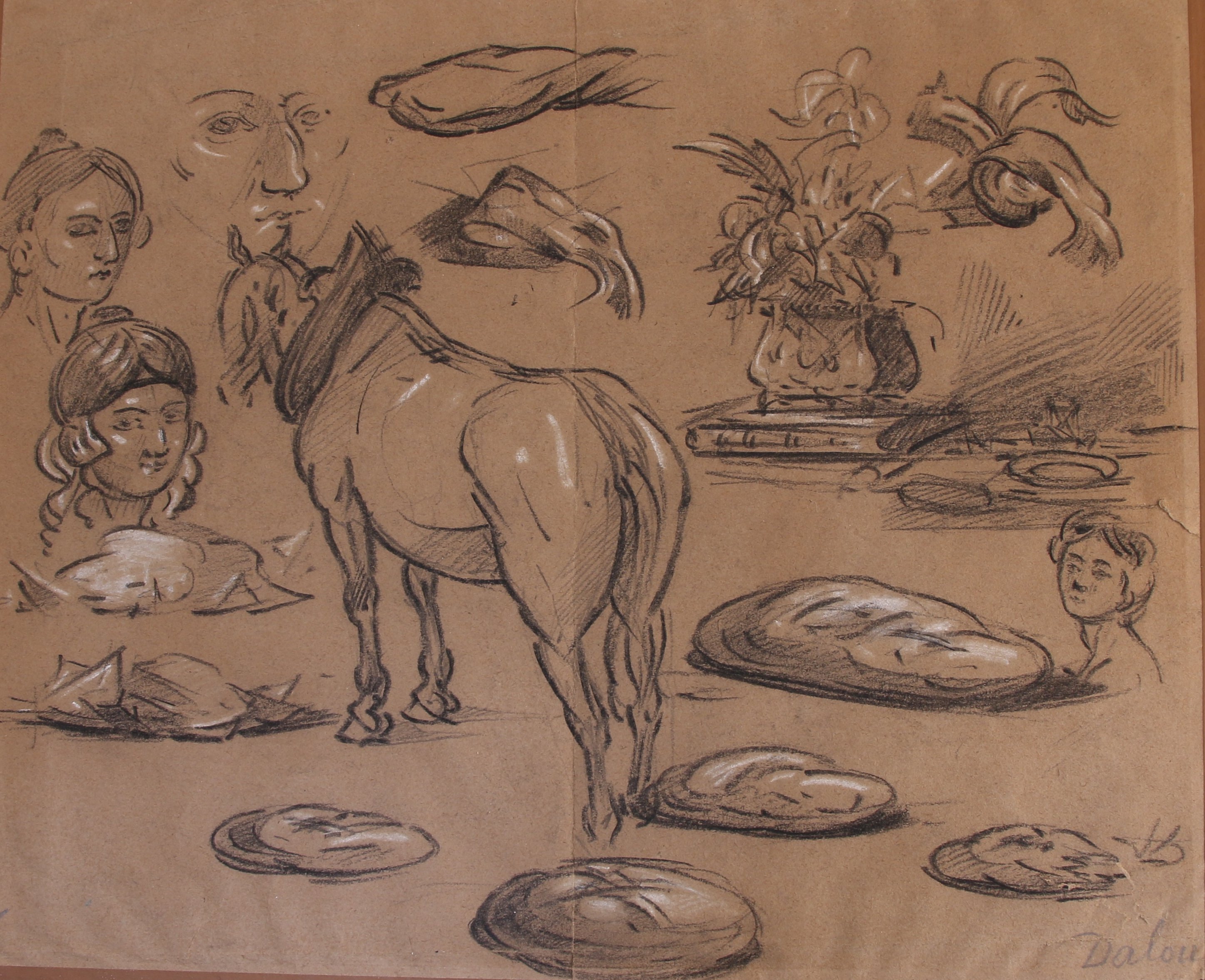 Feuille d'étude recto/verso : Chevaux, visages, bouquet de fleur, étude pour le monument d'Eugène Delacroix.
