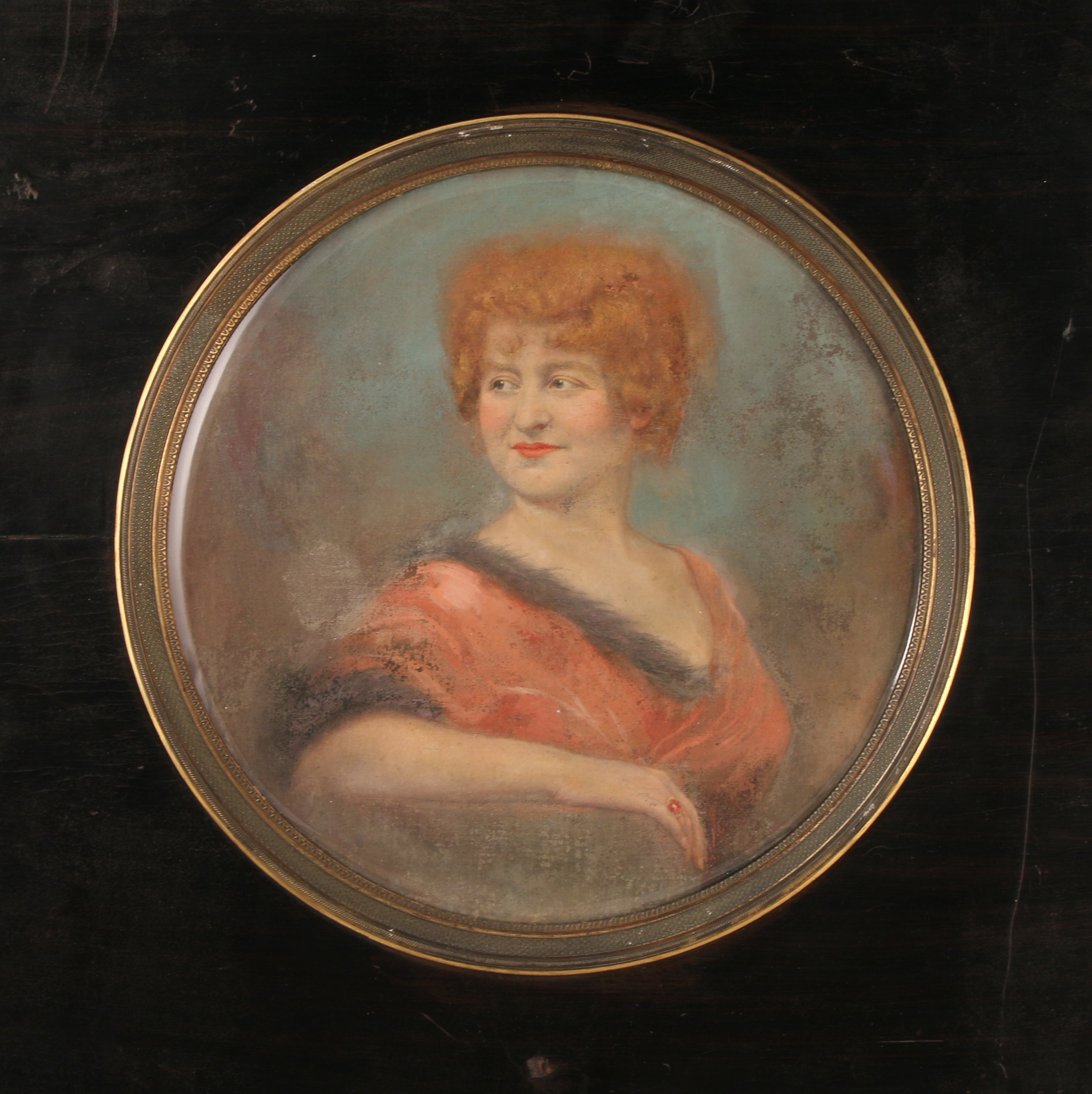JOINT : Deux portraits de femme en miniature, dont l'une la femme au rubis. crayon signée DELAPERCHE, Haut. 6, 7 cm.